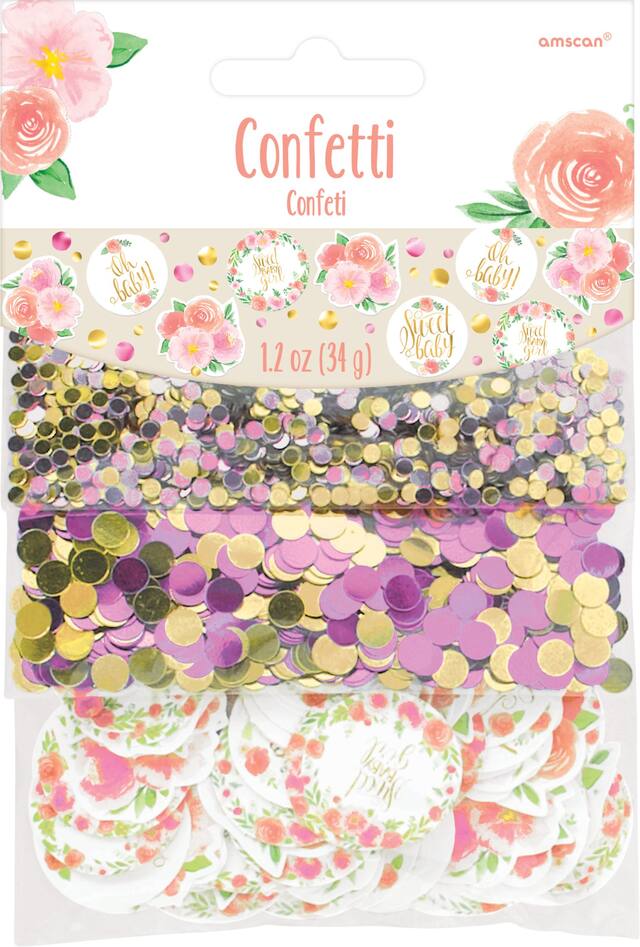 Floral confetti perfect for adding a little shine to your baby celebration. The cardstock and foil cutouts in metallic pink circles and flower shapes provide a decorative touch when sprinkled on tables for a baby shower or in invitation envelopes. Make your party glow with the help of this shimmering confetti.