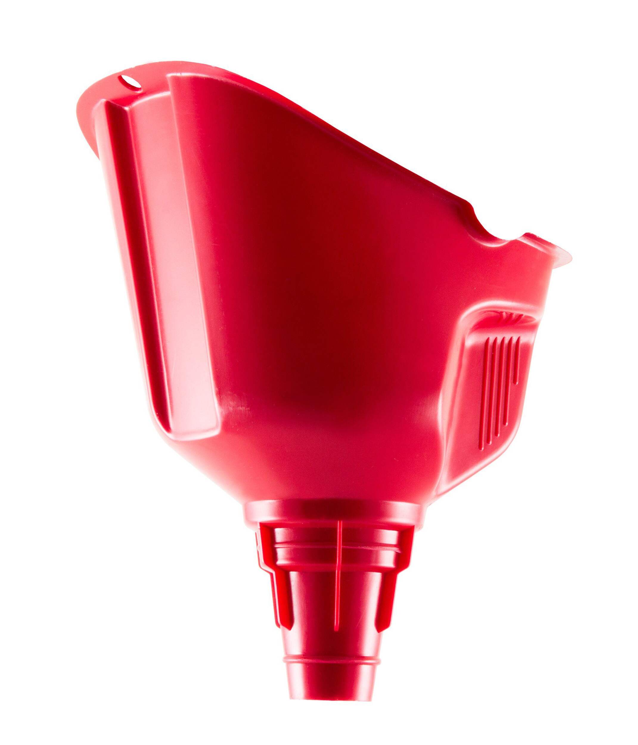 Super quickfill funnel holds 1 quart of fluid for hands free pouring, features a no-mess splash guard and built-in hand hold for a better grip, and has a wide spout opening for fast flow