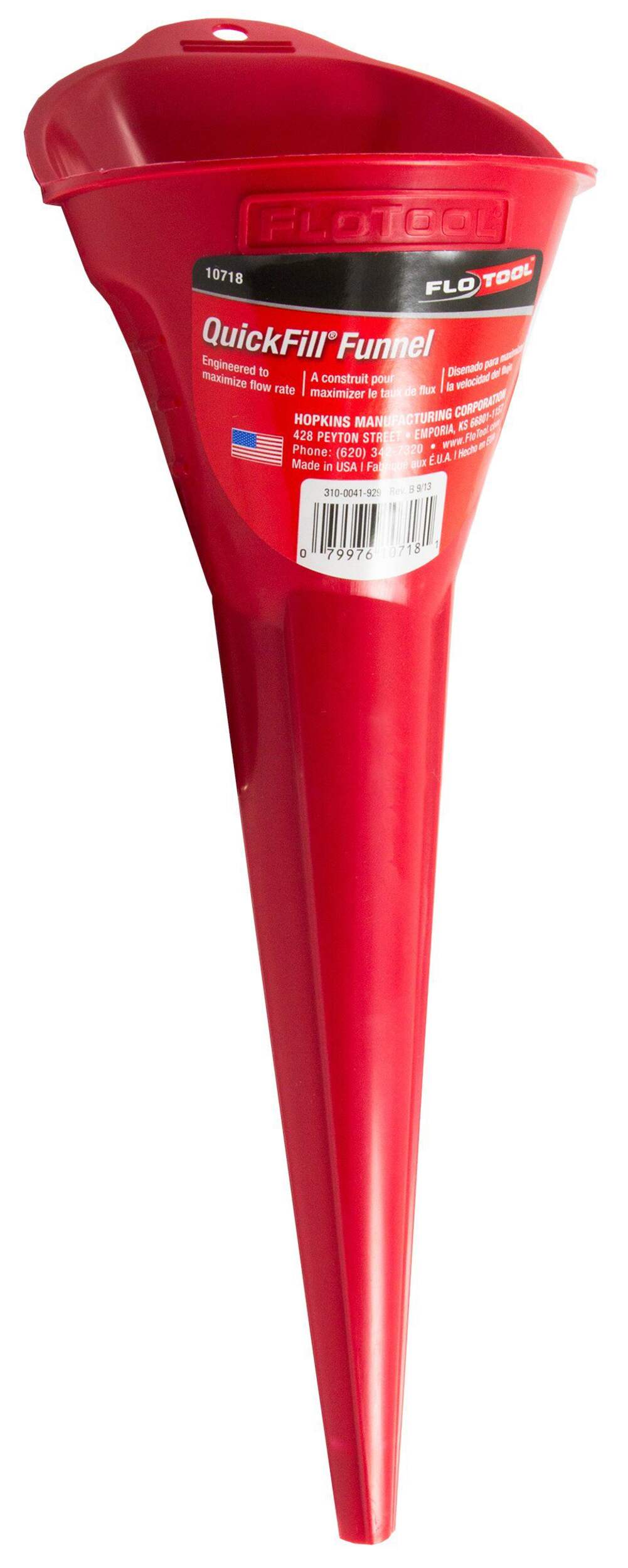 Quick fill funnel has a long and narrow speed channel to maximize flow rate, features a no-mess splash guard and a small spout that fits most filler tubes