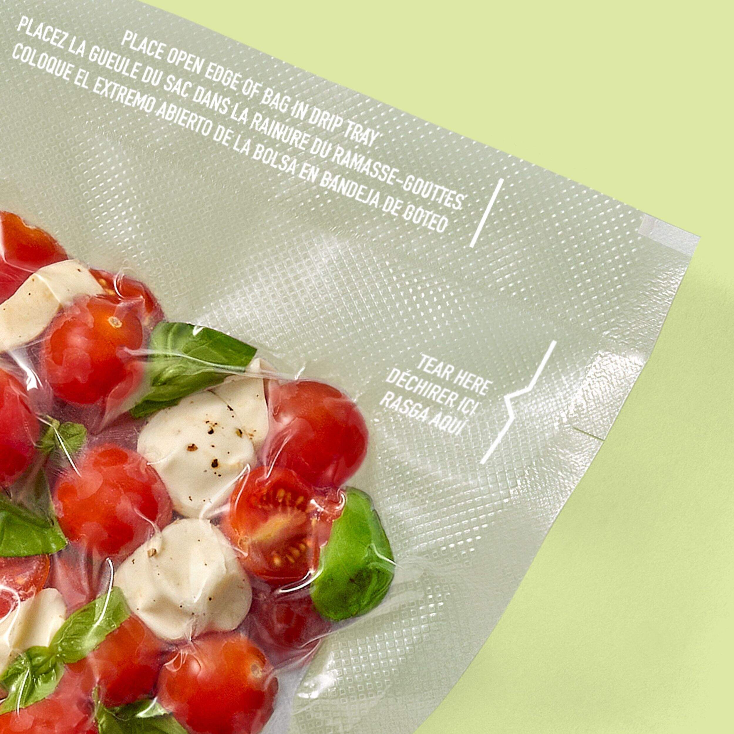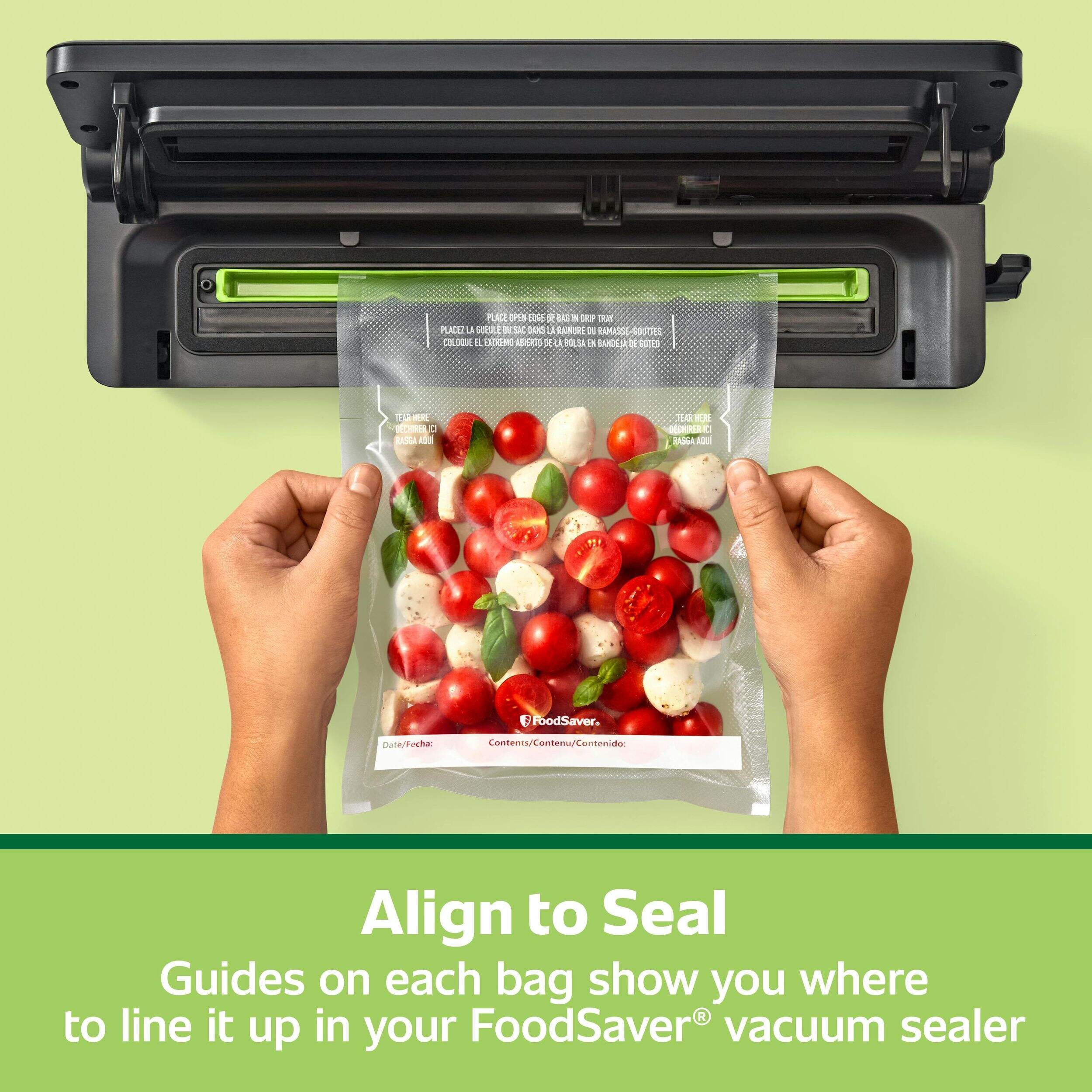 Make meal prep quicker and easier than ever before with FoodSaver pre-cut bags featuring Easy Use design. The alignment guide shows you exactly where to place the bag in the machine, ensuring a perfect, 100% leakproof seal for your vacuum storage bags every time. And there’s no need for knives or scissors: Tear-to-open notches are on the side of each bag, giving you easy access to your prime cuts of meat, fresh veggies, and more vacuum-sealed foods you’ve chosen to preserve. Multi-layer protection helps prevent freezer burn, too, as the pre-cut bags keep food fresh up to 5x longer (compared to ordinary storage methods). Whether you're looking to meal prep or seal up leftovers for later, the bags are safe for microwaving and sous vide cooking when you're ready to cook. These vacuum sealer bags for food are compatible with all FoodSaver appliances, excluding handheld vacuum sealer models. FoodSaver pre-cut bags make it easier than ever to keep the foods you love fresher longer: Simply align to seal and tear to open.