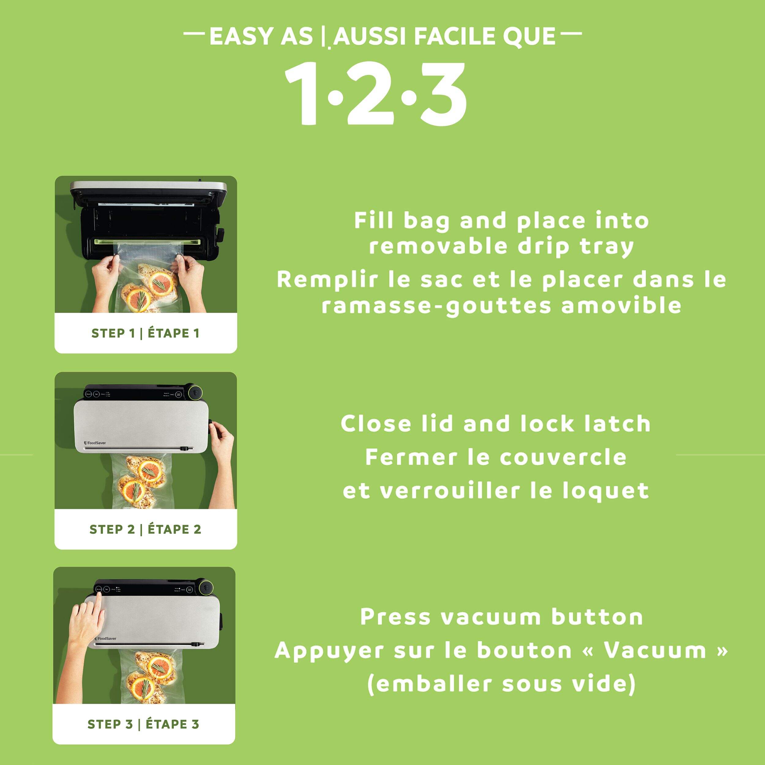 Simply press vacuum button to remove air and seal, and LED light indicates sealing is complete
