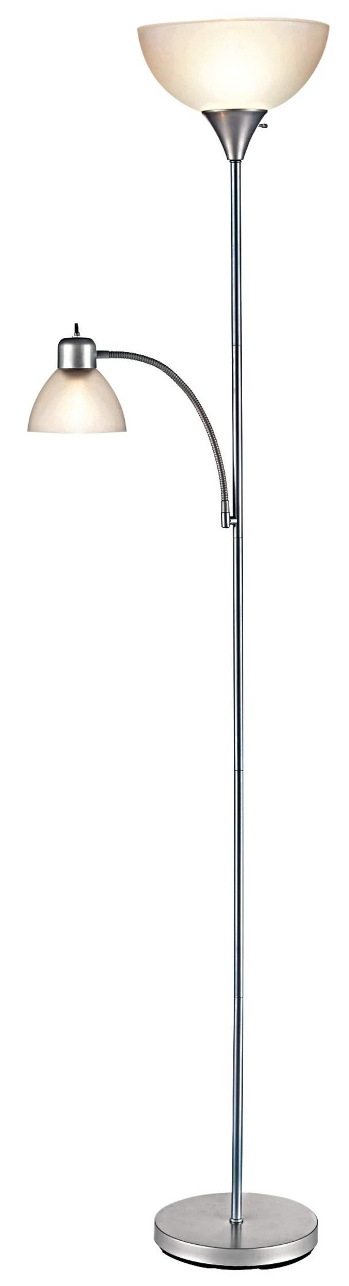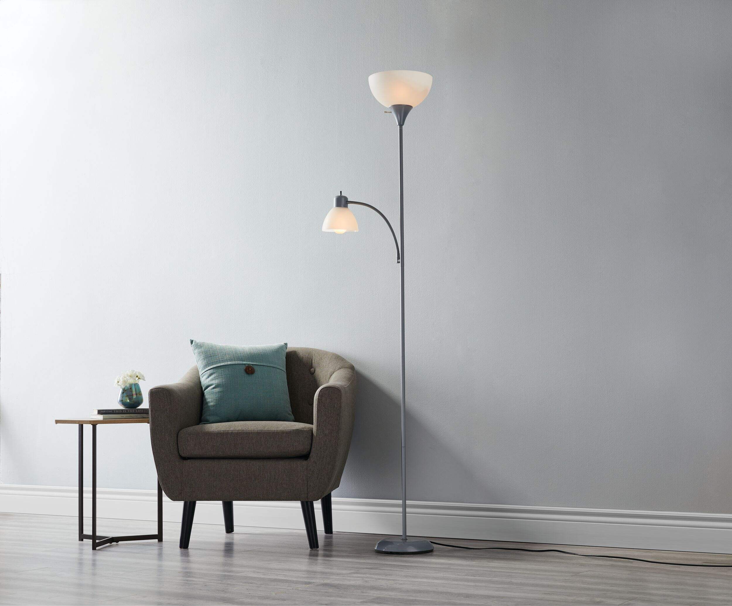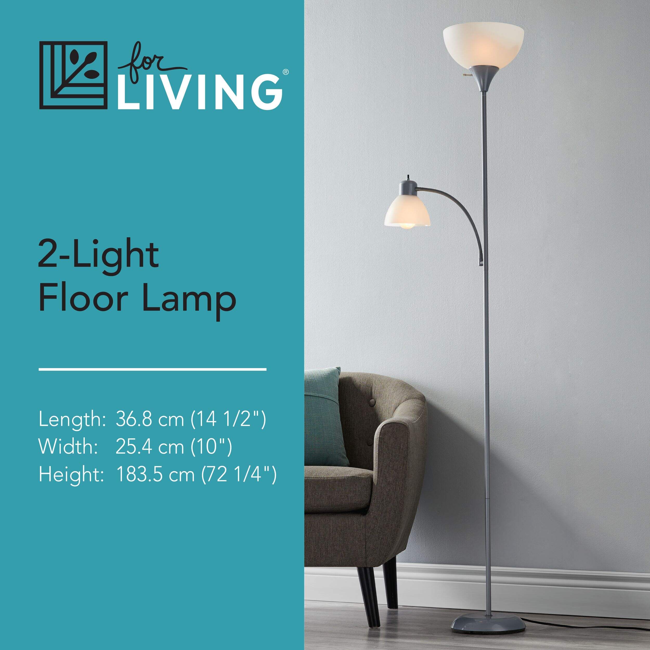 Instantly illuminate any space with help from the For Living 2-Light Floor Lamp. Its sleek, contemporary design and brushed steel finish add a modern touch to any room. The frosted plastic shades soften the light, providing a warm, even glow without the glare of exposed bulbs. Perfect for brightening up a room or a reading nook, this versatile For Living light is as functional as it is fashionable.