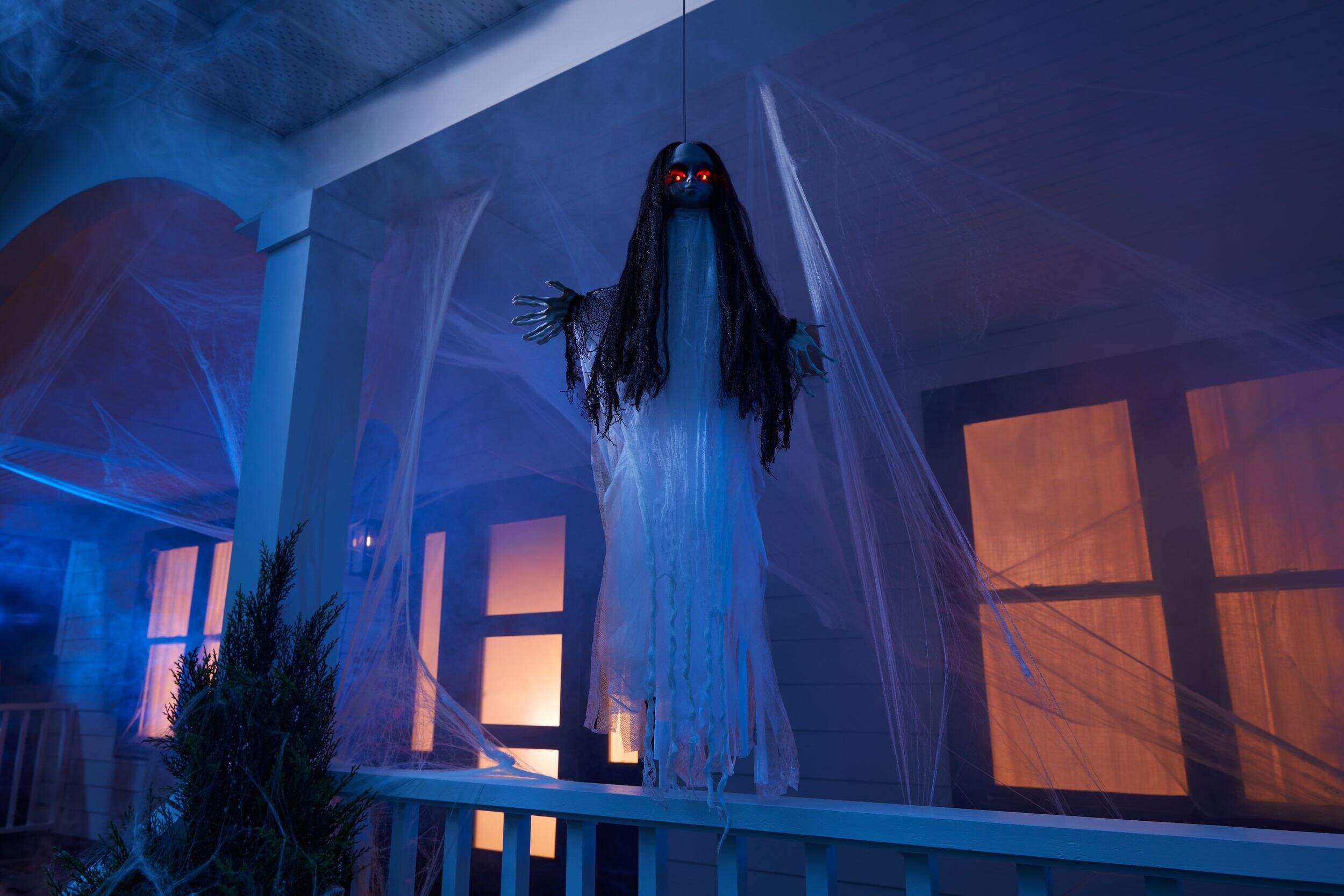 The For Living Animated Hanging Girl Halloween Decoration is a hair-raising addition for indoor Halloween festivities. At 36 inches tall, this indoor-only ghastly decoration features posable arms and light-up eyes that activate with sound, her arm moving in jerky motions to terrify guests.