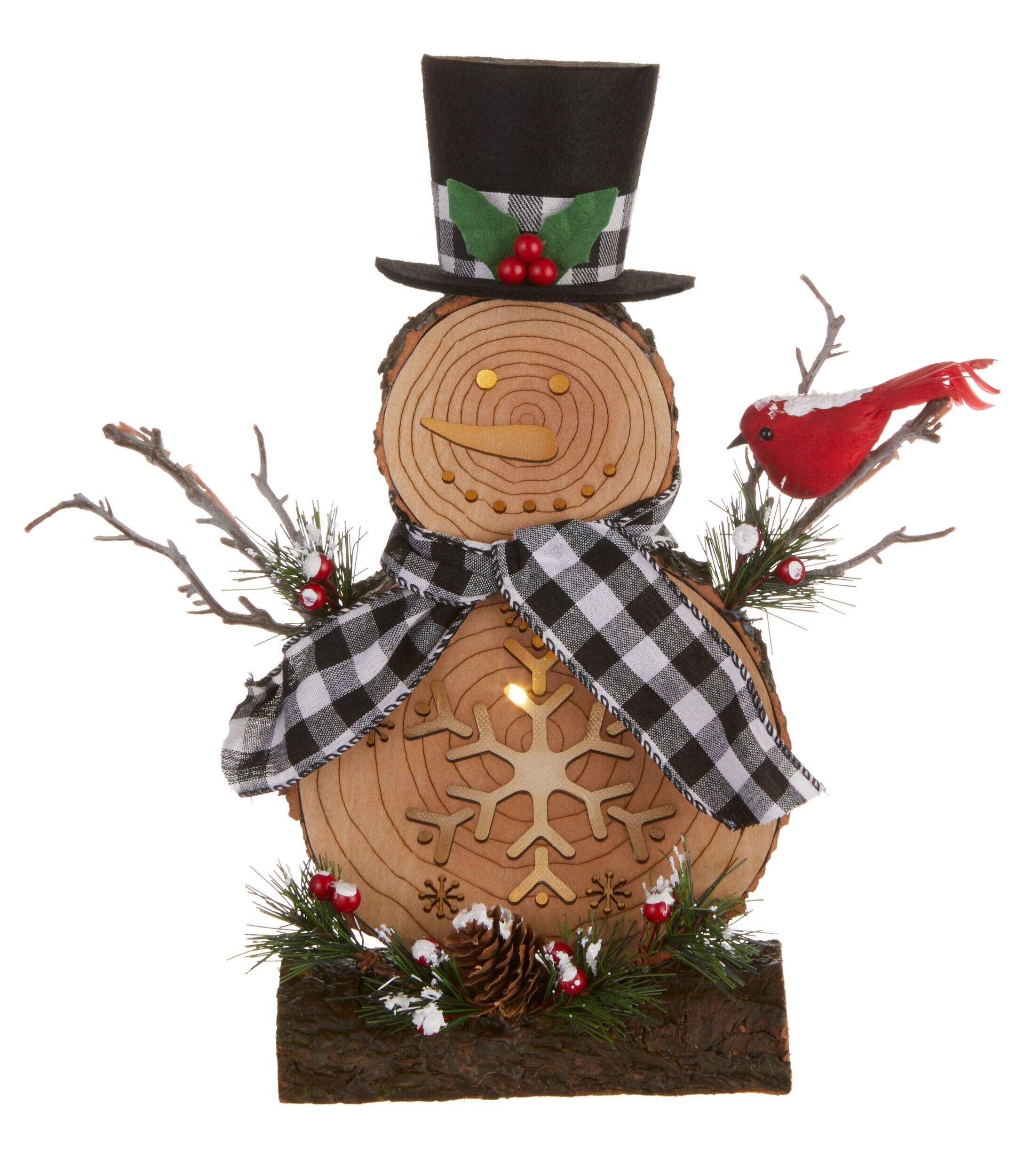 This tabletop snowman from For Living makes an enchanting Christmas decoration. The 12-inch snowman decoration is crafted from faux wood material, suitable for indoor use. Its whimsical snowman face and attached wooden snowflake are pre-lit, lending a festive glow when illuminated. The table top snowman's combination of rustic wood design and twinkling lights provides the ideal Christmas decoration for mantels, shelves, or tabletops around your home.