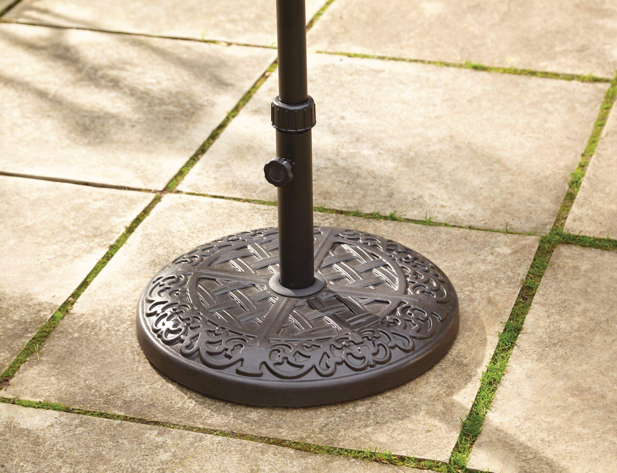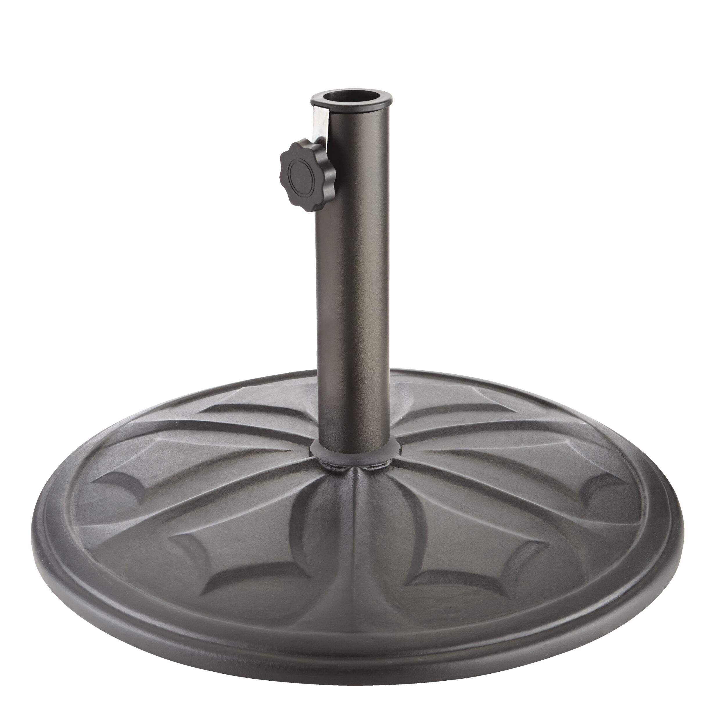 With a heavy-duty, weighted design, the For Living Concrete Patio Umbrella Base is designed for absolute stability and durability in outdoor environments. This 40-pound umbrella stand is constructed with all-weather concrete made to withstand harsh outdoor conditions and prevent cracks and breakages. The easy-to-assemble design ensures you will have your patio umbrella stand set up in just a few minutes.