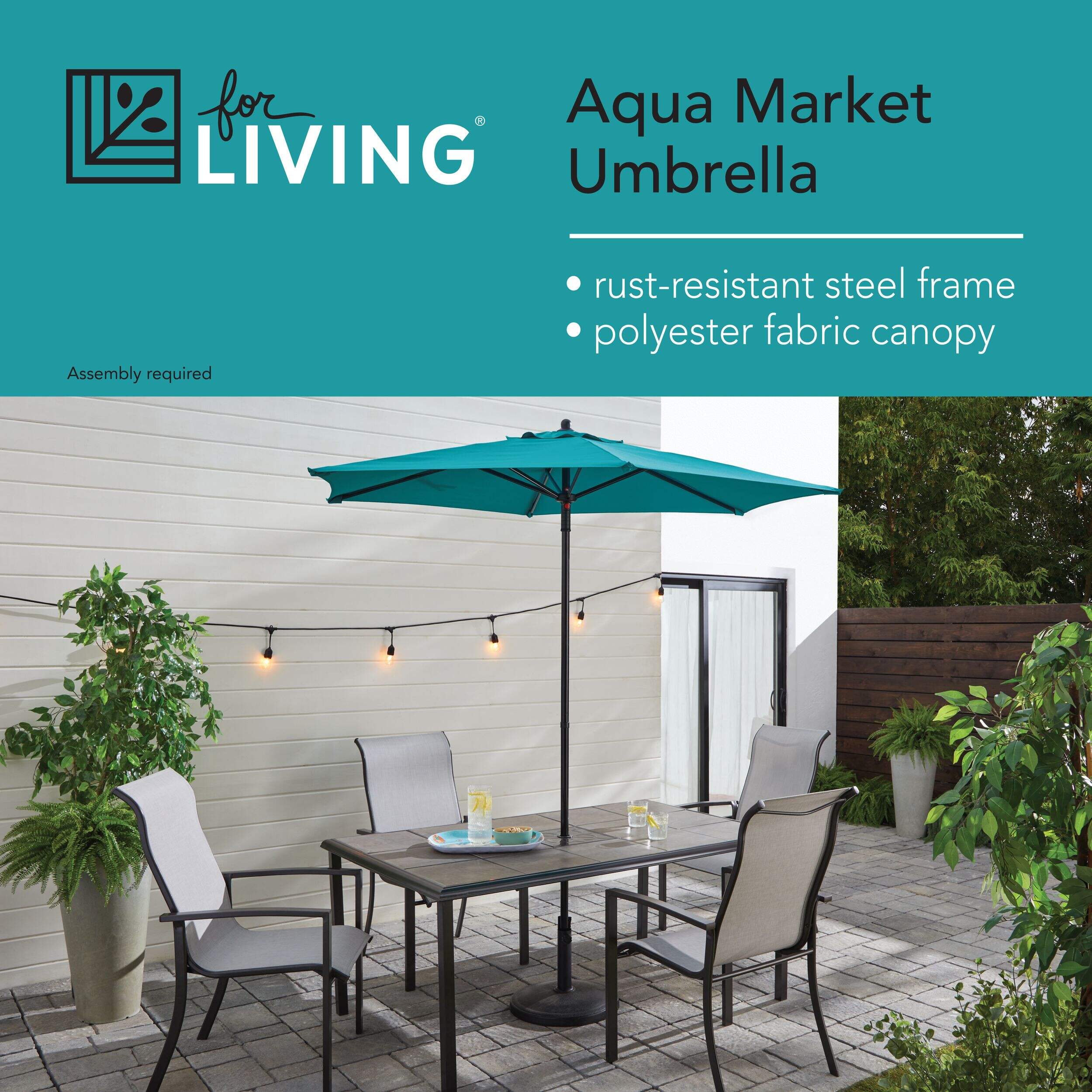 Elevate your outdoor living space with the FOR LIVING Fabric Patio Umbrella. This patio umbrella features a rust-resistant steel frame and polyester canopy that opens and closes easily with a push lift mechanism. With a spacious 8-ft diameter coverage and height of 86 1/2", this vibrant garden umbrella provides ample shade and style.