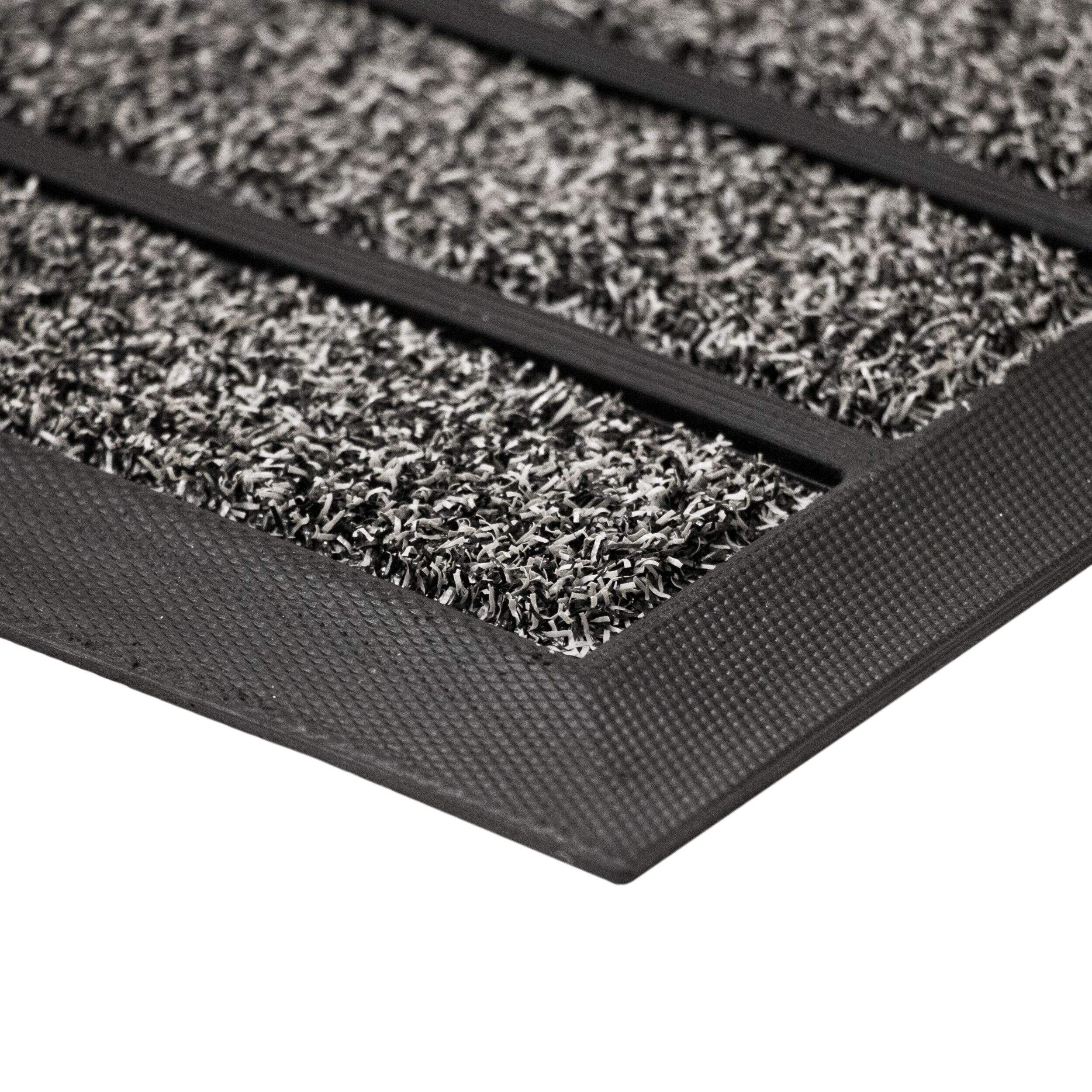 Manufactured with durable polypropylene that will not shed, this For Living Faux Coir Ribbed Door Mat helps you keep your floors clean and protected. The ribbed entry mat easily scrapes away dirt and debris from footwear and its rubber backing grips surfaces to minimize slippage. This versatile and durable black and grey 18" x 30" door mat is a functional addition to any entranceway or workspace in your home or office.
