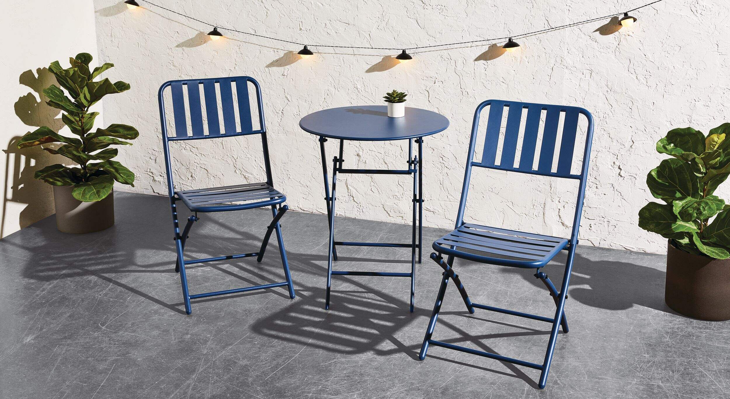 Complete your set with other pieces from the For Living Finch Collection (each sold separately): Grey sling chair (1881340), Grey metal chair (1881341), Blue circular table (1881342), Grey slat table (1881343), Blue metal chair (1881344), Blue lattice chair (1881345)