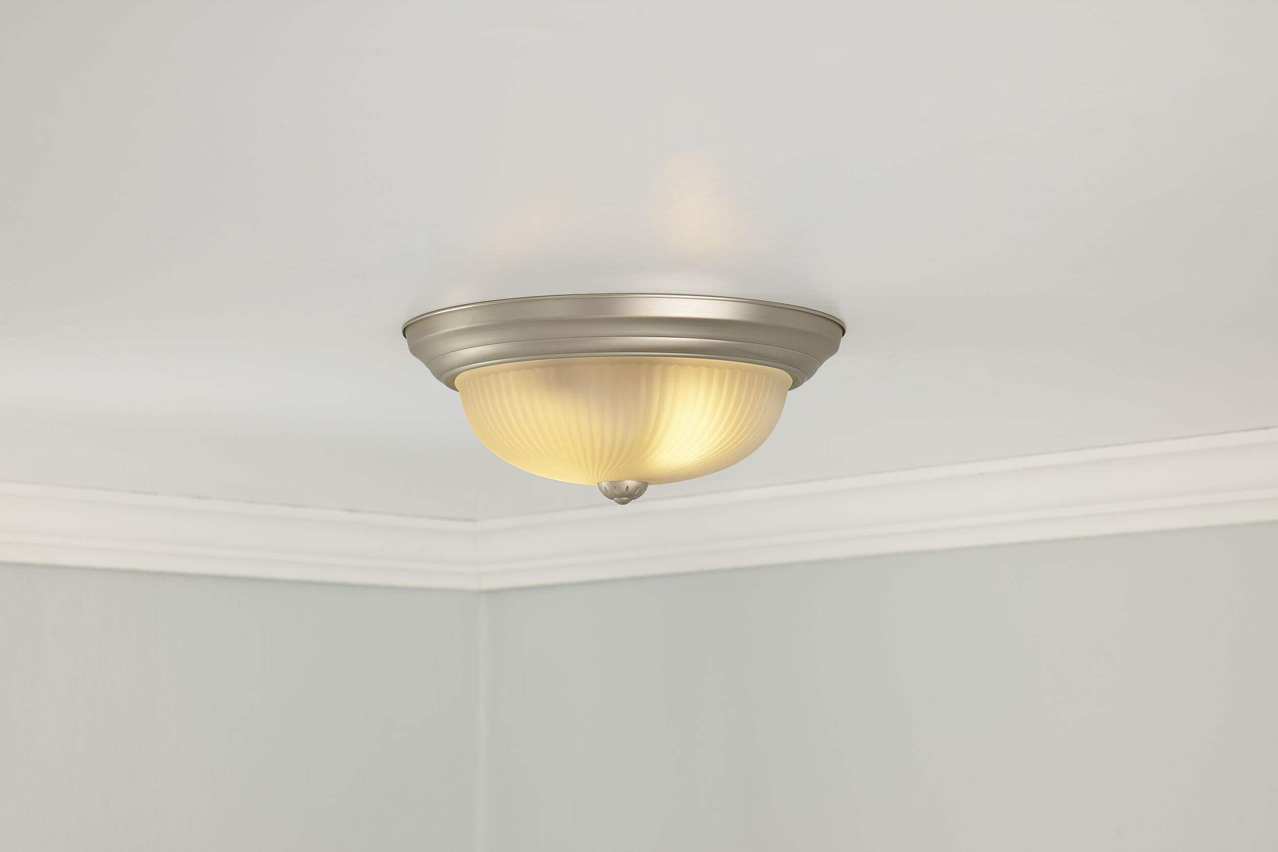 Add some striking new lighting to your home with this For Living Flush Mount Light. This incandescent flush mount light has a clean, classic design with a frosted swirled glass shade and brushed pewter finish. The indoor flush mount light looks great in any room of the house and the low-profile, modern style effortlessly complements any decor. This sleek 60W flush mounted light uses 52-5472 (incandescent) and 52-5391 (CFL) replacement bulbs and measures 13" W x 4.7" H.