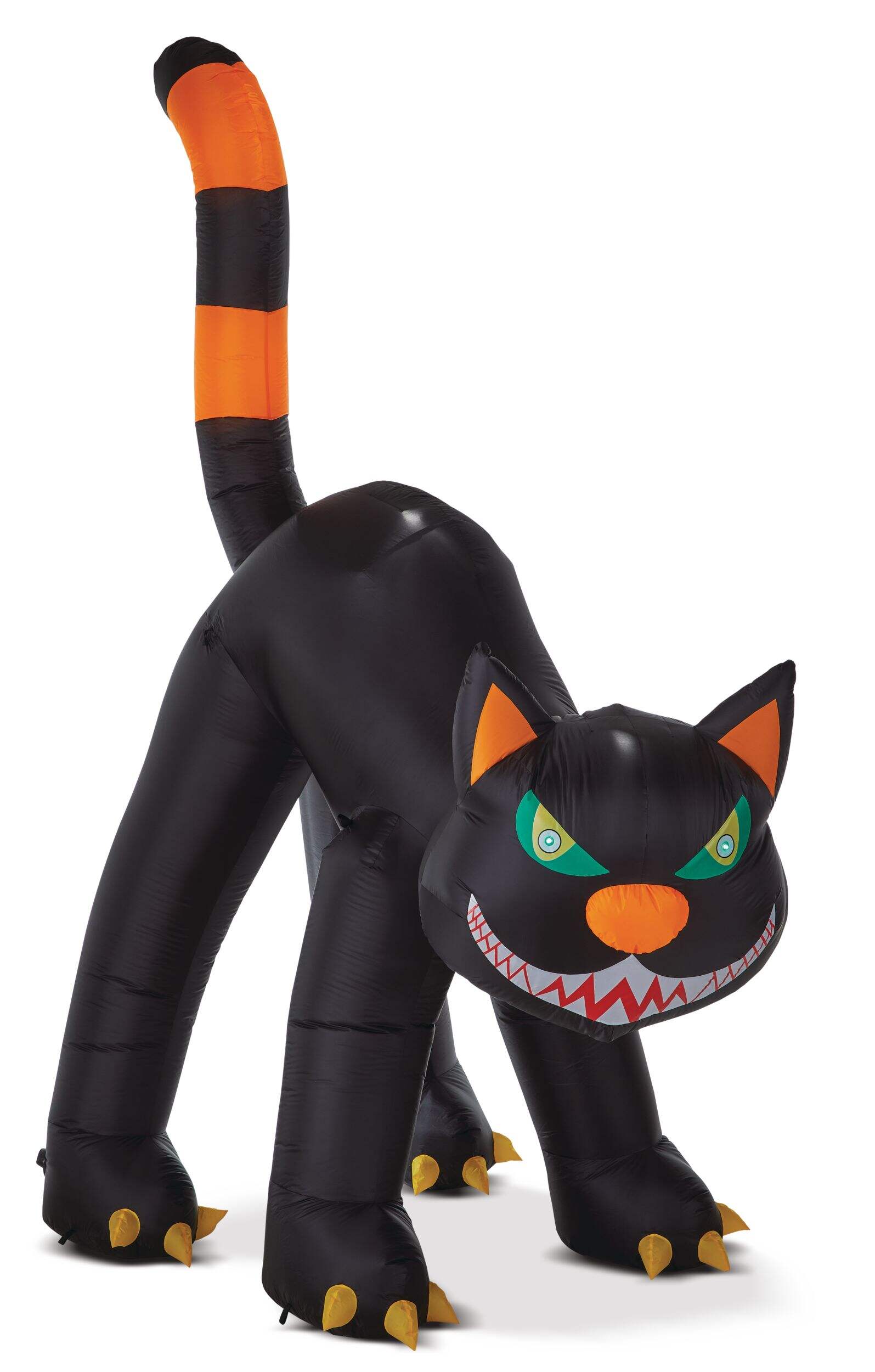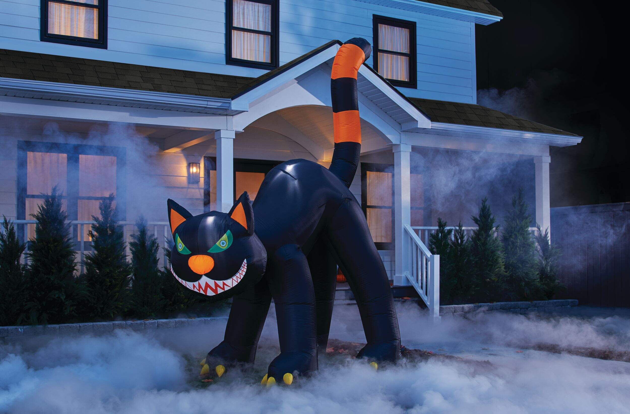 Create a spooky atmosphere this Halloween with the For Living Indoor/Outdoor Inflatable Black Cat. This animated decoration features striking green eyes, orange accents, and a menacing mouth full of teeth, making it a perfect addition to your festive setup. Ideal for both indoor and outdoor use, it will surely catch the attention of all trick-or-treaters.