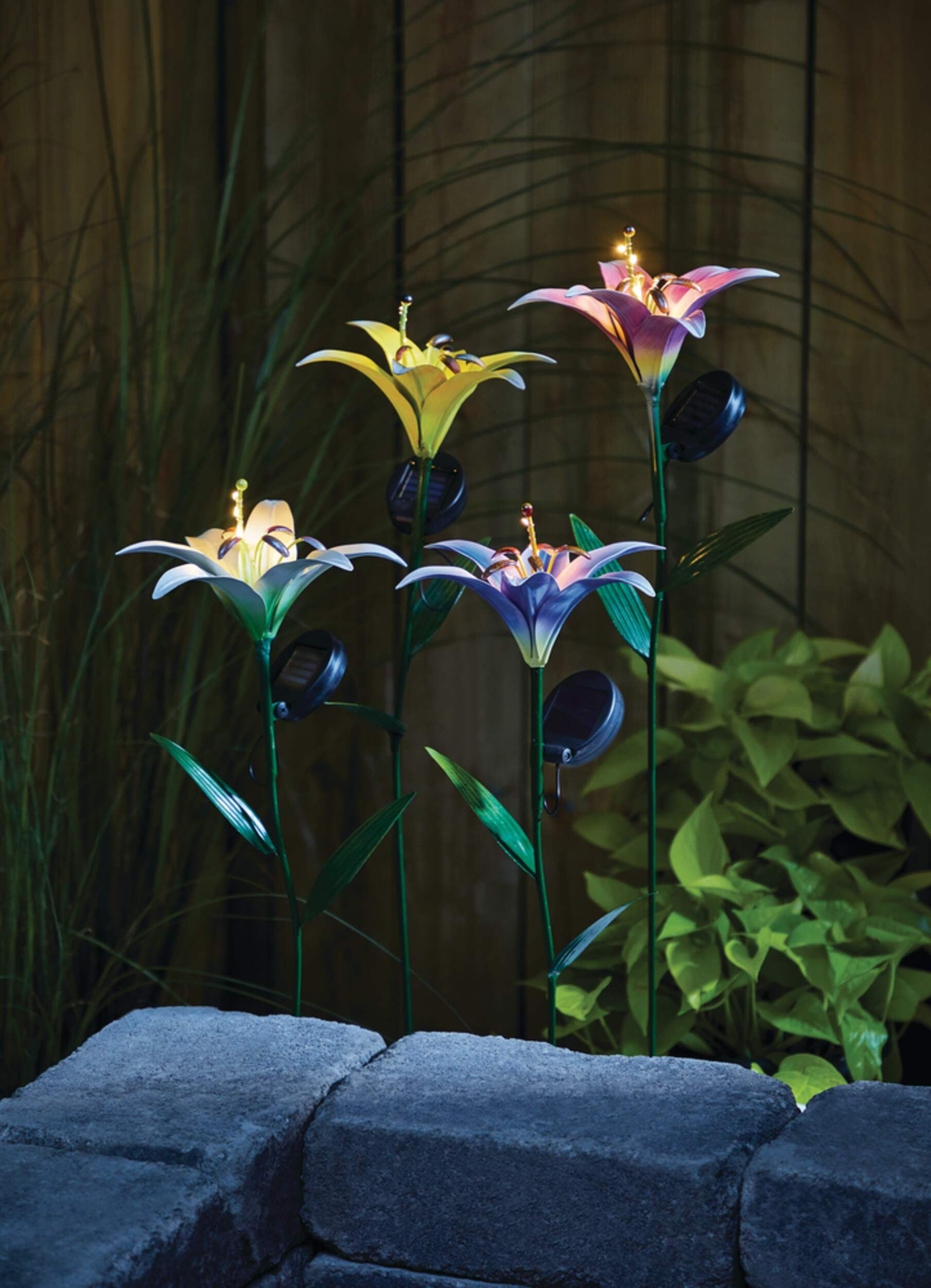 The For Living Lily Garden Stake with MicroDot LEDs has a stylish look and a warm glow to brighten up your walkway or garden