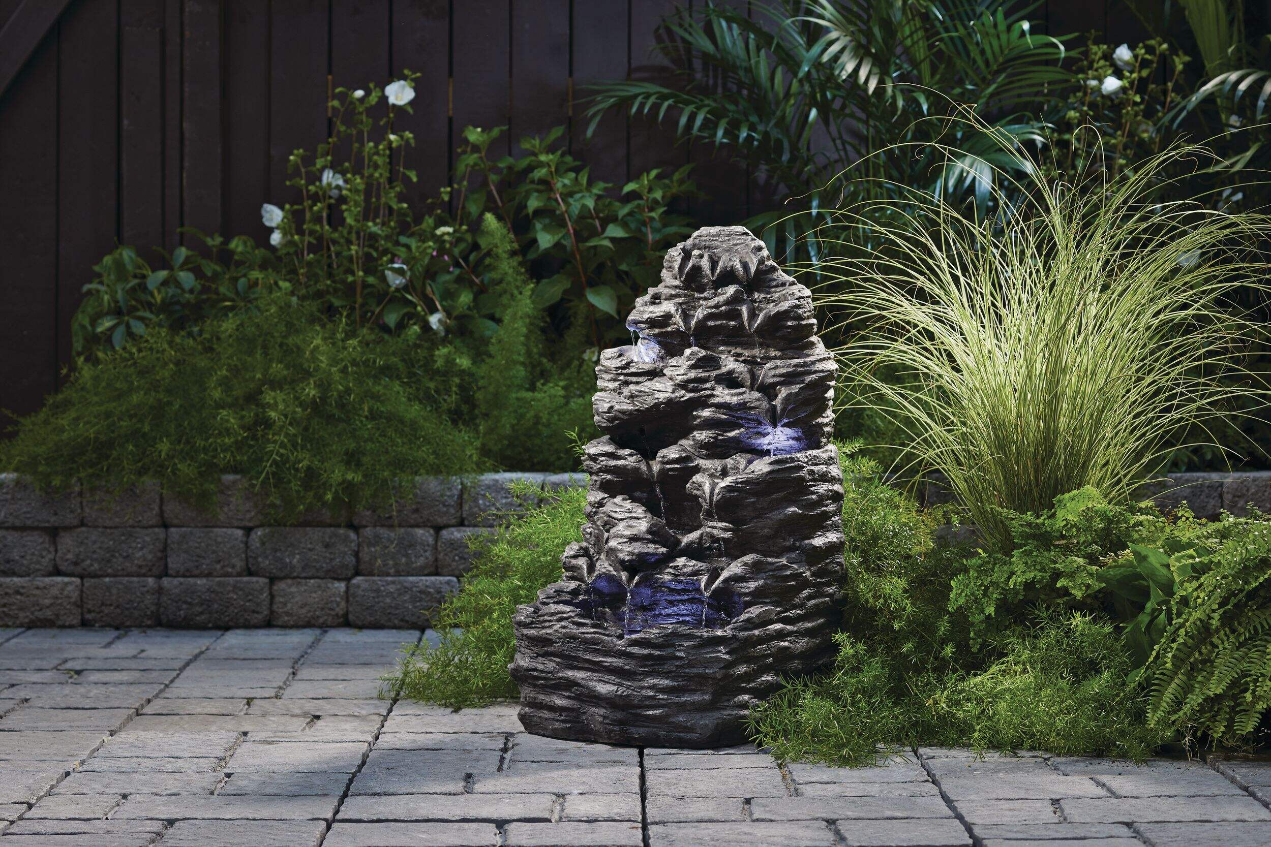 Transform your backyard or outdoor space into your own personal oasis with the For Living Outdoor Rock Fountain with Pump. This outdoor rock fountain is constructed using glass fiber reinforced concrete, providing exceptional durability to ensure the rock fountain can withstand the elements throughout the spring, summer and fall months. The decorative rock waterfall includes a built-in pump that moves water up to the top of the feature before trickling down like a waterfall. The decorative rock fountain also features three built-in LED lights, illuminating the feature at night so you can enjoy the calming waterfall aesthetic at any time. The trickling sound is reminiscent of a real waterfall or creek, adding a natural look and soothing sound to your backyard. Whether you are entertaining guests on your back patio or simply enjoying a quiet evening in your own garden, this rock waterfall will surely add a pleasant ambiance to your space. It measures approximately 31-inches tall by 16-inches wide and 16.5-inches deep, making it an eye-catching piece that will stand out in your backyard or garden.