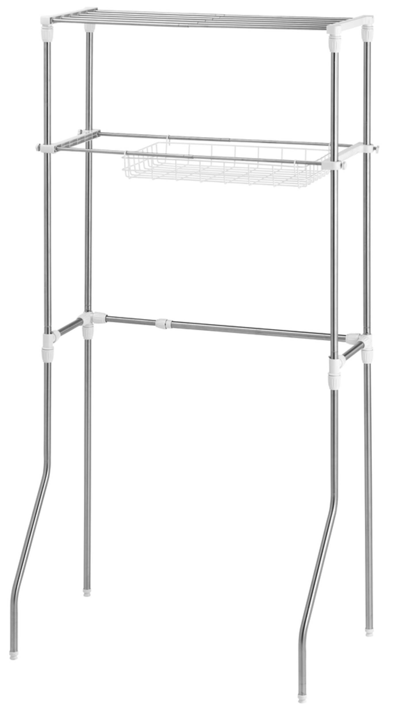 Over the Machine Rack has a sturdy metal frame with a stainless steel finish