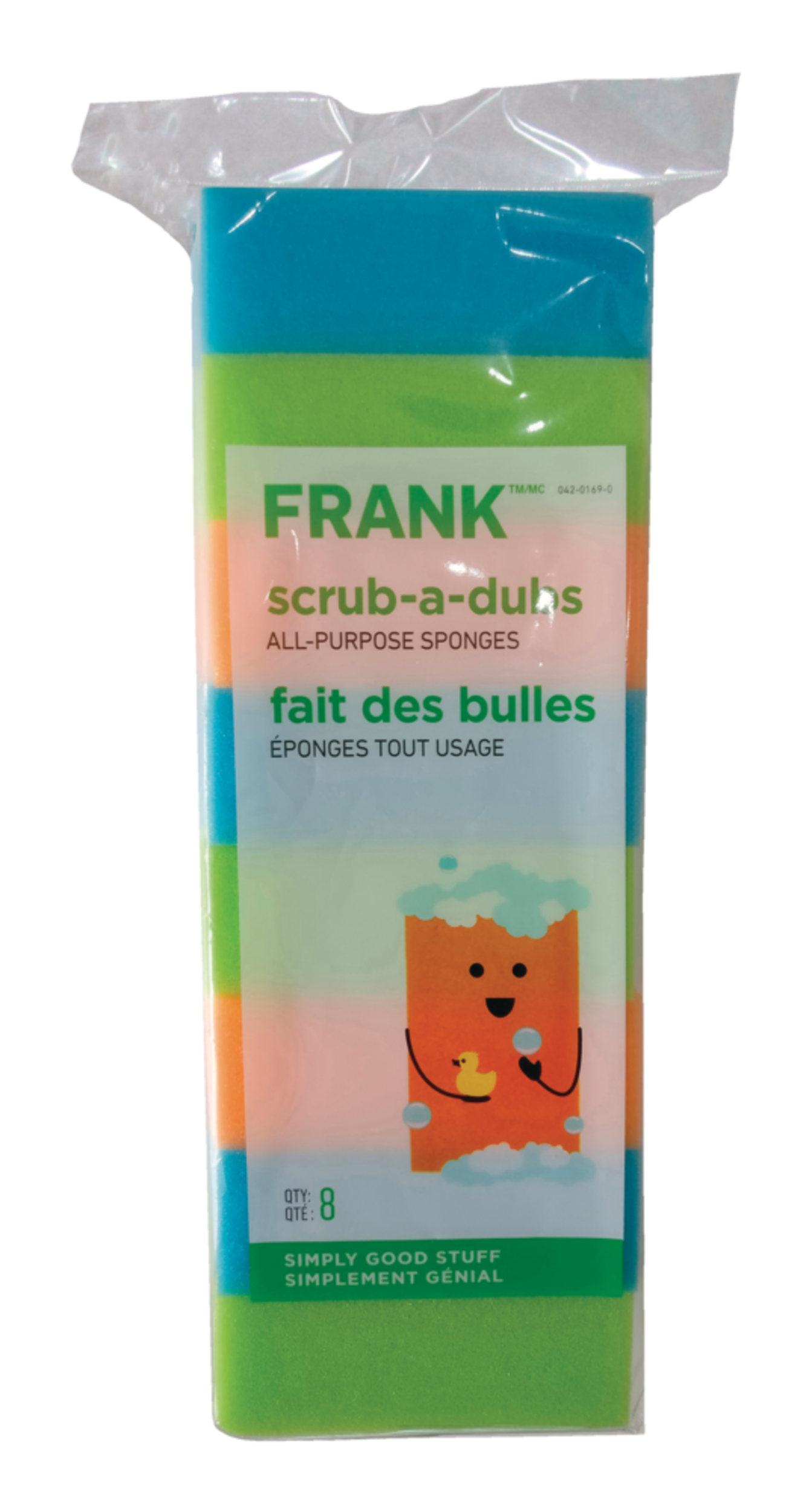 The FRANK All-Purpose Scrub Sponge is a must-have for every household. Whether you're sopping up a spill, cleaning dishes or washing your car, this all-purpose scrub sponge is a cleanup essential. Rinse the sponge thoroughly before and after use, especially when using products containing bleach.