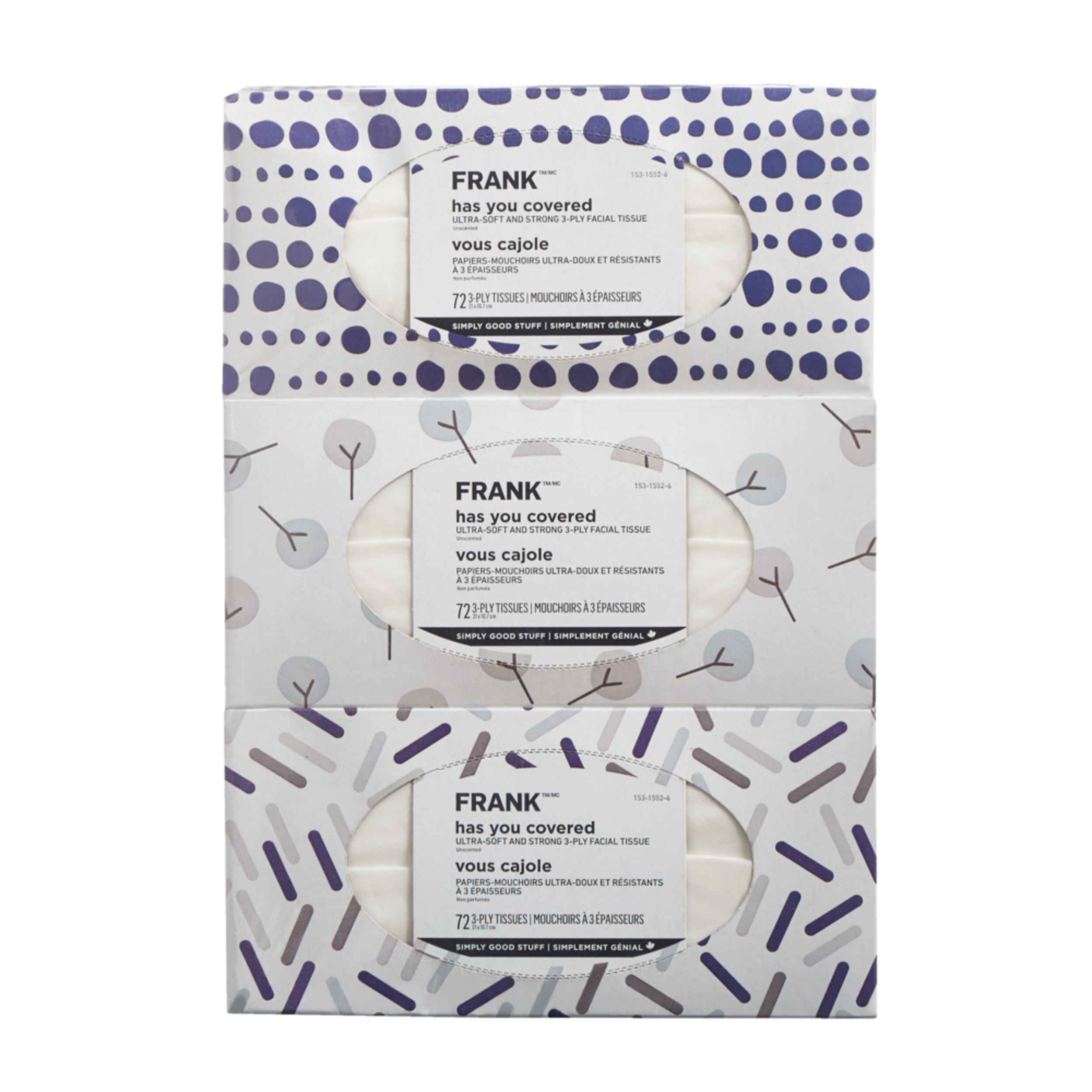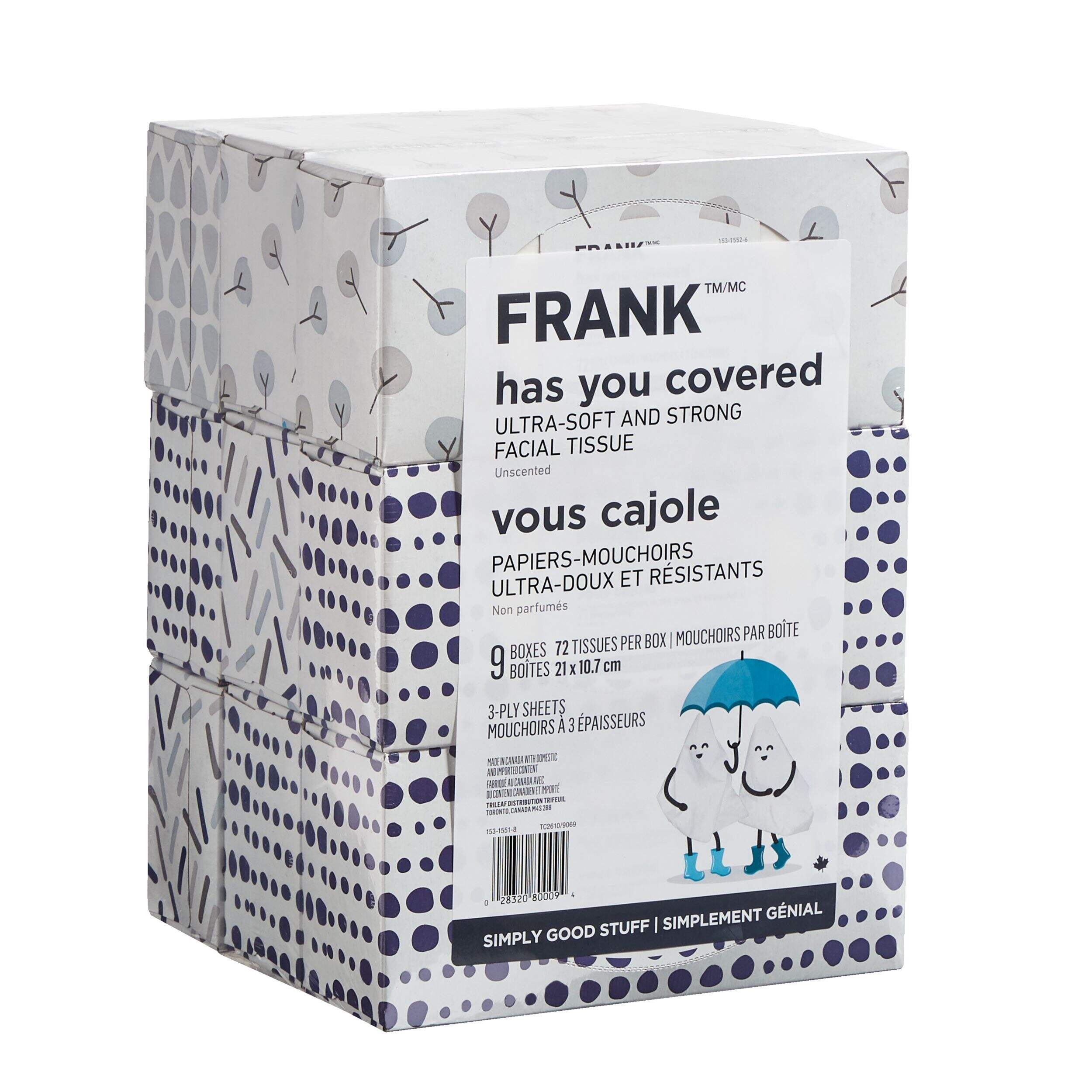 Soft and suitable for regular use on skin, FRANK Facial Tissues are available in a 9-box set, with each box containing 72 facial paper sheets. These 3-ply facial tissues are suitable for sensitive skin and convenient to use directly out of the tissue box.