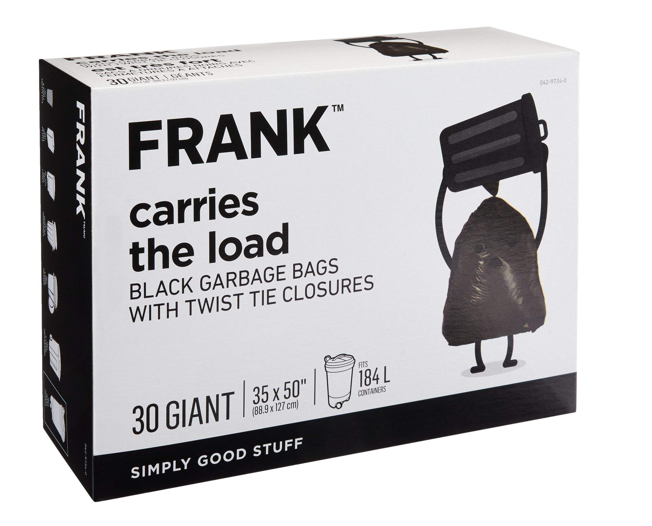 Large and durable, FRANK Giant Twist-Tie Outdoor Garbage Bags are a pack of 30 large outdoor garbage bags. These heavy-duty polyethylene bags are strong and large-sized, and can carry up to 184 L of waste. Convenient twist-tie closures also make these trash bags easy to tie and dispose. 1-year exchange warranty included.