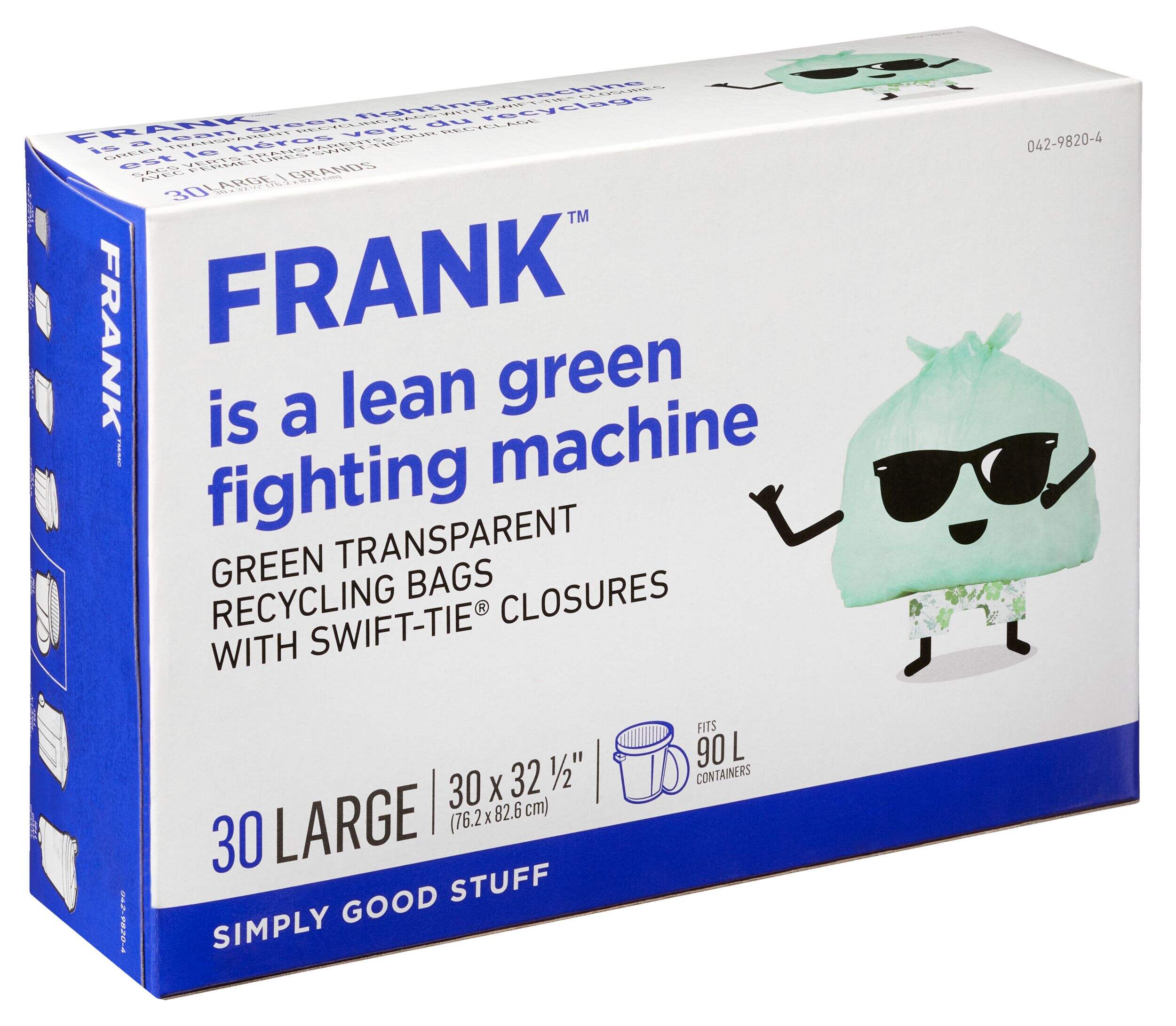 FRANK Large Swift-Tie Organic Waste Bags offer non-compostable 30 organic waste bags. These polyethylene trash bags are easy to tie and carry, and can hold up to 90 L of waste. Featuring a transparent green colour, these large garbage bags also have a 1-year warranty.