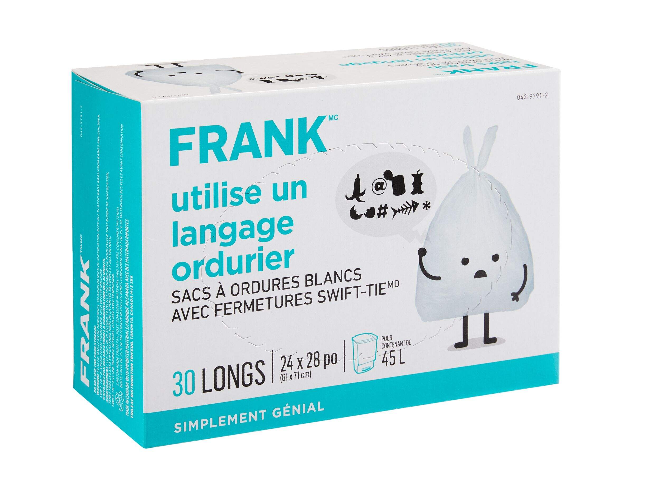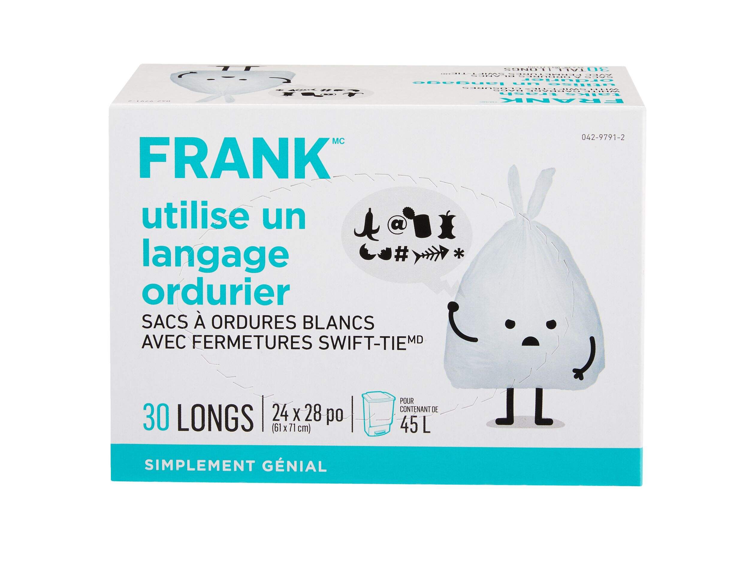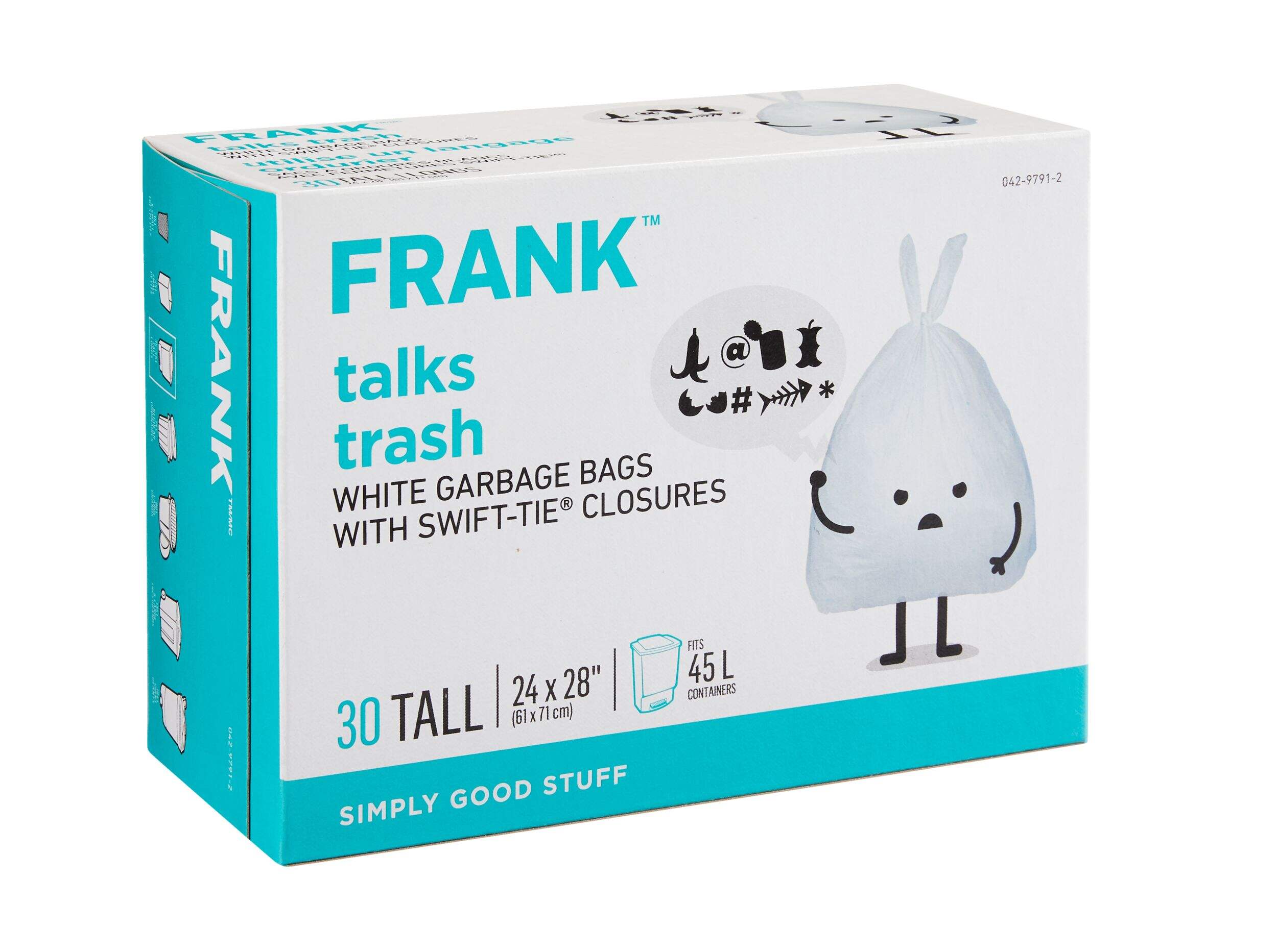FRANK Tall Swift-Tie Unscented Garbage Bags feature a set of 30 strong household garbage bags. These trash bags are sturdy enough to handle up to 45 L of waste and are suitable for daily usage. Made with highly durable polyethylene.