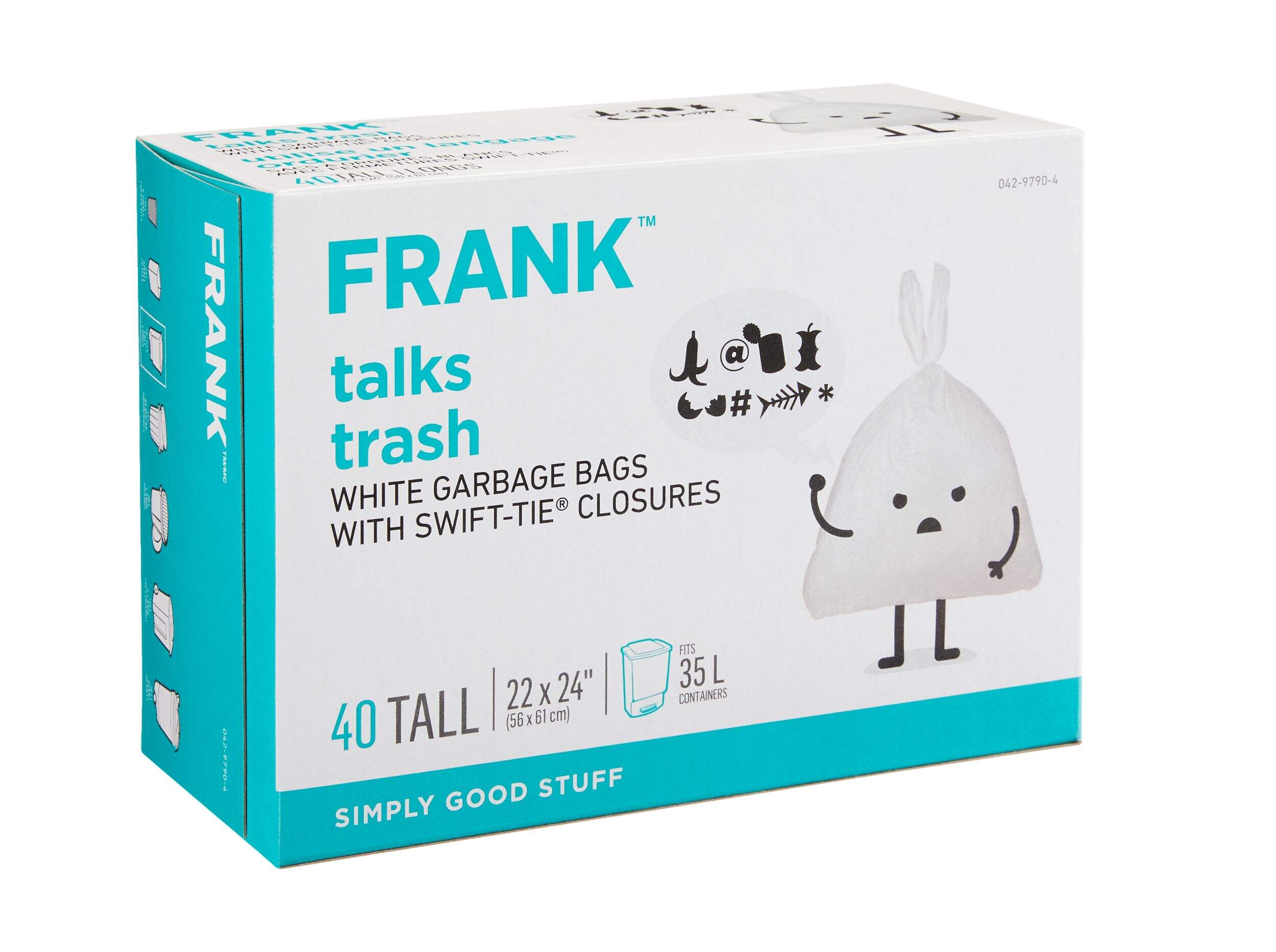 FRANK Tall Swift-Tie Unscented Garbage Bags feature 40 strong trash bags for daily usage. These unscented polyethylene garbage bags are easy to tie and can carry up to 35 L of waste, making them perfect for collecting all of your household garbage.