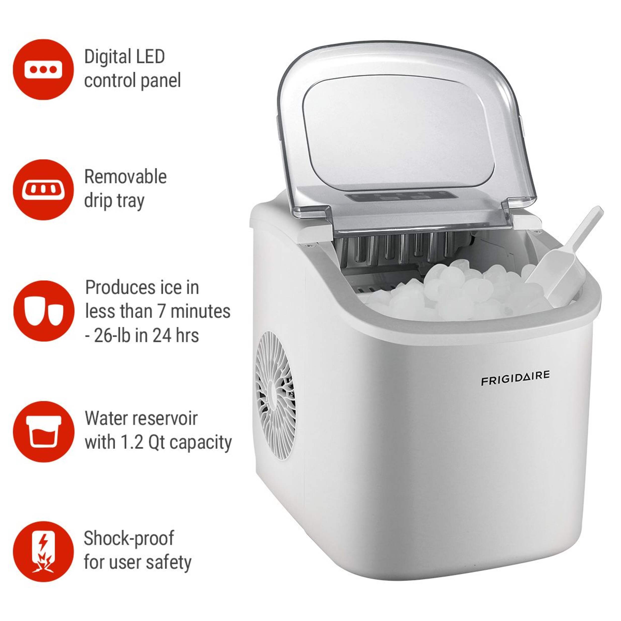 Efficiently produces 26 pounds of ice per day in a 24-hour period