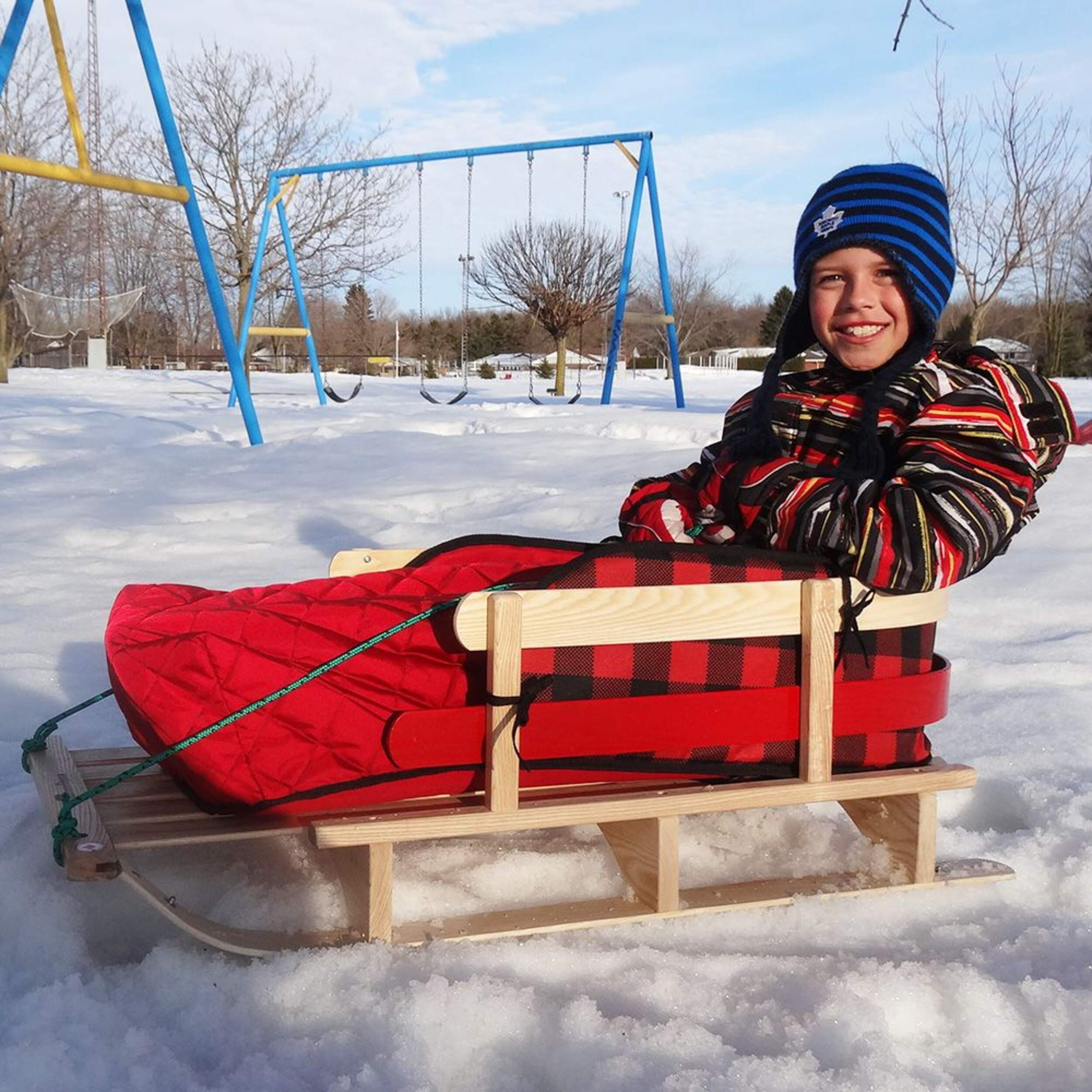The Frontier XL Sleigh with Bootie Pad is built to last through generations. It features a handcrafted ash hardwood body shaped through a steam-bent process. Metal wear bars under the runners extend the life of your sleigh as you pull it through the snow using the soft, braided rope that's easy on your hands. The plaid pad and hand-quilted, waterproof bootie add comfort and rustic charm to each ride, keeping you cozy and warm while opening at the top for easy access. The bootie fits snugly so you can settle in for a delightful trek through the snow.