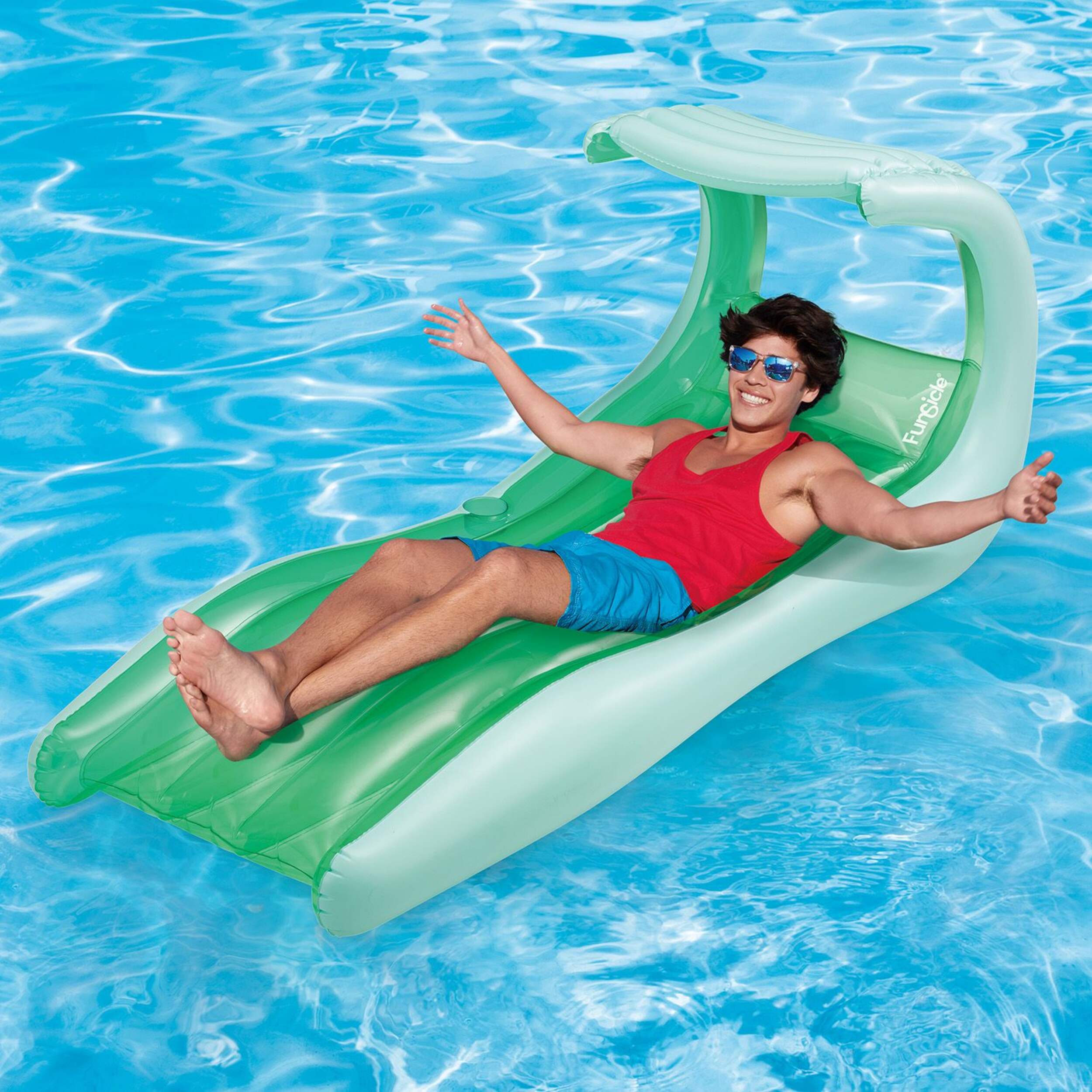 Relax in style with the Funsicle NuWave Shaded Lounger, designed for laidback comfort on the water. Its contoured shape lets you recline effortlessly while staying dry, and the built-in canopy provides essential sun protection. A convenient drink holder keeps your refreshments close, while durable, leak-resistant construction helps ensure long-lasting use. Quick to inflate and deflate, it’s the perfect summer lounging companion.