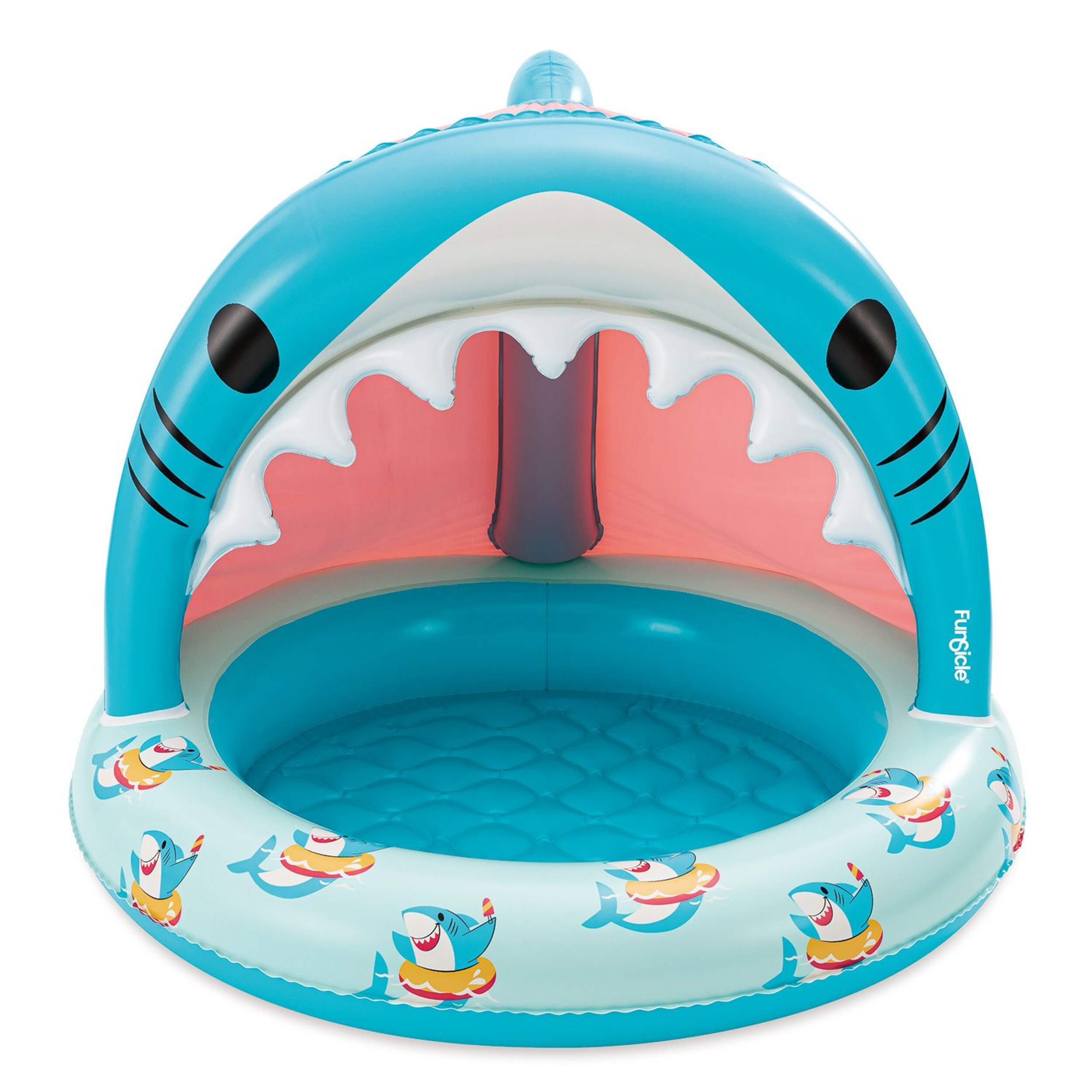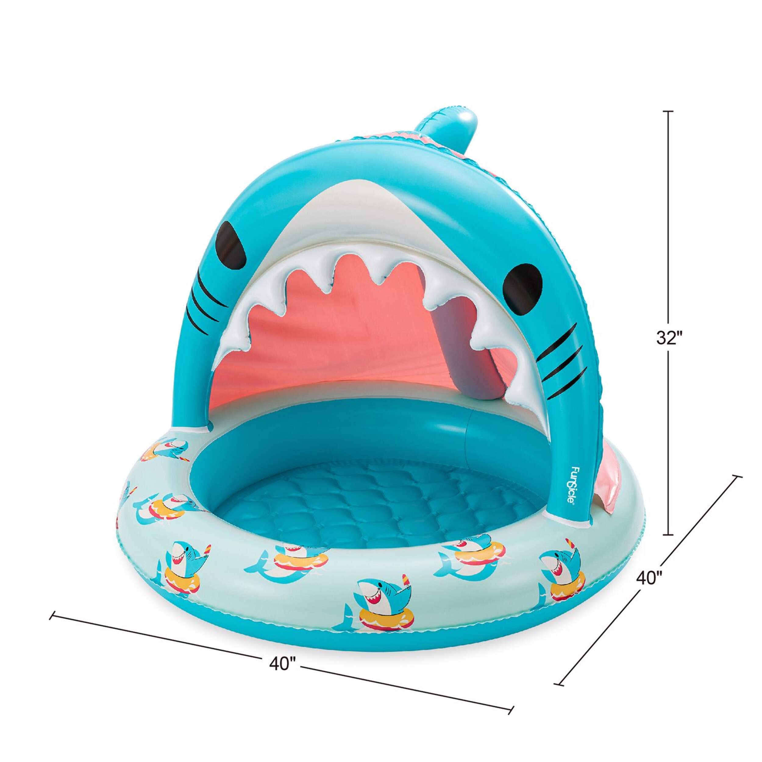 Support safe and fun water play with the Funsicle Smiley Shark Shaded Pool. Featuring an eye-catching shark design, this inflatable pool has a built-in sunshade to protect your little ones from harsh rays. A cushioned base adds comfort while kids splash, and it easily converts into a ball pit for versatile playtime. With durable, leak-resistant construction and quick inflation, this pool is a hassle-free way to help keep kids cool all summer.