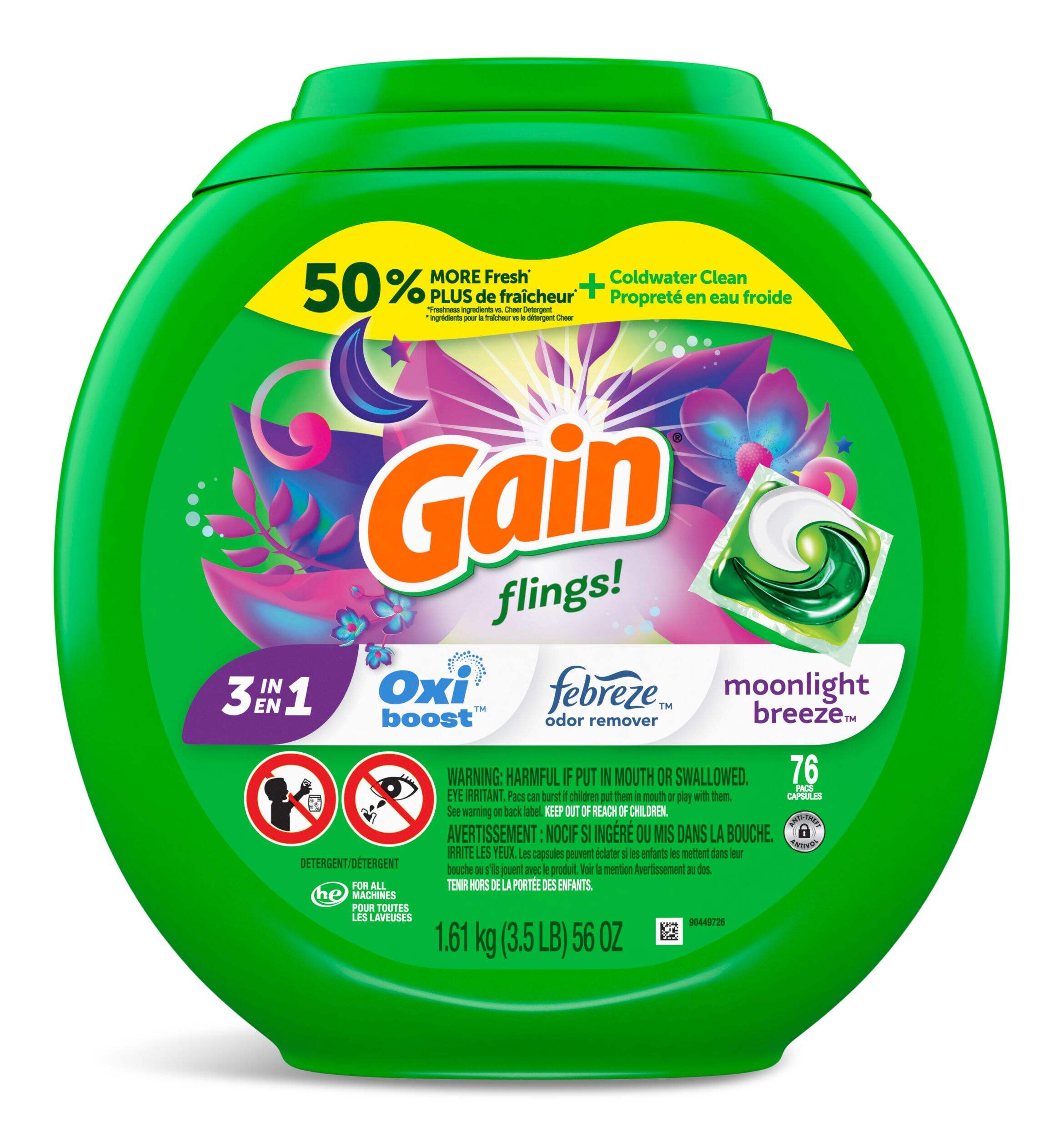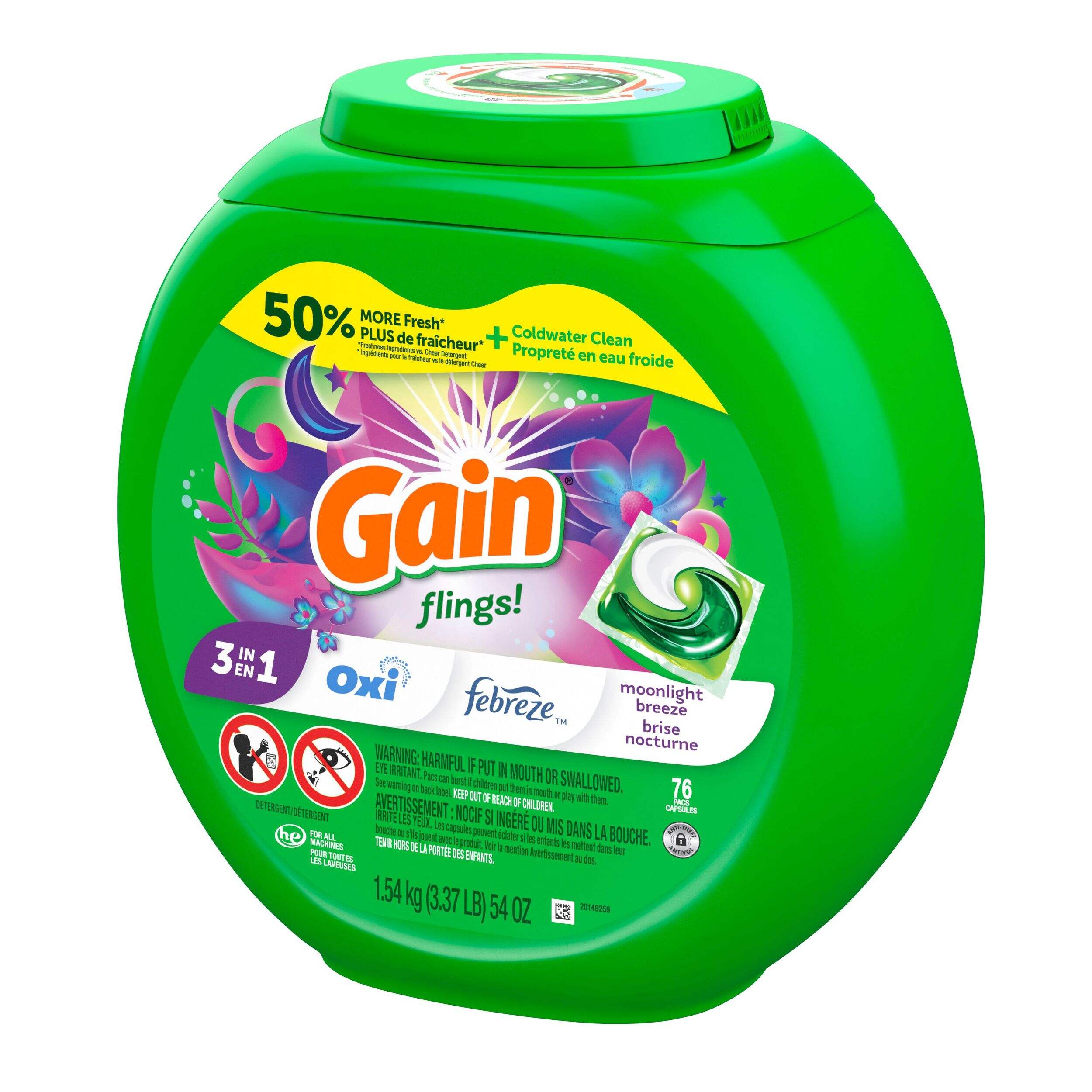 Gain flings! Armed with the stain-fighting power of Oxi and Febreze, these pacs produce only the cleanest, most amazing-smelling laundry. Gain's unique Moonlight Breeze scent infuses your clothes with airy nighttime fragrances, so you're always but a single sniff away from an invigorating scent experience.