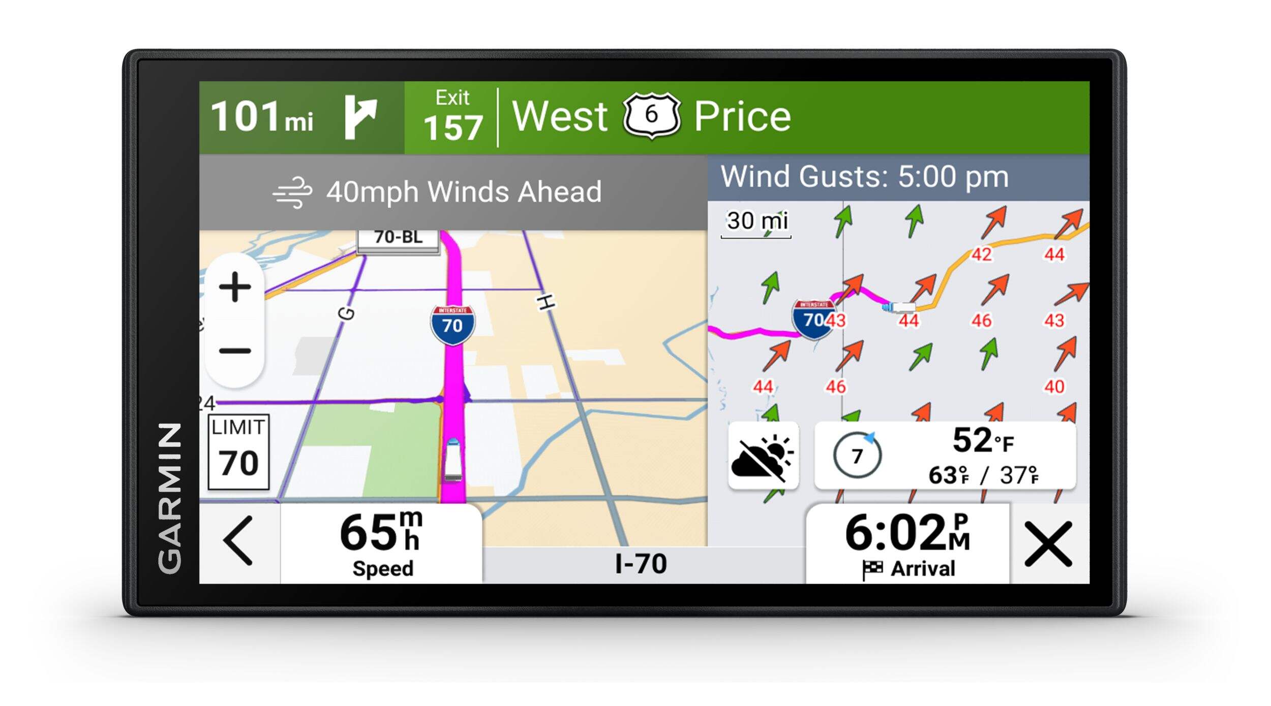 Wind speed weather overlay on the map shows potentially hazardous conditions and alerts when there are high winds detected on your route (requires dēzl™ app on your compatible smartphone)