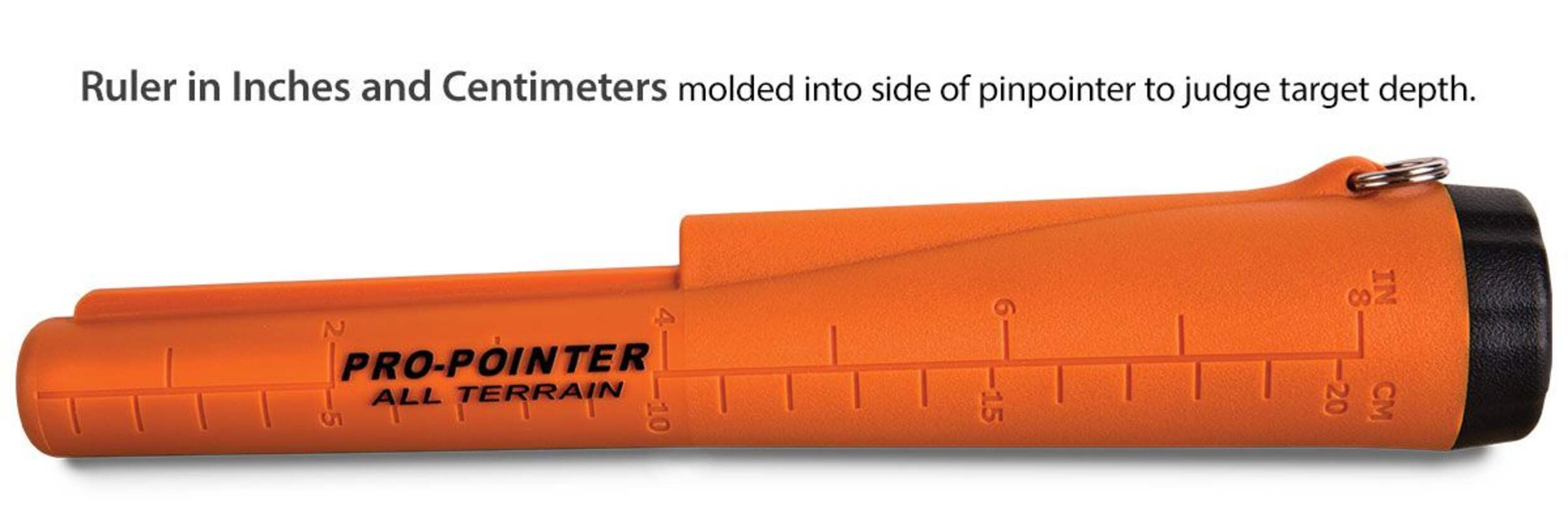 Ruler in inches and centimeters molded into side of pinpointer to judge target depth
