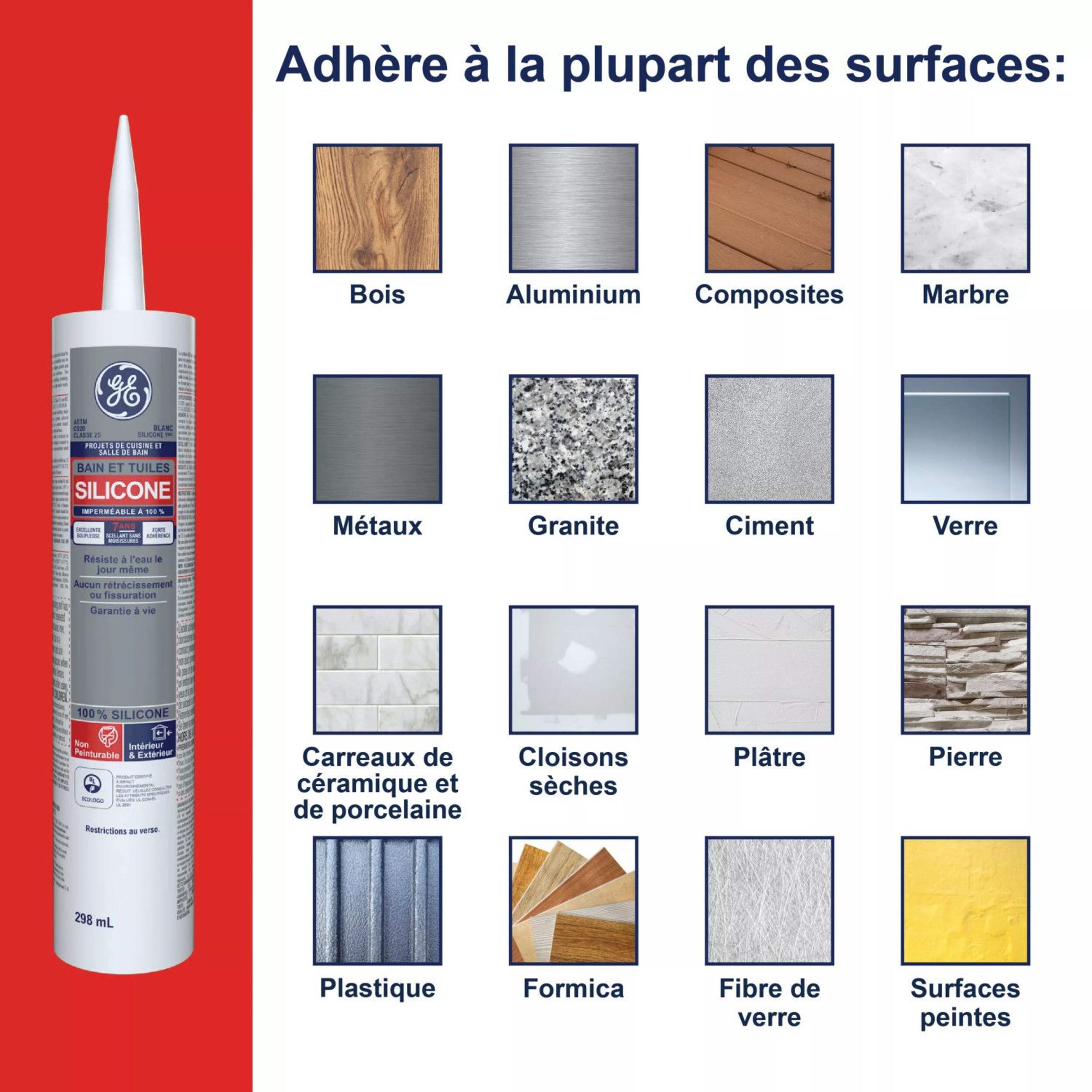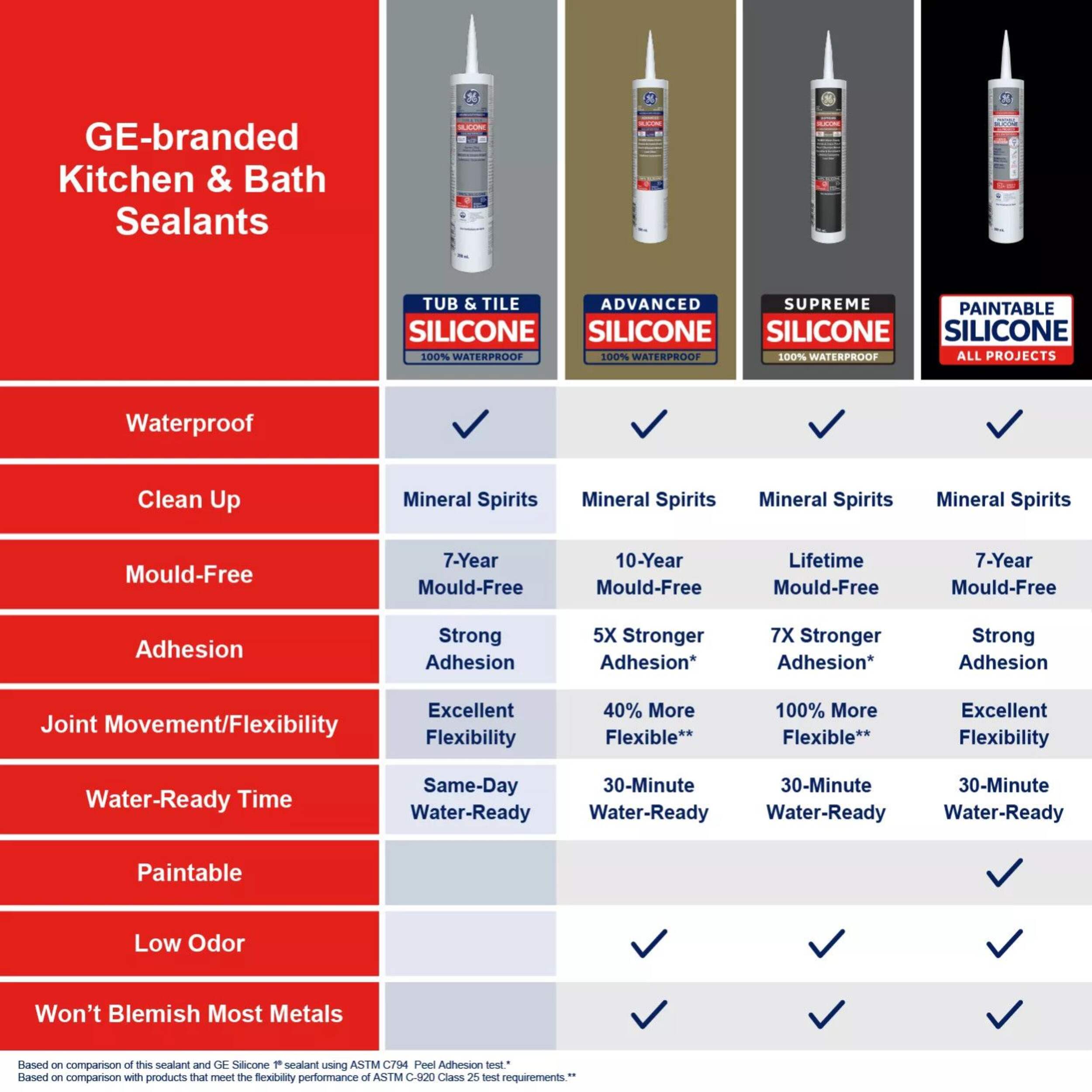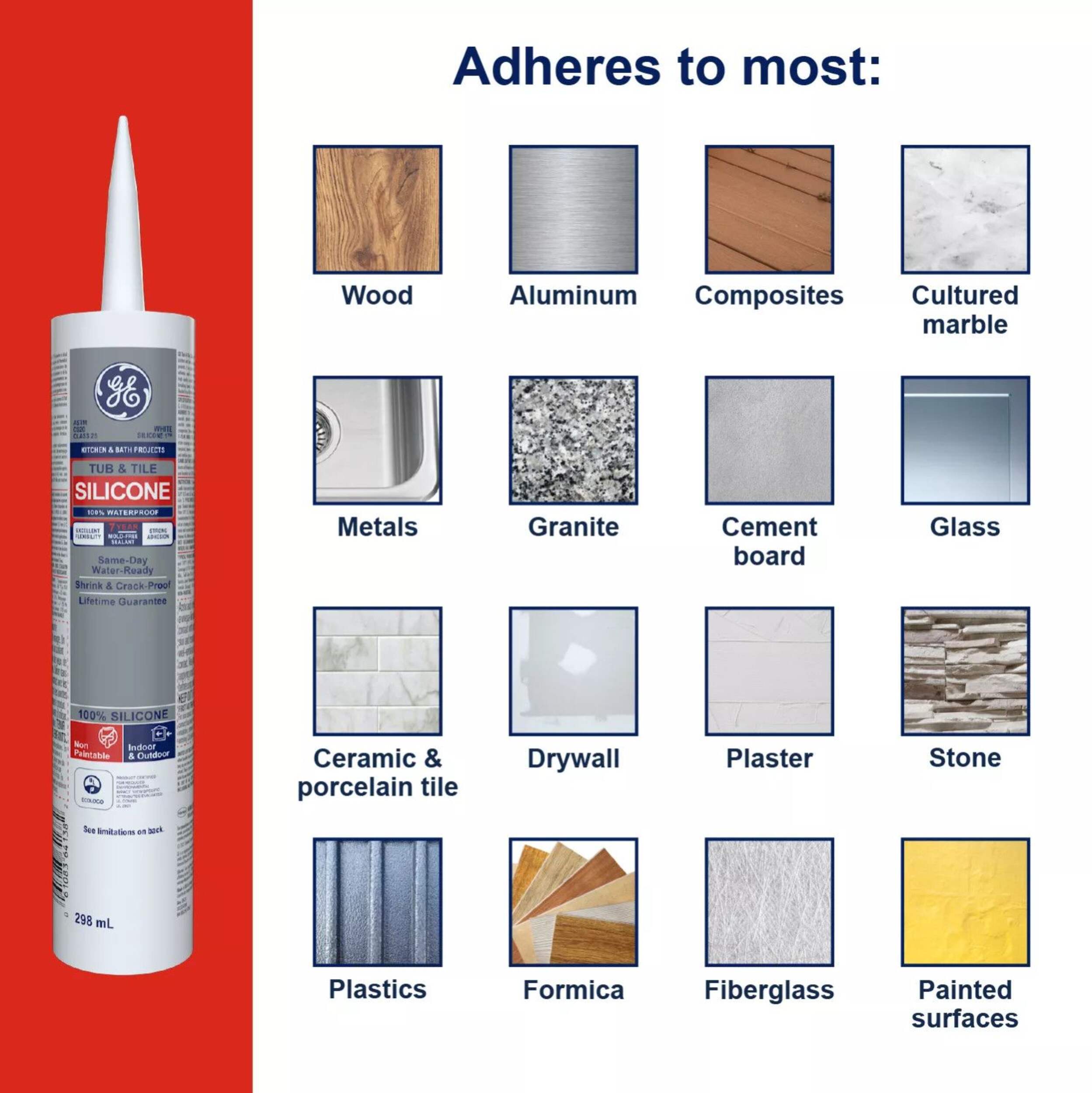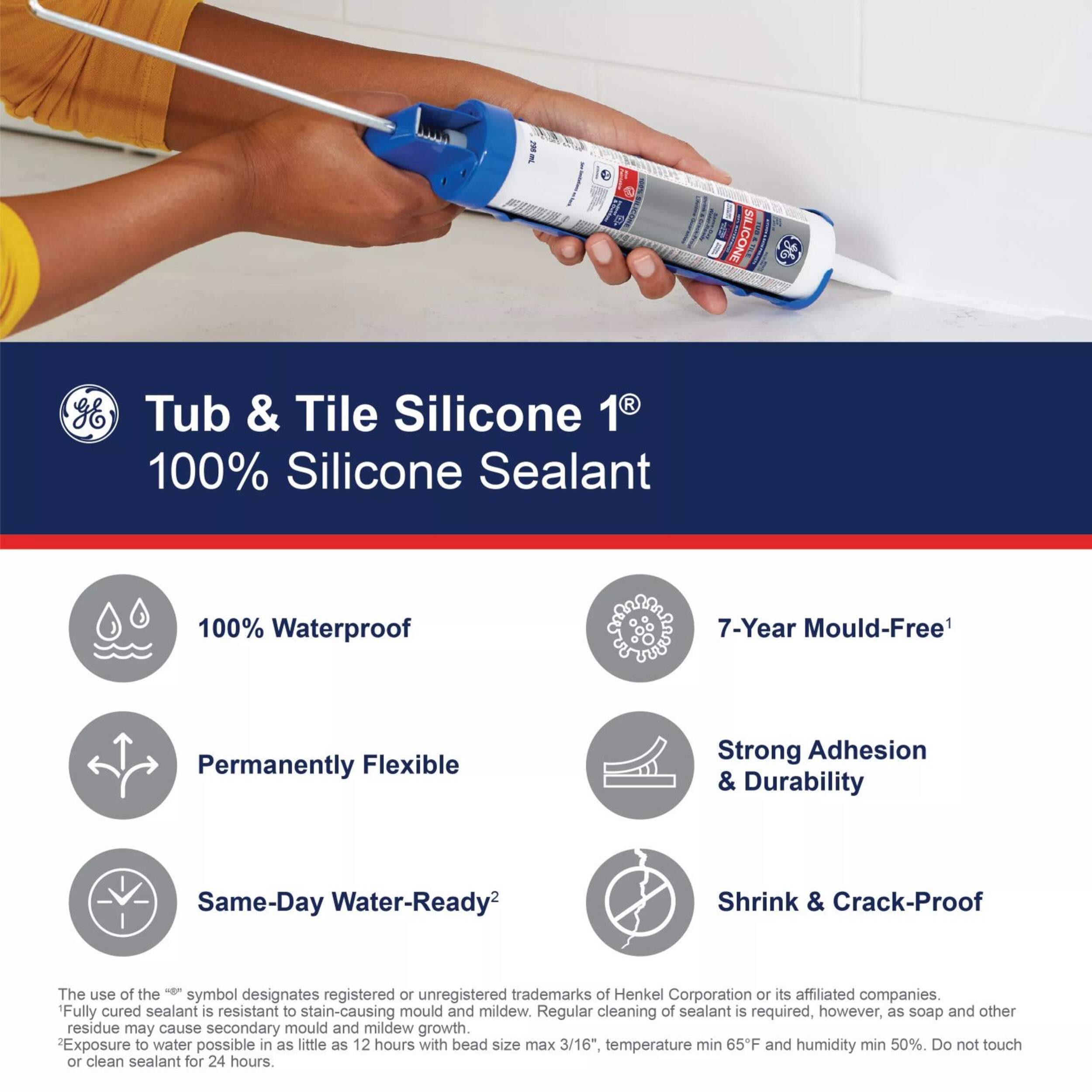 Tub & Tile Silicone 1 sealant is a 100% silicone and 100% waterproof sealant ideal for areas susceptible to moisture like sinks, tubs, showers, fixtures, countertops, backsplashes and plumbing projects. Tub & Tile Silicone 1 sealant is flexible with strong adhesion and resistant to stain-causing mold and mildew growth with 7-year mold-free product protection.