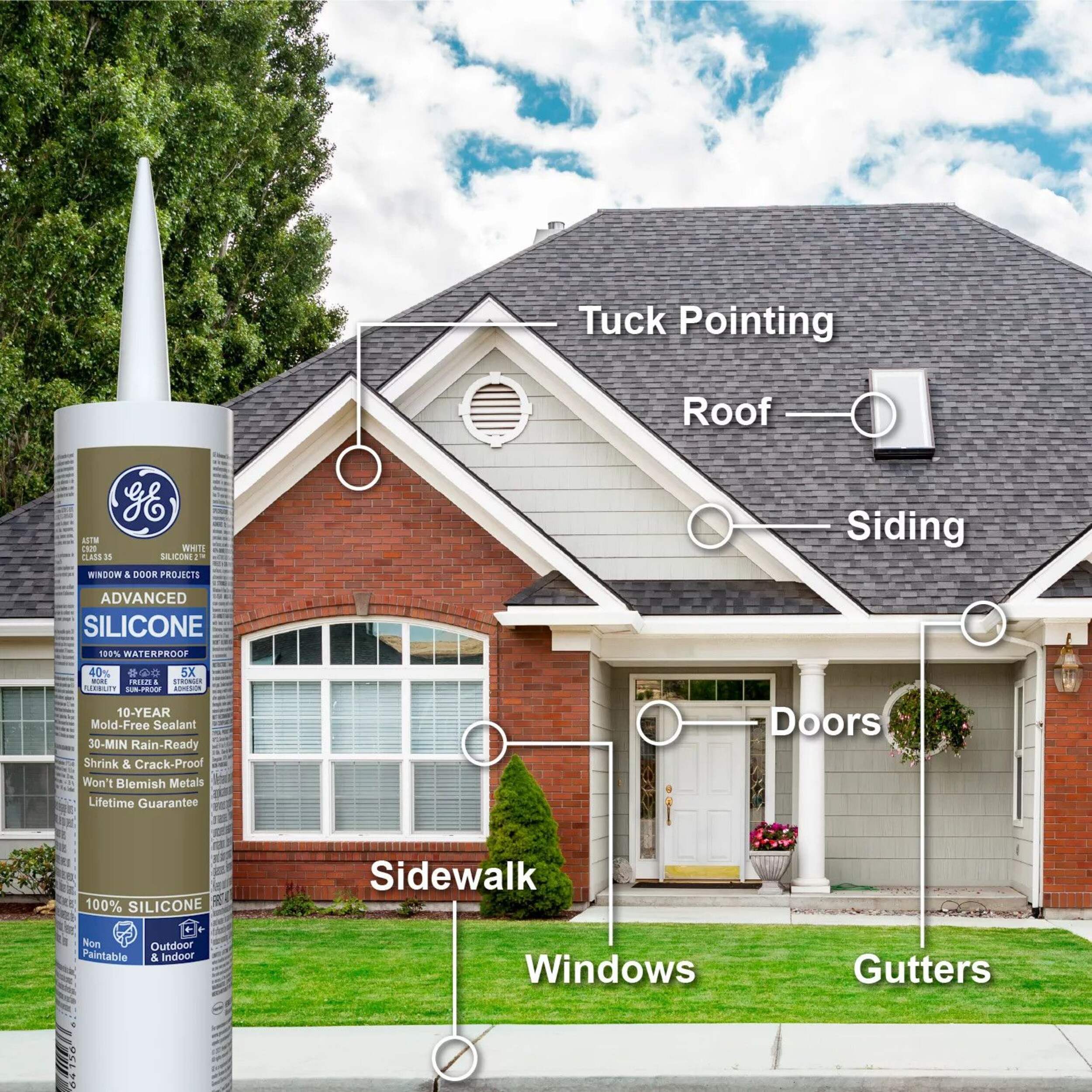 GE Advanced Silicone Window & Door Sealant is a 100% waterproof and weatherproof silicone formula that offers protection against water damage, providing a reliable seal in areas prone to harsh weather