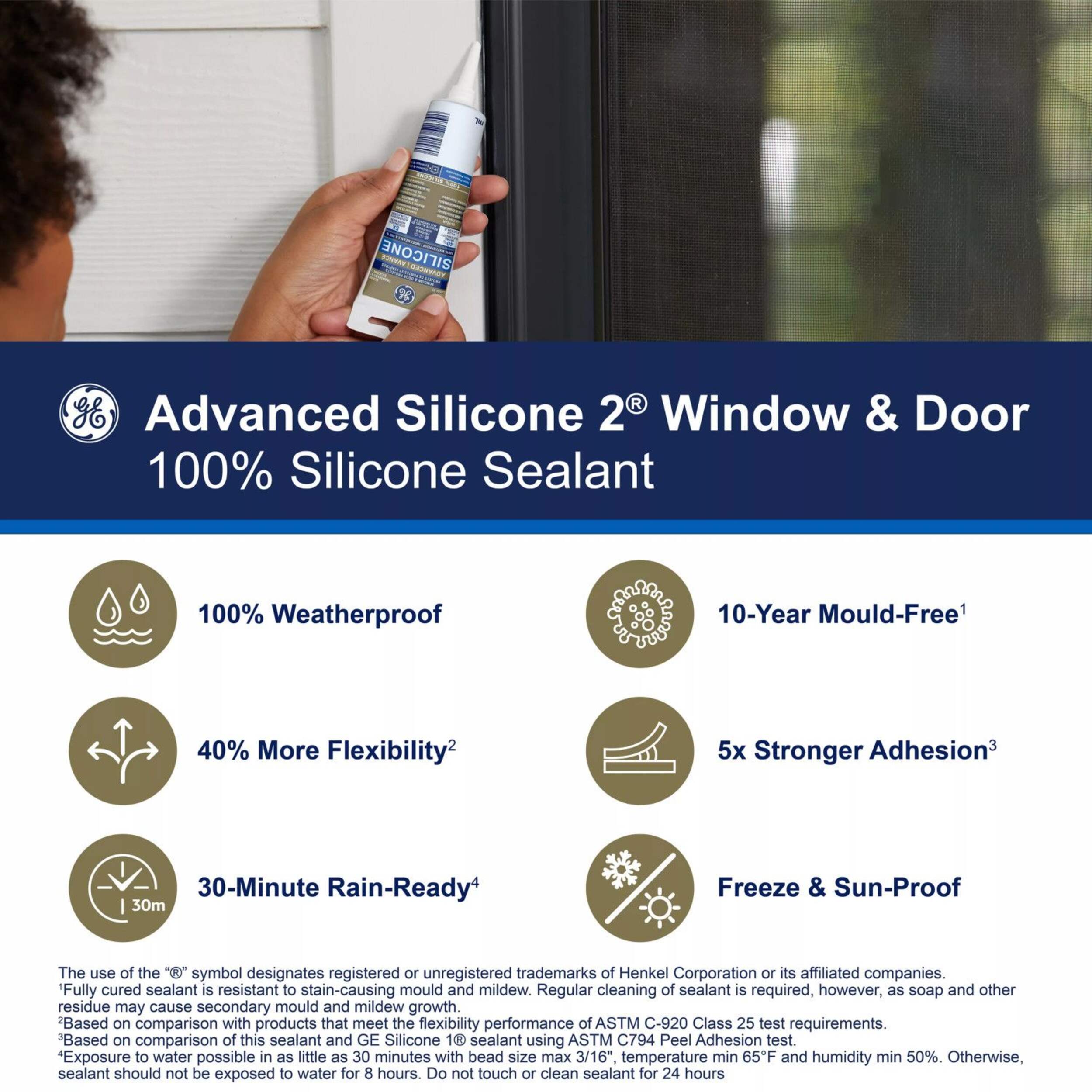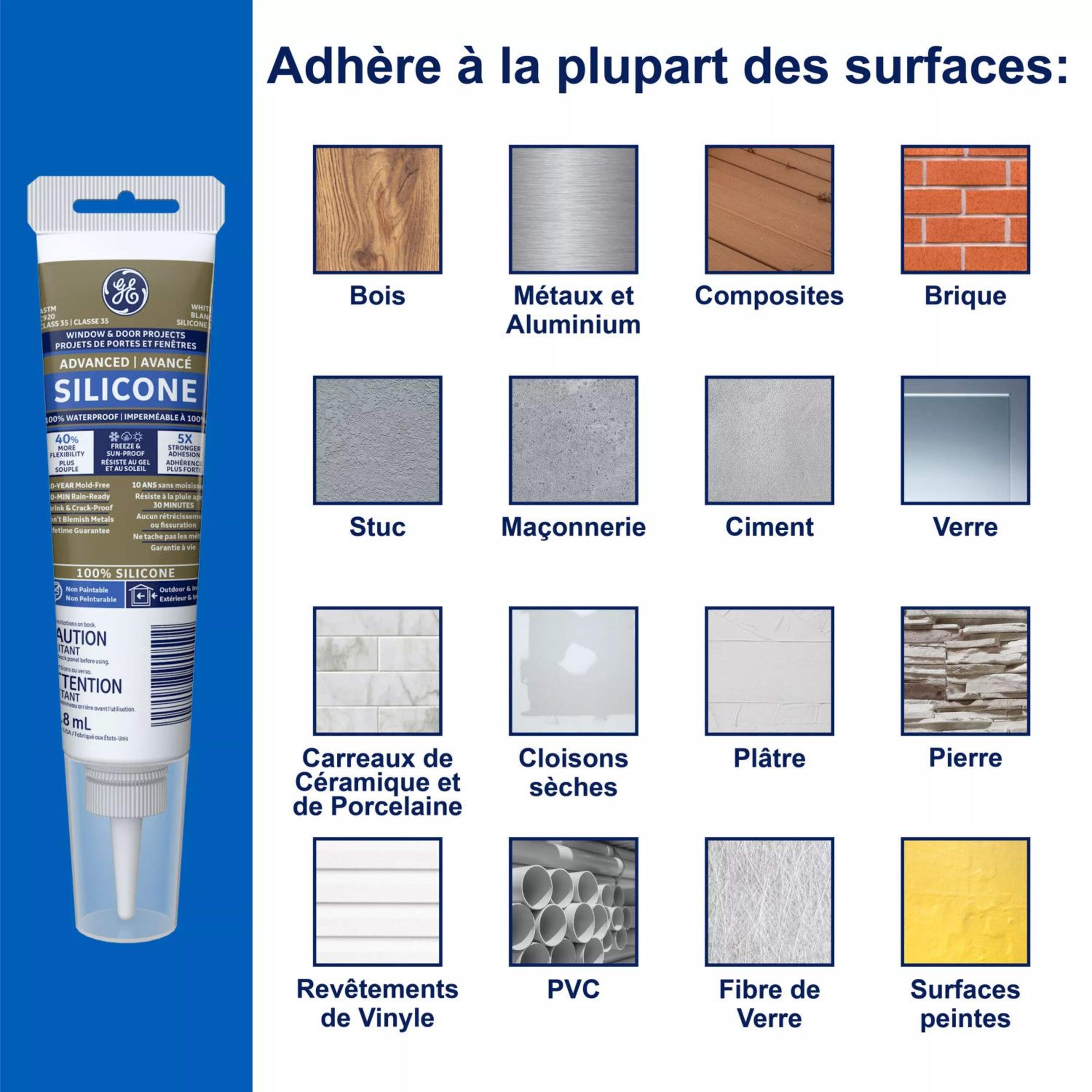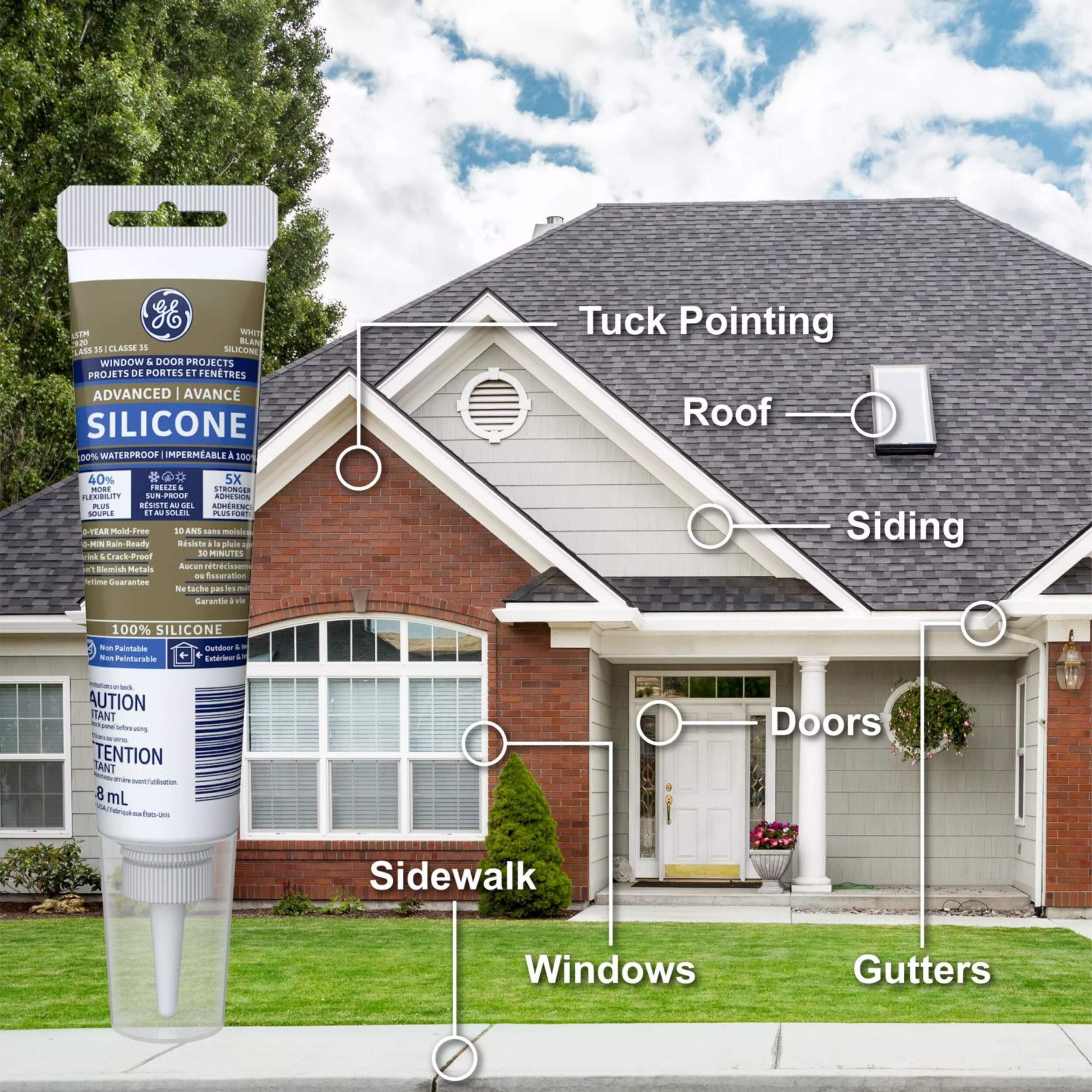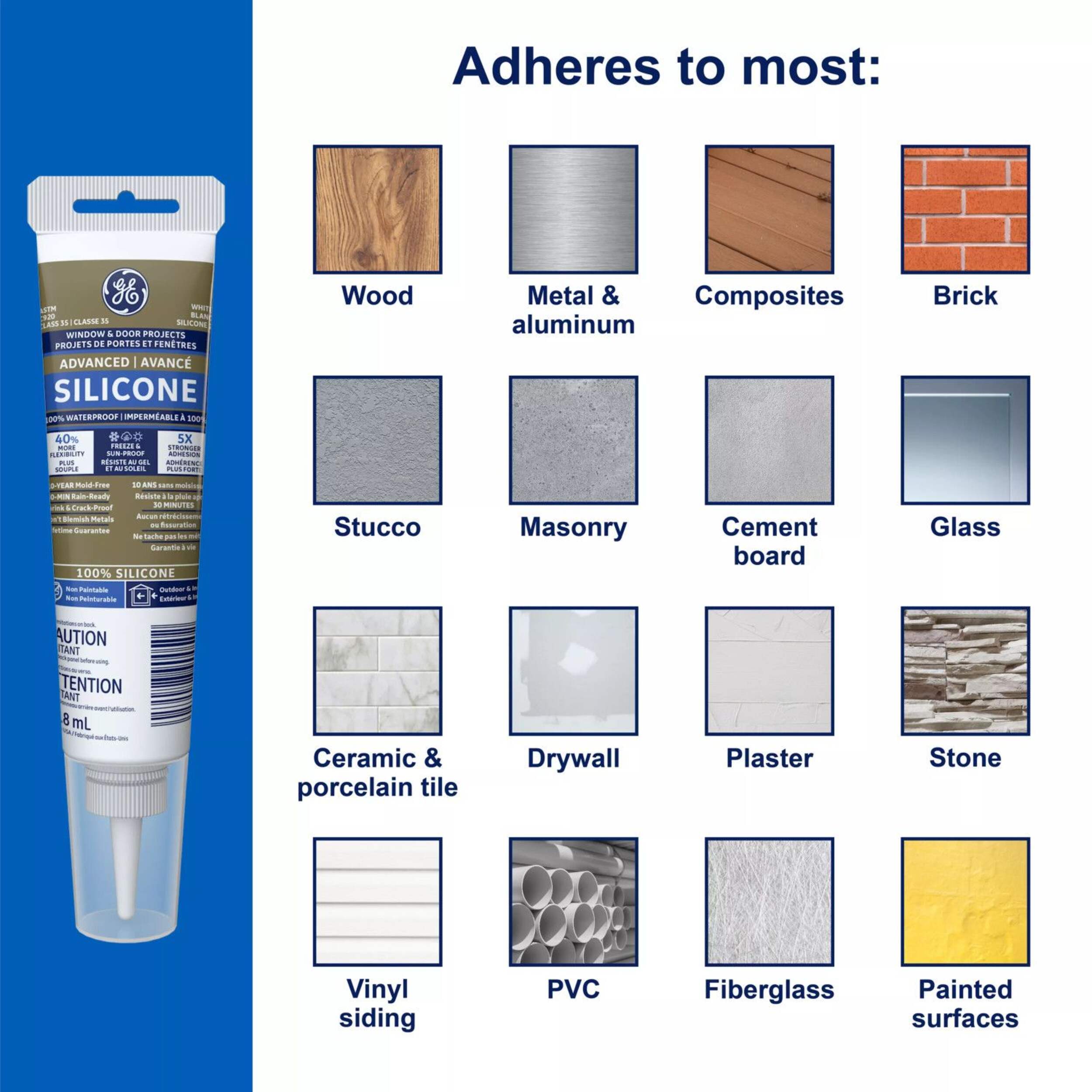 GE Advanced Silicone Window & Door Sealant is a 100% waterproof and weatherproof and 100% silicone formula that offers protection againstwater damage, providing a reliable seal in areas prone to harsh weather