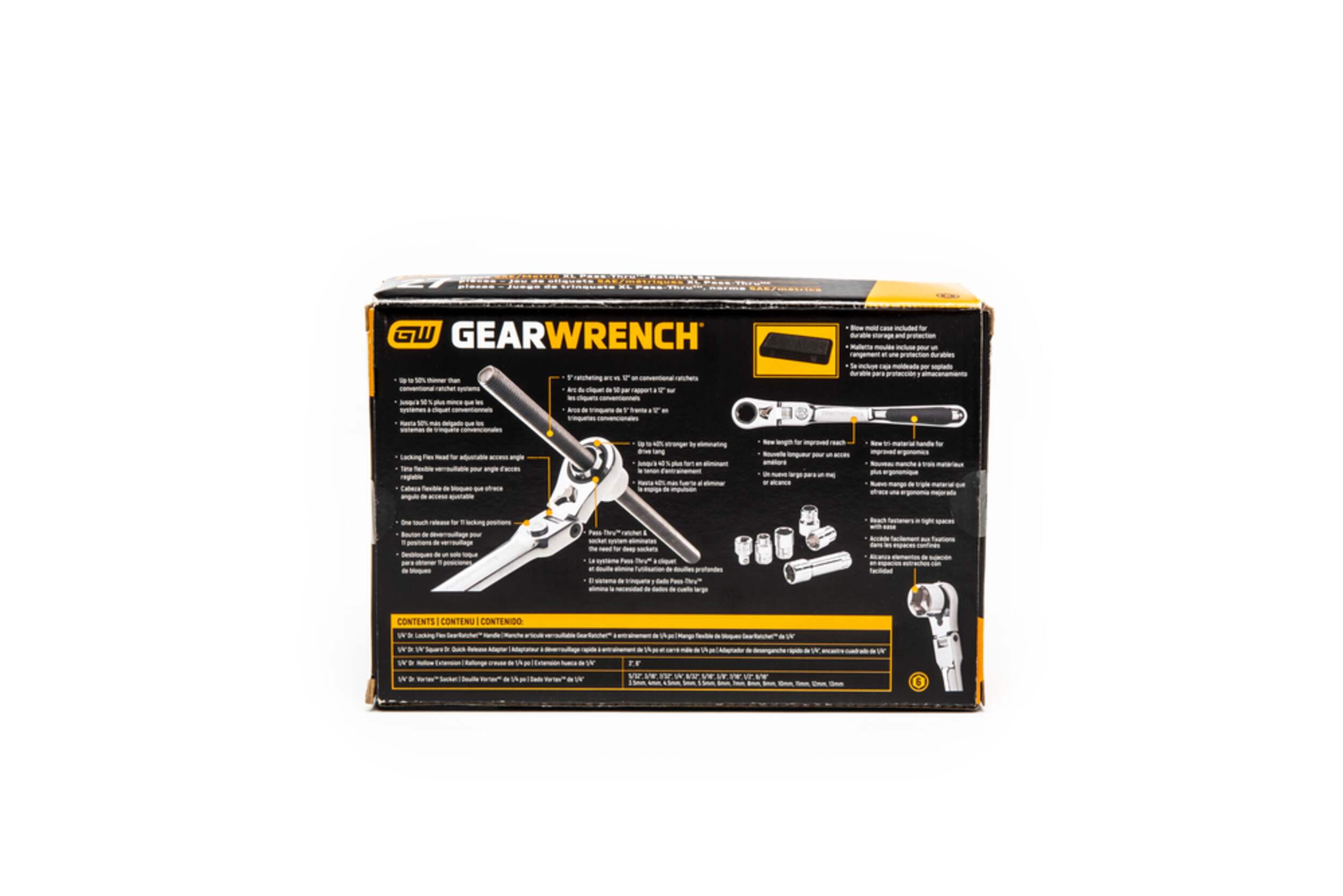 The Pass-Thru™ socket and GearRatchet™ ratchet system by GEARWRENCH was designed to improve productivity and access on every job. The GearRatchet™ ratchets need as little as 5° to move fasteners vs. 30° for standard wrenches and are 40% stronger than standard ratchets by eliminating the drive tang. The ratchets are up to 50% thinner than standard ratchets providing superior access to even the most hard to reach fasteners. The Pass-Thru™ sockets are a thin wall design. They replace the need for deep well sockets as they loosen and drive nuts on bolts of any length. The Pass Thru® sockets integrate into the GEARWRENCH GearRatchet™ handle, reducing overall height and increasing torque strength. The GEARWRENCH adapter allows for the use of standard sockets and drive tools.