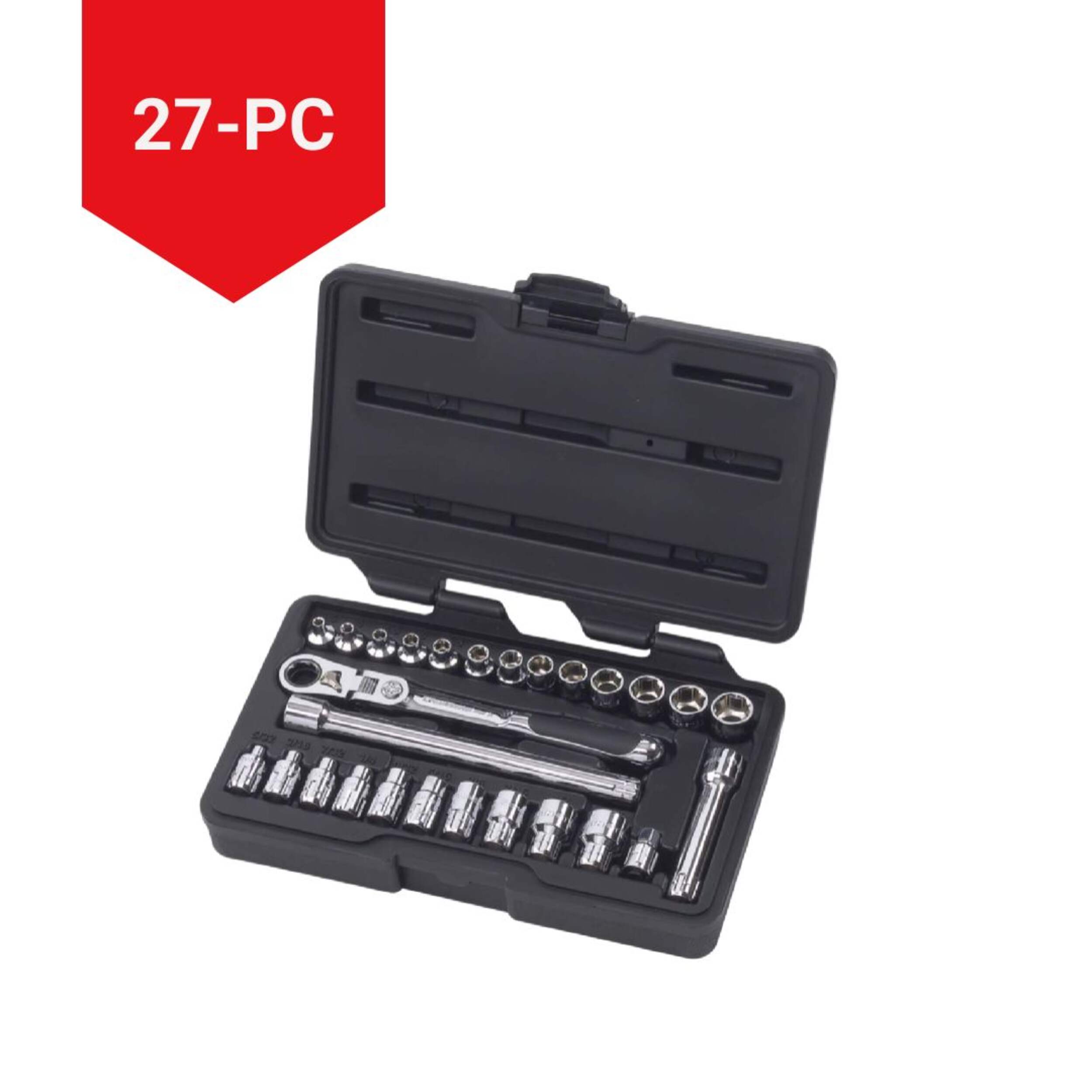 Set includes: (1) ratchet, (2) extensions, (1) adapter, (10) standard SAE Pass-Thru™ sockets, and (13) standard Metric Pass-Thru™ sockets
