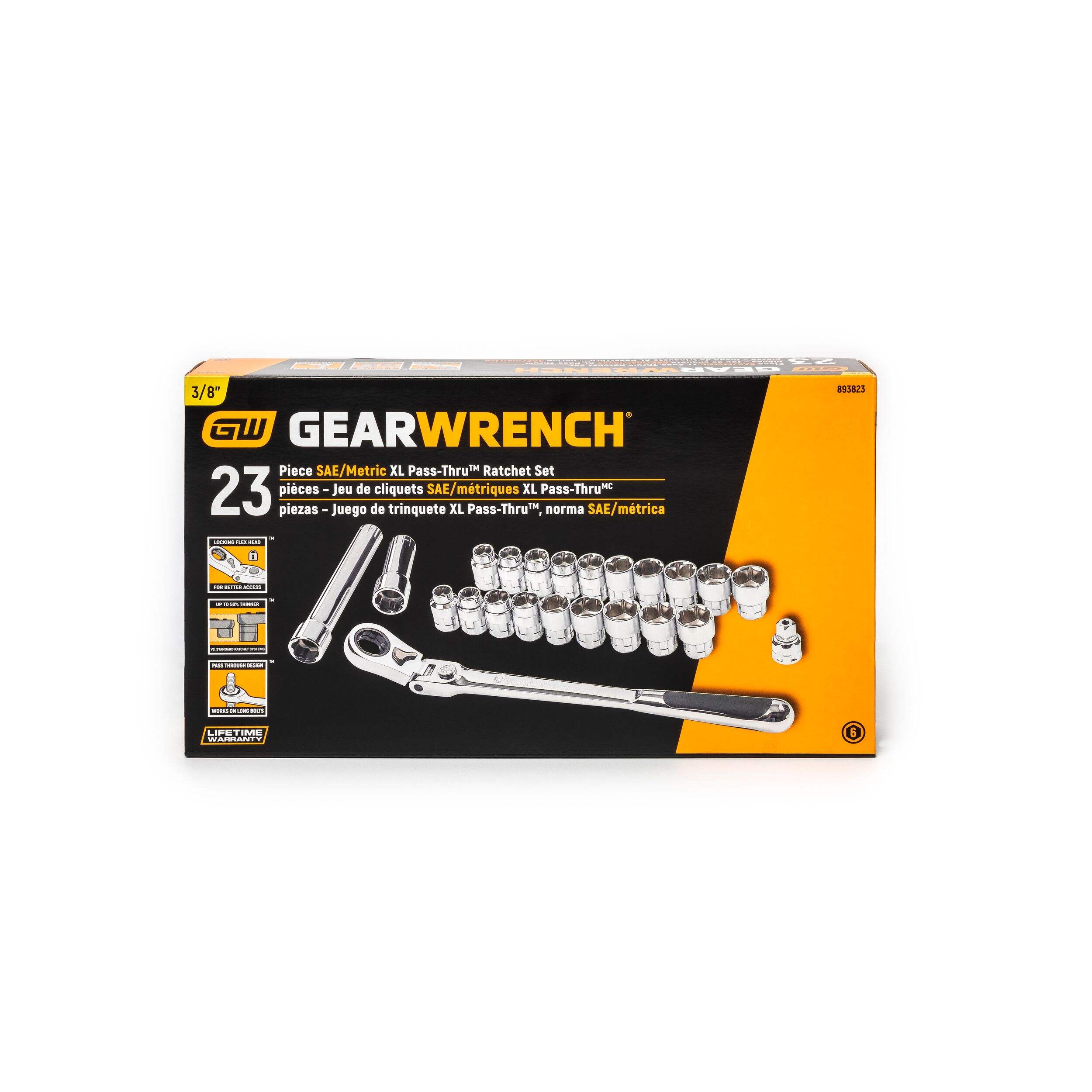 The Pass-Thru™ socket and GearRatchet™ ratchet system by GEARWRENCH was designed to improve productivity and access on every job. The GearRatchet™ ratchets need as little as 5° to move fasteners vs. 30° for standard wrenches and are 40% stronger than standard ratchets by eliminating the drive tang. The ratchets are up to 50% thinner than standard ratchets providing superior access to even the most hard to reach fasteners. The Pass-Thru™ sockets are a thin wall design. They replace the need for deep well sockets as they loosen and drive nuts on bolts of any length. The Pass Thru® sockets integrate into the GEARWRENCH GearRatchet™ handle, reducing overall height and increasing torque strength. The GEARWRENCH adapter allows for the use of standard sockets and drive tools.