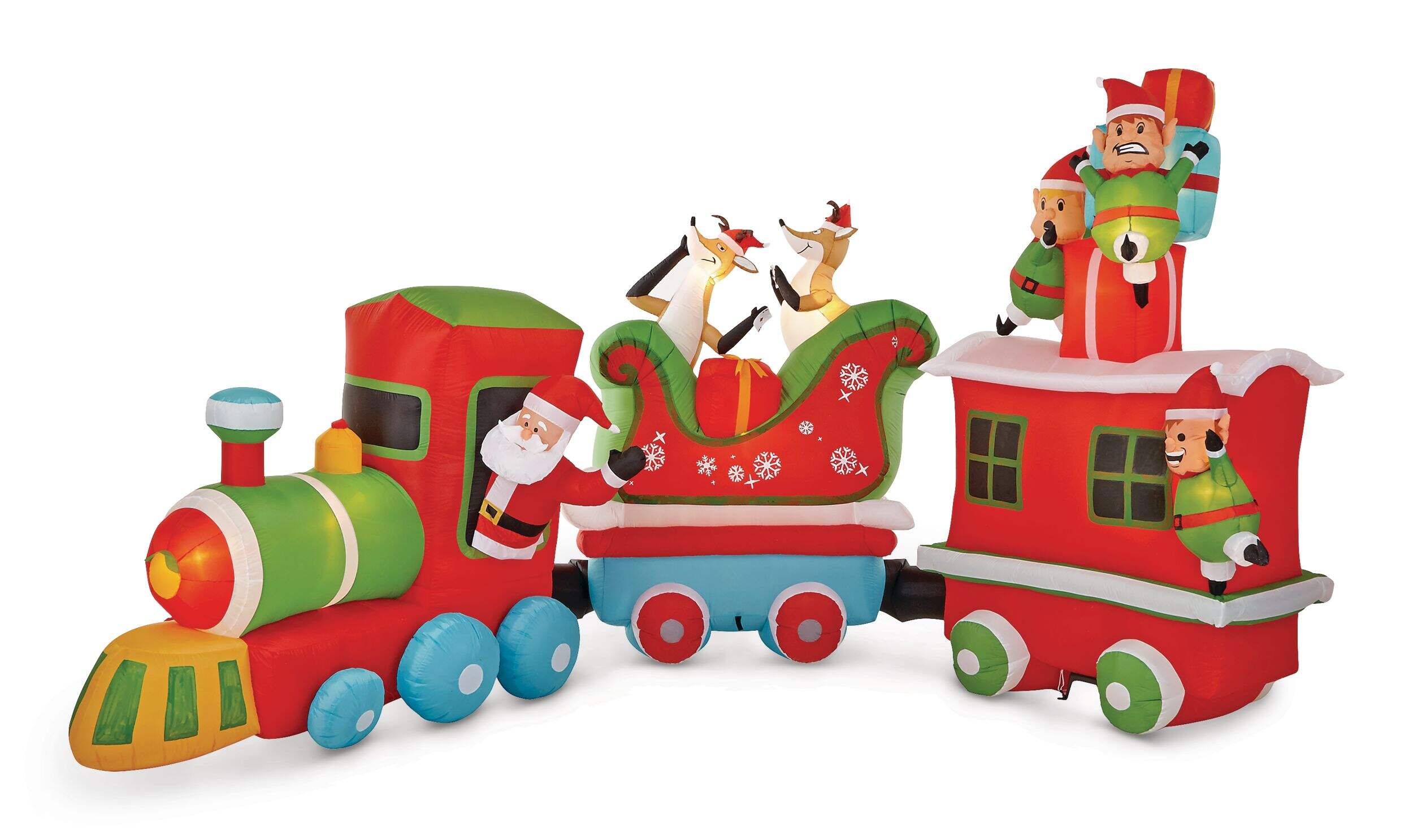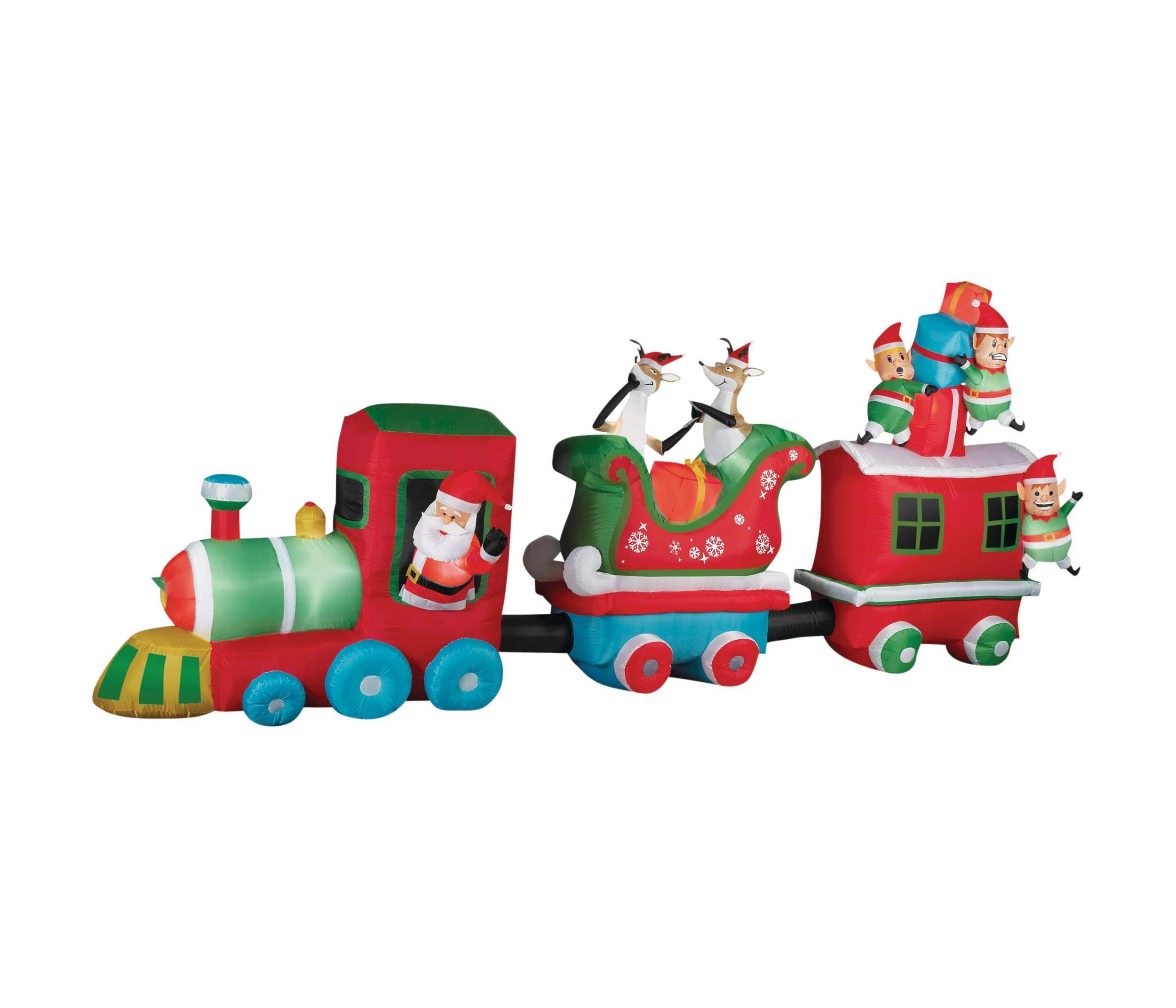 Everyone will know that Santa is coming to town when you decorate with this Airblown Colossal Inflatable Christmas Train. This larger-than-life holiday inflatable train decor features fun characters like silly reindeer, elves and of course, Santa, to liven up your holiday decor. Setup and takedown are quick and easy, and this festive inflatable train can be conveniently plugged into any standard outlet.