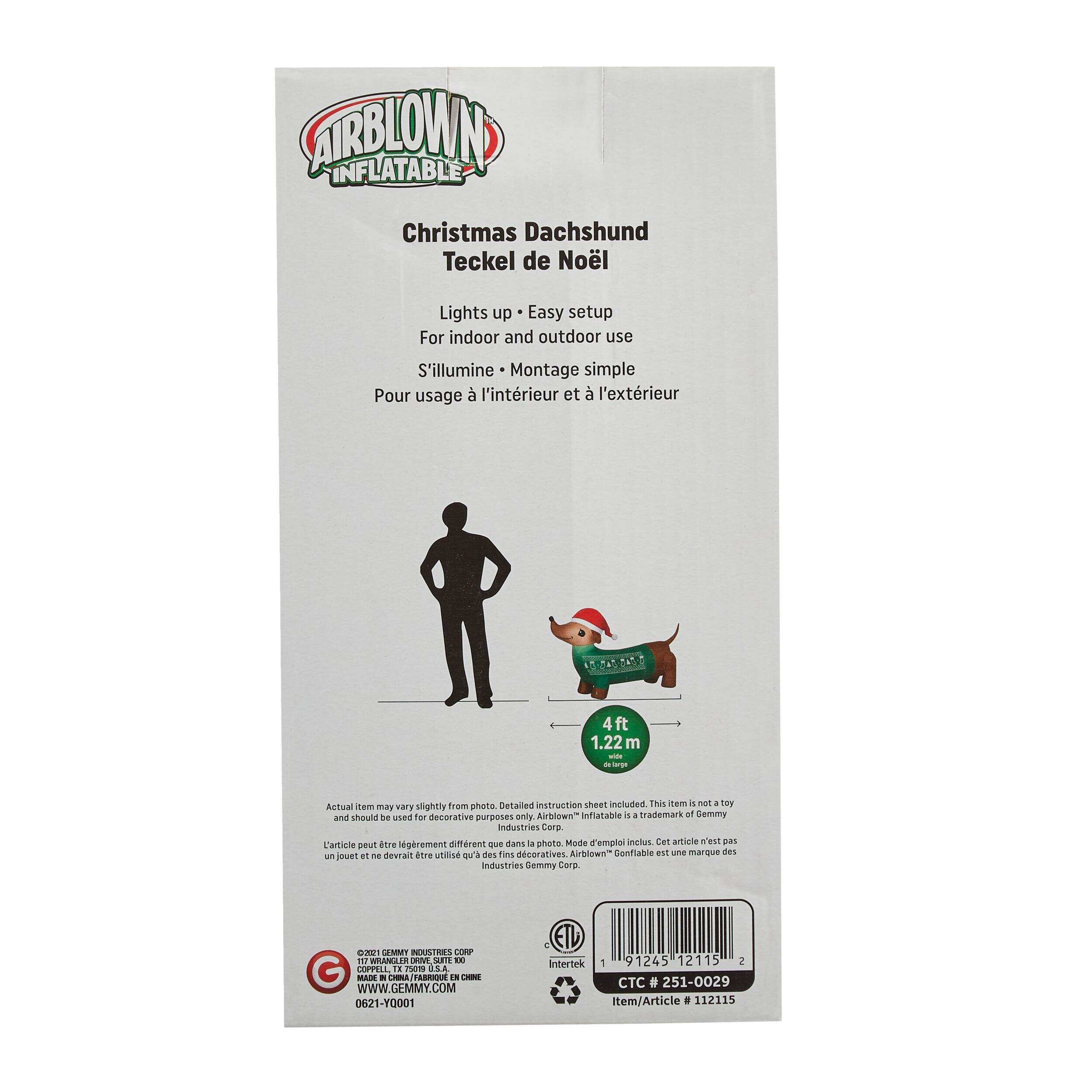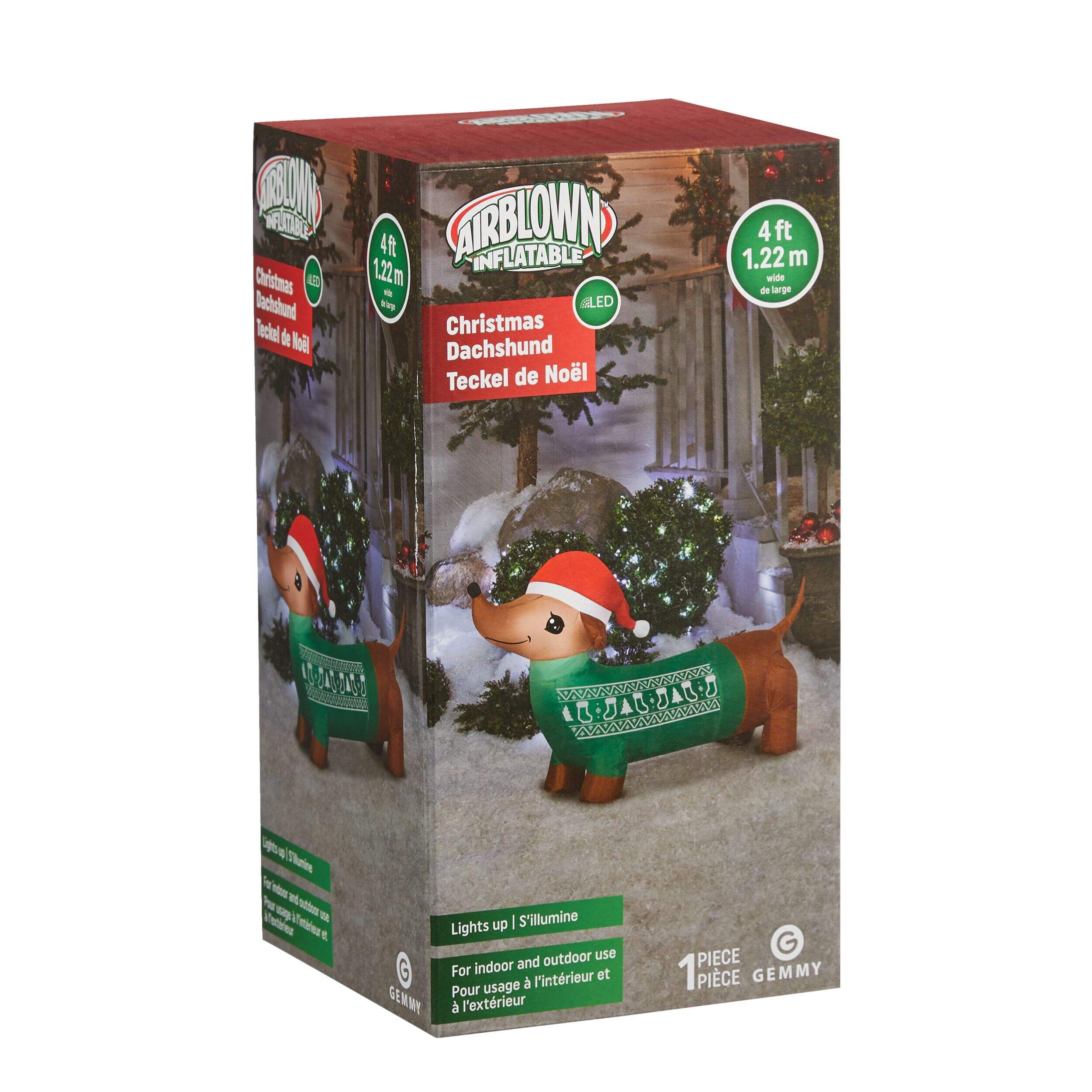 Add a playful flair to your outdoor holiday décor with the Gemmy Airblown® Inflatable Christmas Dachshund Dog. This delightful decoration inflates in seconds and features vibrant LED lights that brighten up your festive display. Simply plug it in for effortless setup! This charming inflatable is sure to bring joy and laughter to your holiday season. Pair it with Gemmy's other inflatables for a pawsitively awesome holiday scene!