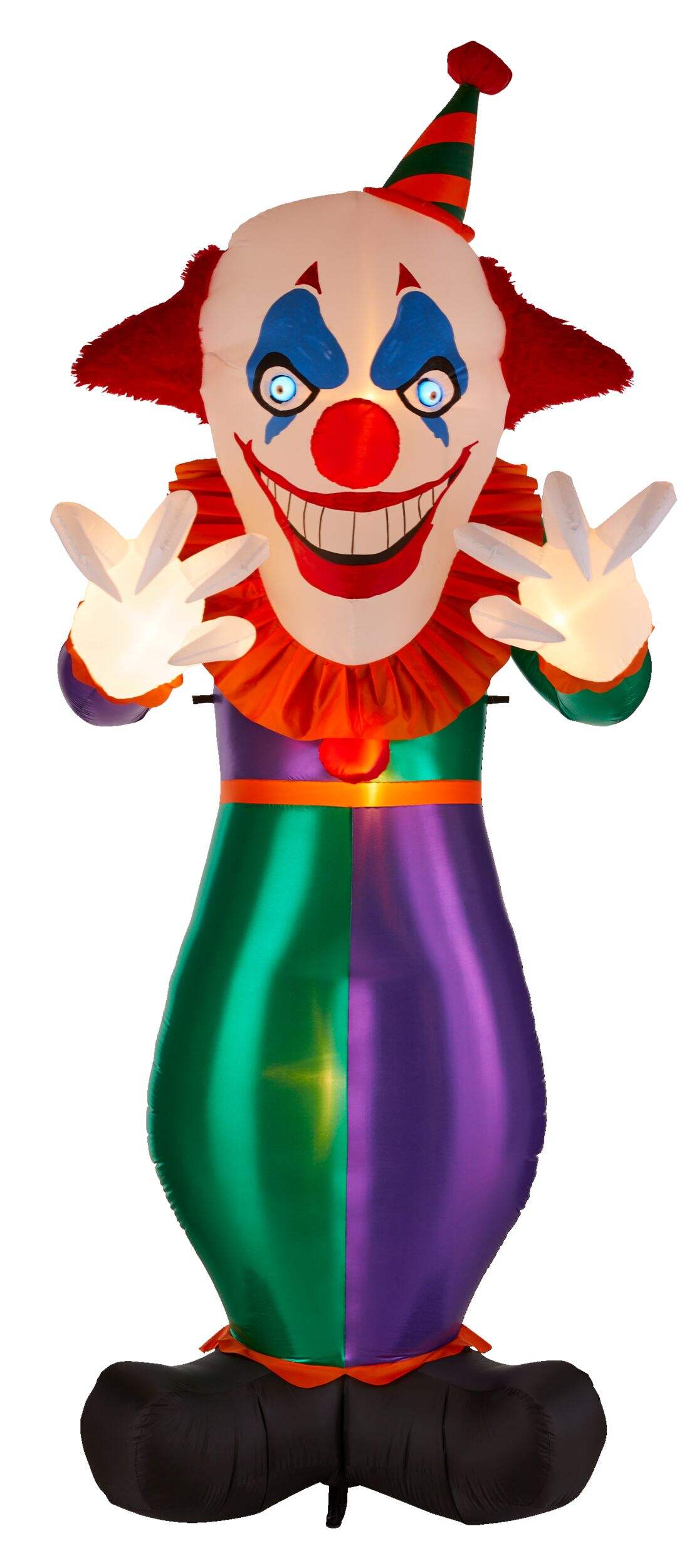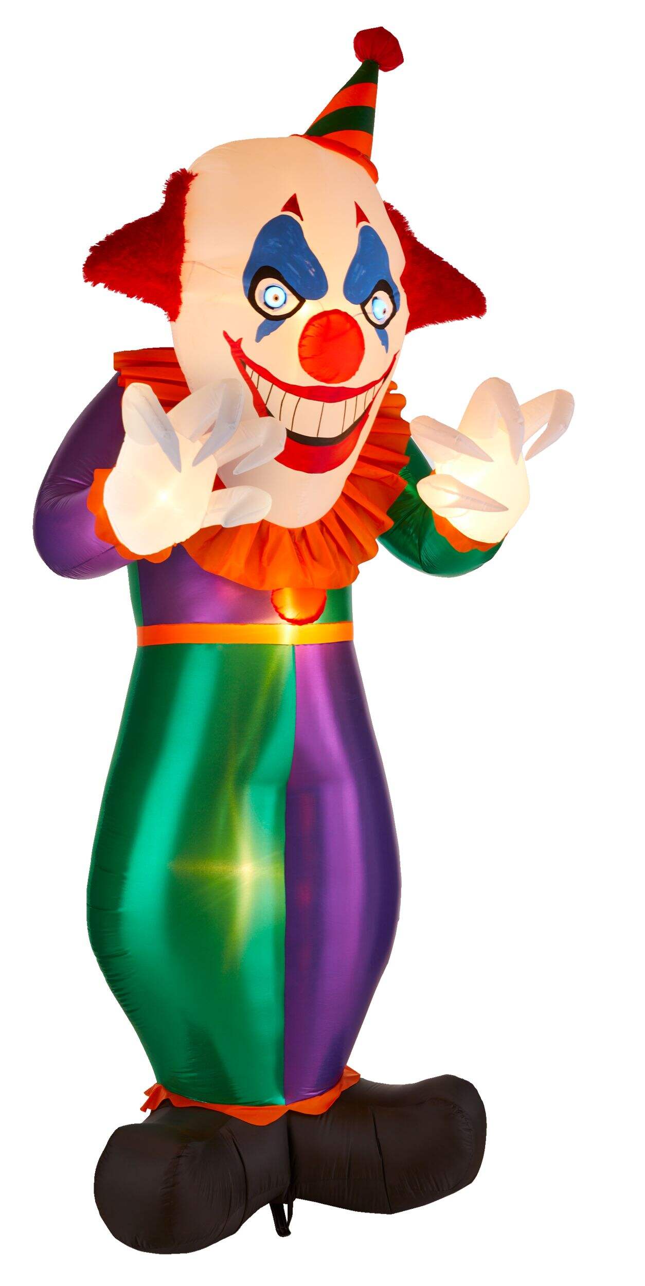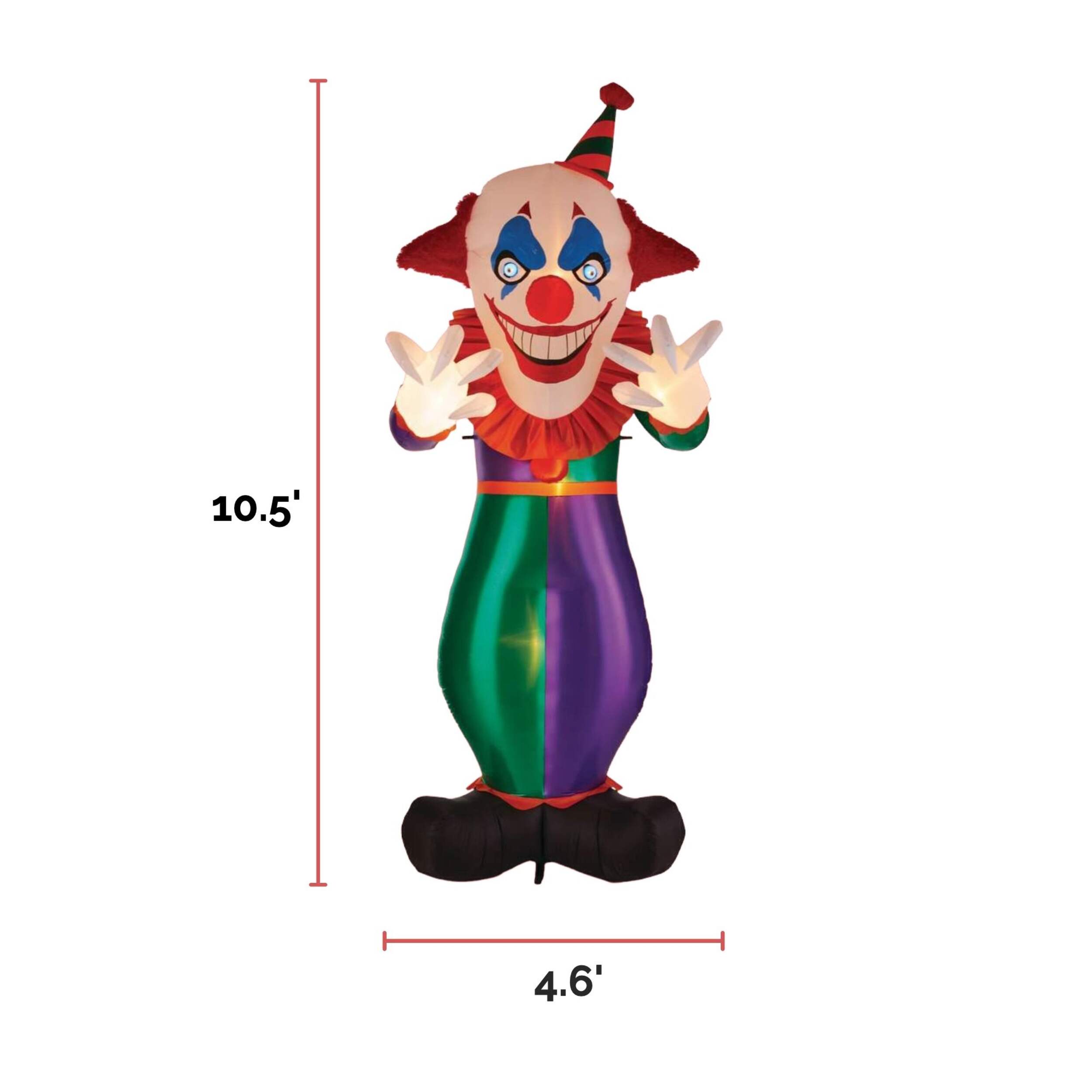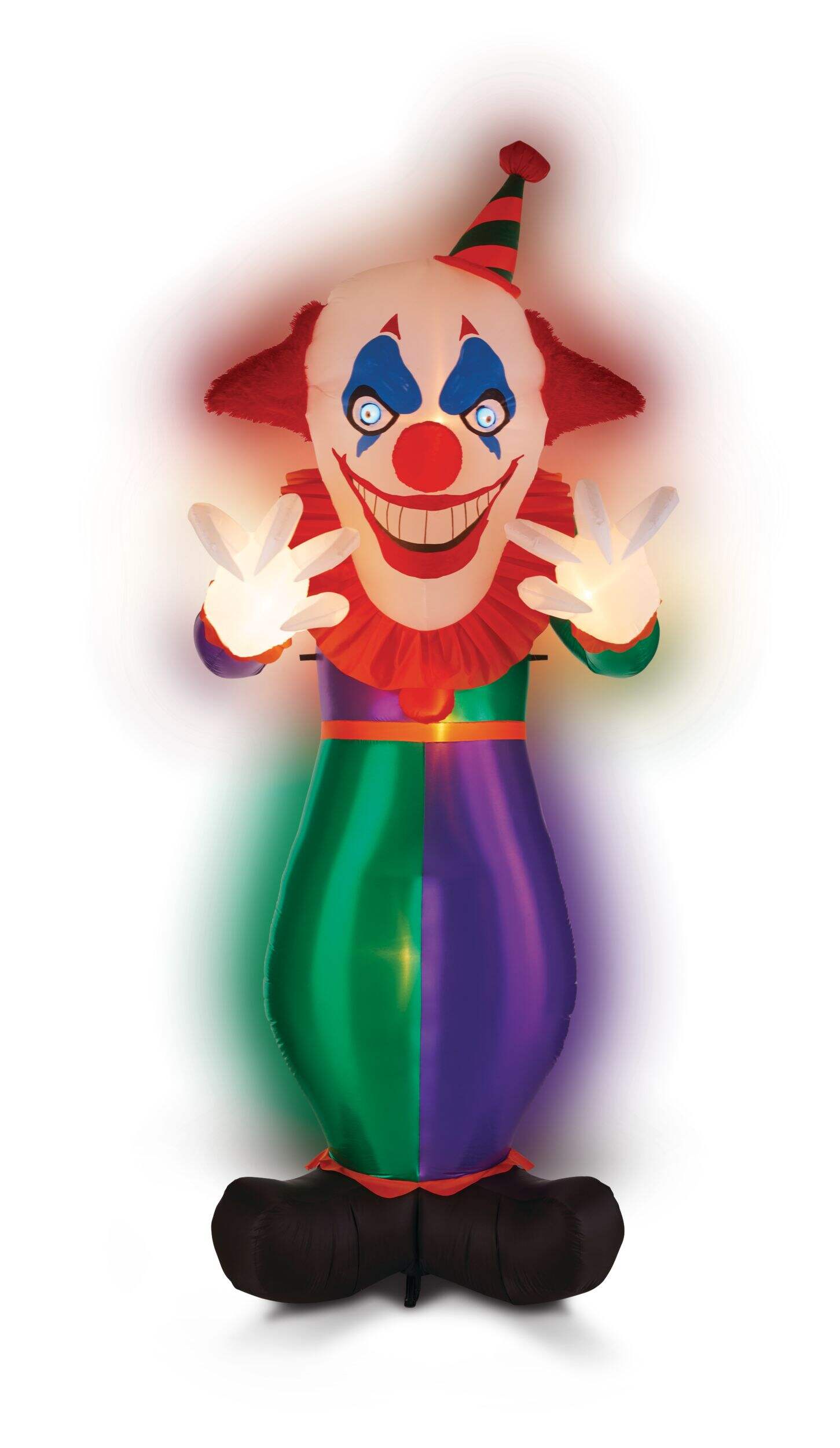 Make Halloween a frightful delight with the Gemmy Inflatable Clown decoration. This eerie and entertaining outdoor prop self-inflates in seconds and lights up to frighten trick-or-treaters. The multi-coloured clown features plastic, fabric and metal construction and includes stakes and tethers for securing it in your yard. Fun and easy to set up, this Halloween inflatable plugs into a standard electrical outlet for maintenance-free use.