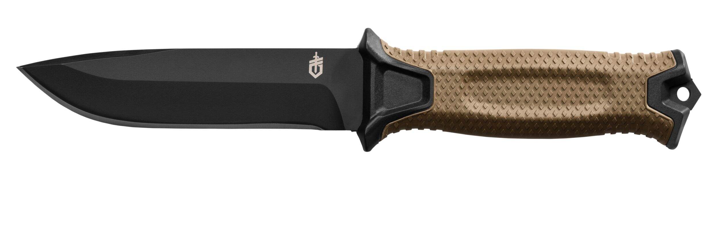 Gerber StrongArm Fixed Knife is equipped with a full tang, 420HC steel blade, striking pommel at the base, and rubberized diamond-texture grip