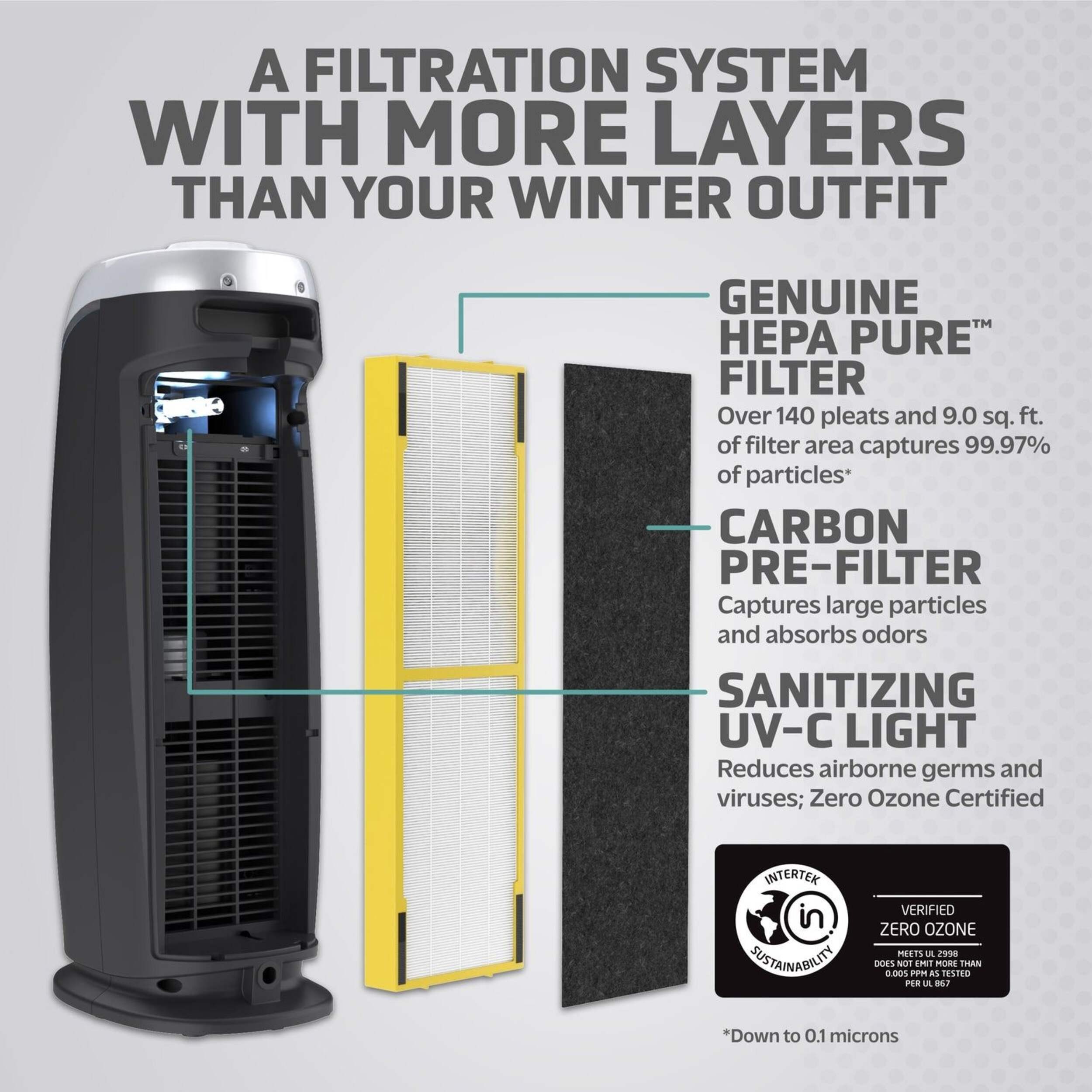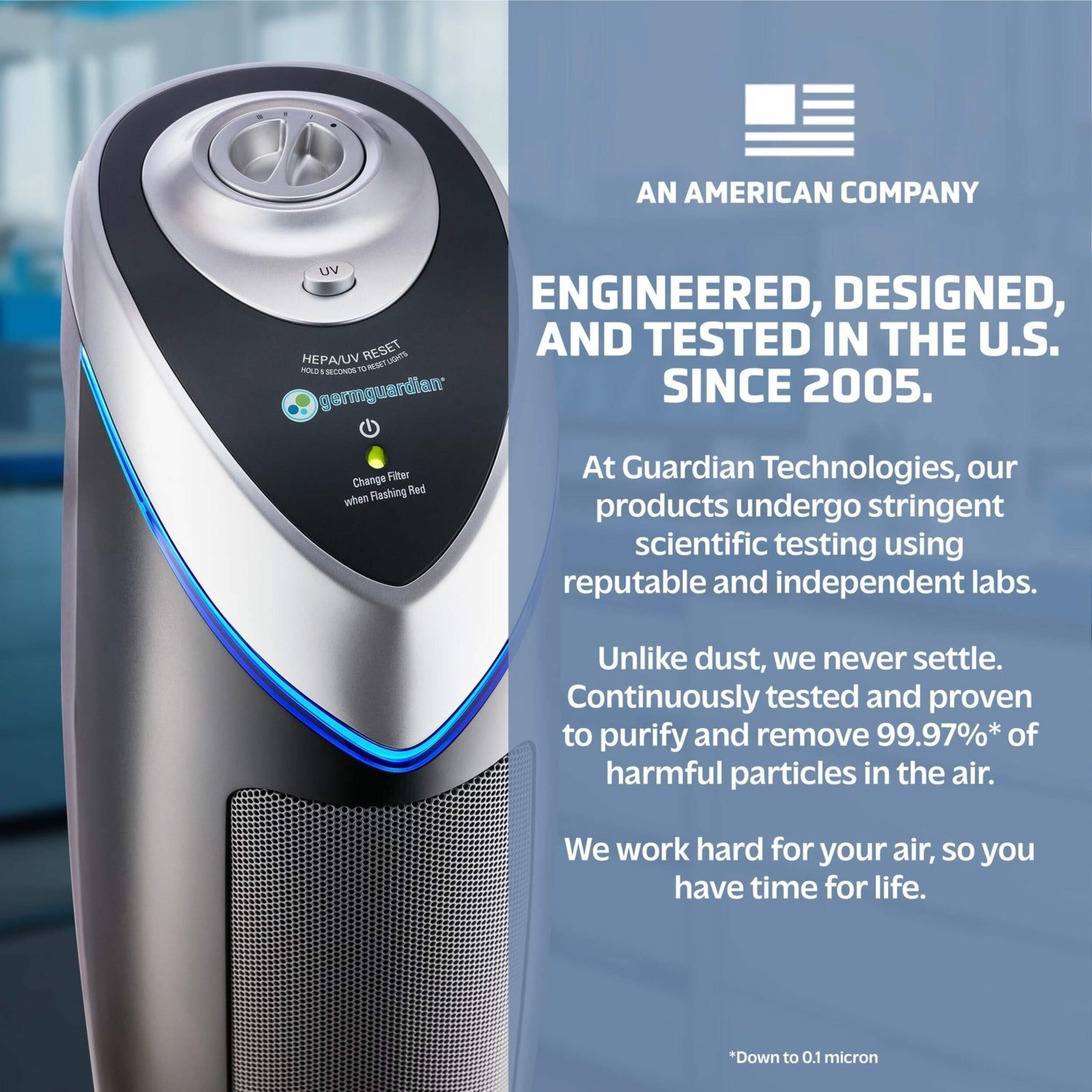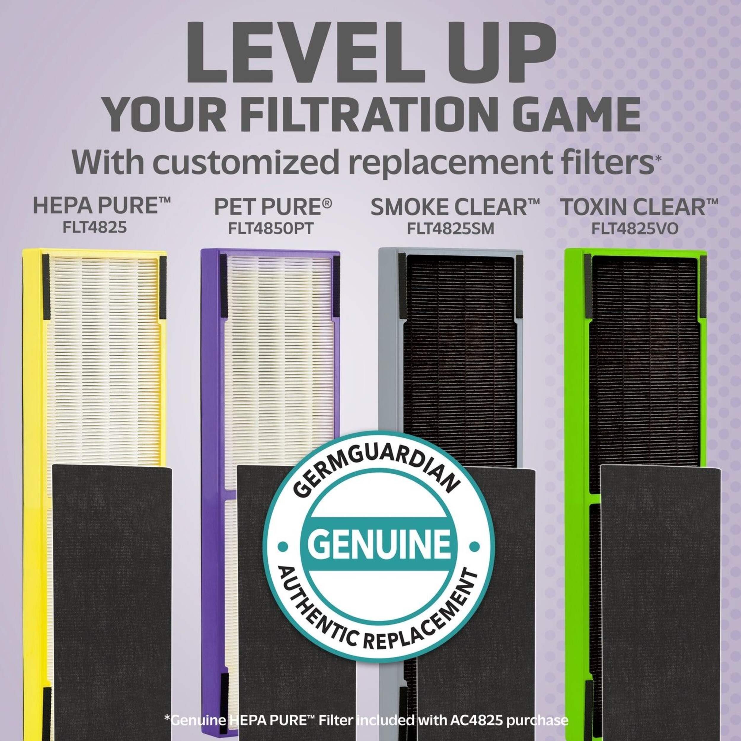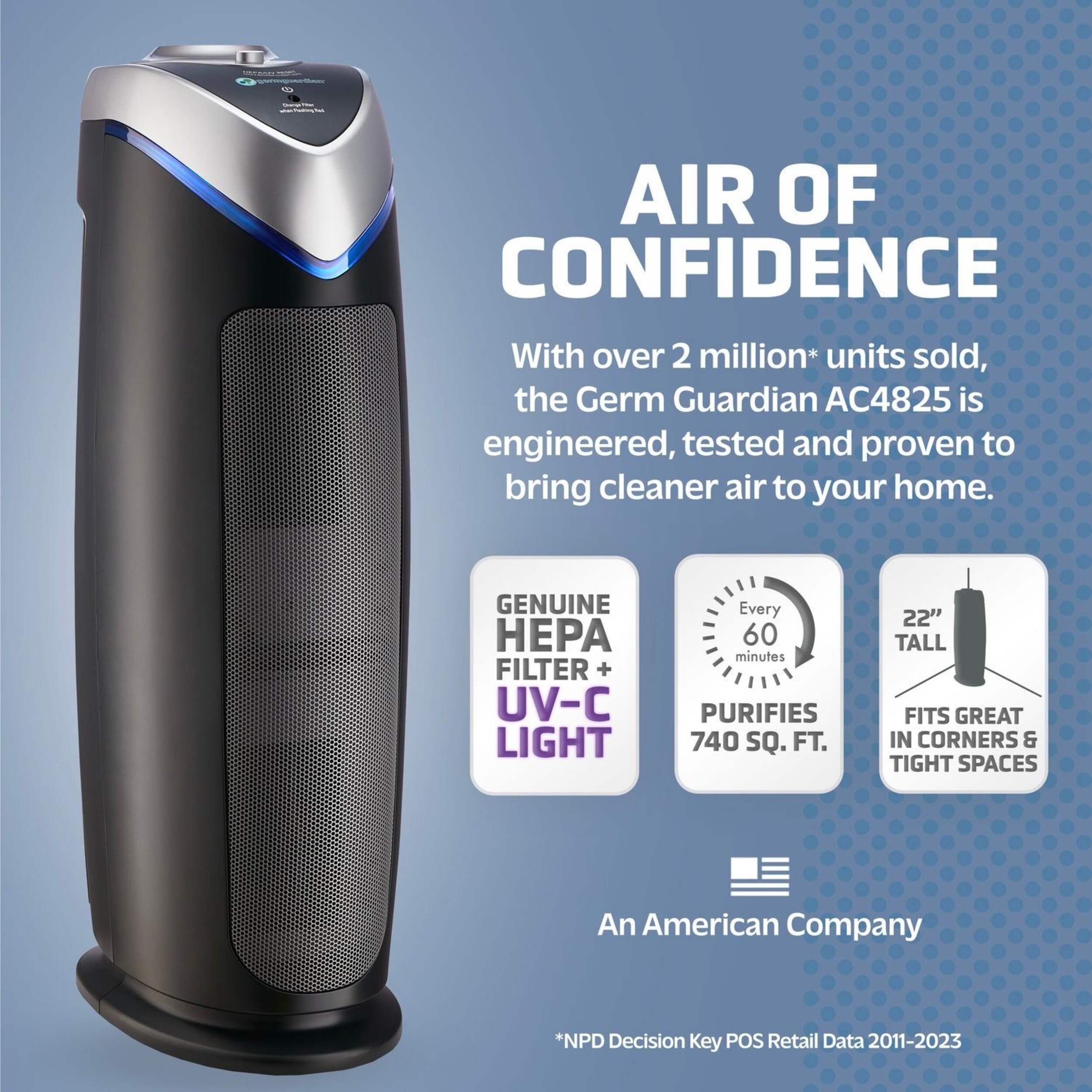The GermGuardian AC4825DLX 4-in-1 HEPA Filter UV-C Tower Air Purifier is designed to create a healthier home environment by effectively removing allergens, odours, and germs. Ideal for small to medium rooms, this air purifier features a True HEPA filter that captures up to 99.97% of airborne particles, including dust, pollen, and pet dander. The integrated UV-C light works with Titanium Dioxide to reduce airborne bacteria, viruses, and mould spores, providing added protection.