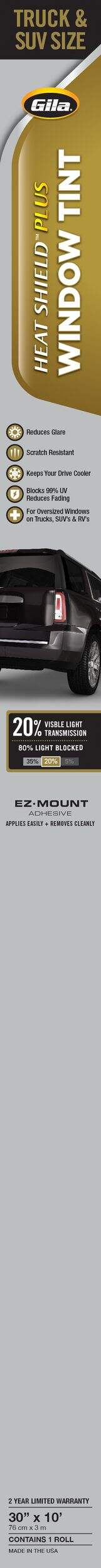 The Gila Heat Shield Plus Automotive Window Tint for SUVs and Trucks offers a perfect blend of style, performance, and protection. Designed specifically for larger vehicle windows, it supports an enhanced driving experience by improving comfort and reducing interior heat. Its durable, high-quality construction allows for reliable long-term use, helping you maintain a sleek, modern look while enhancing visibility on sunny days. With its advanced technology, this window tint not only protects your vehicle but also offers an easy-to-apply solution for those who prefer a DIY installation.