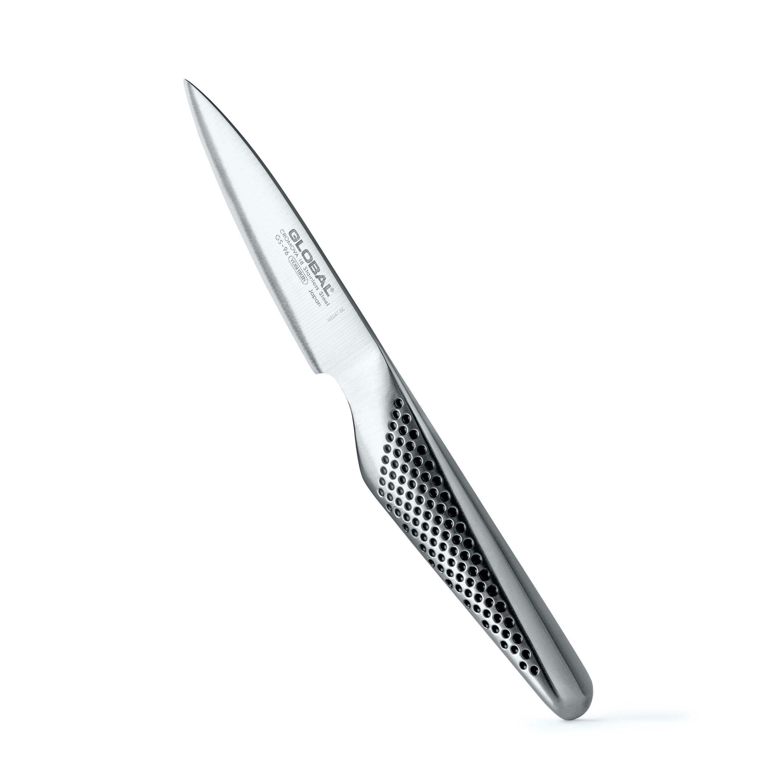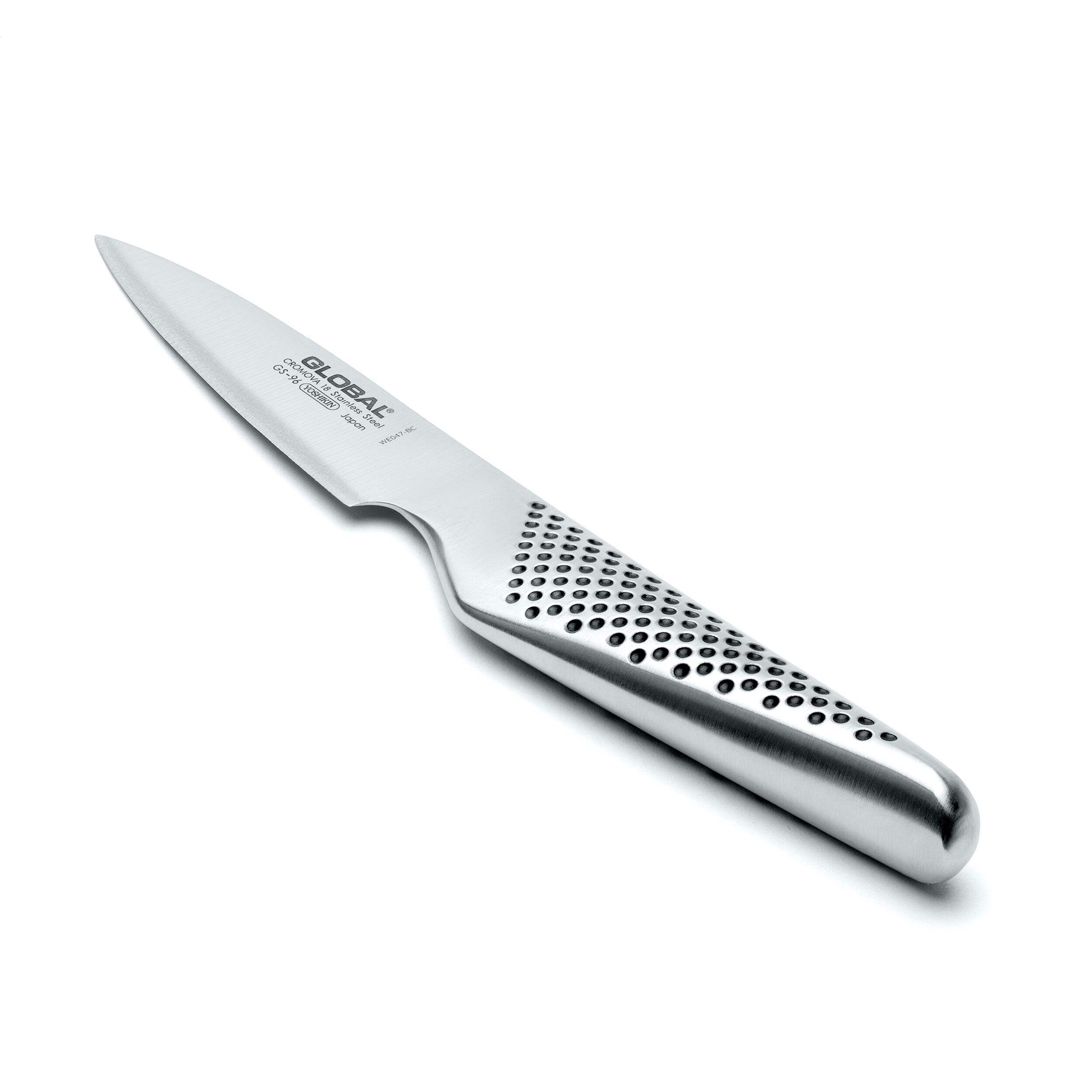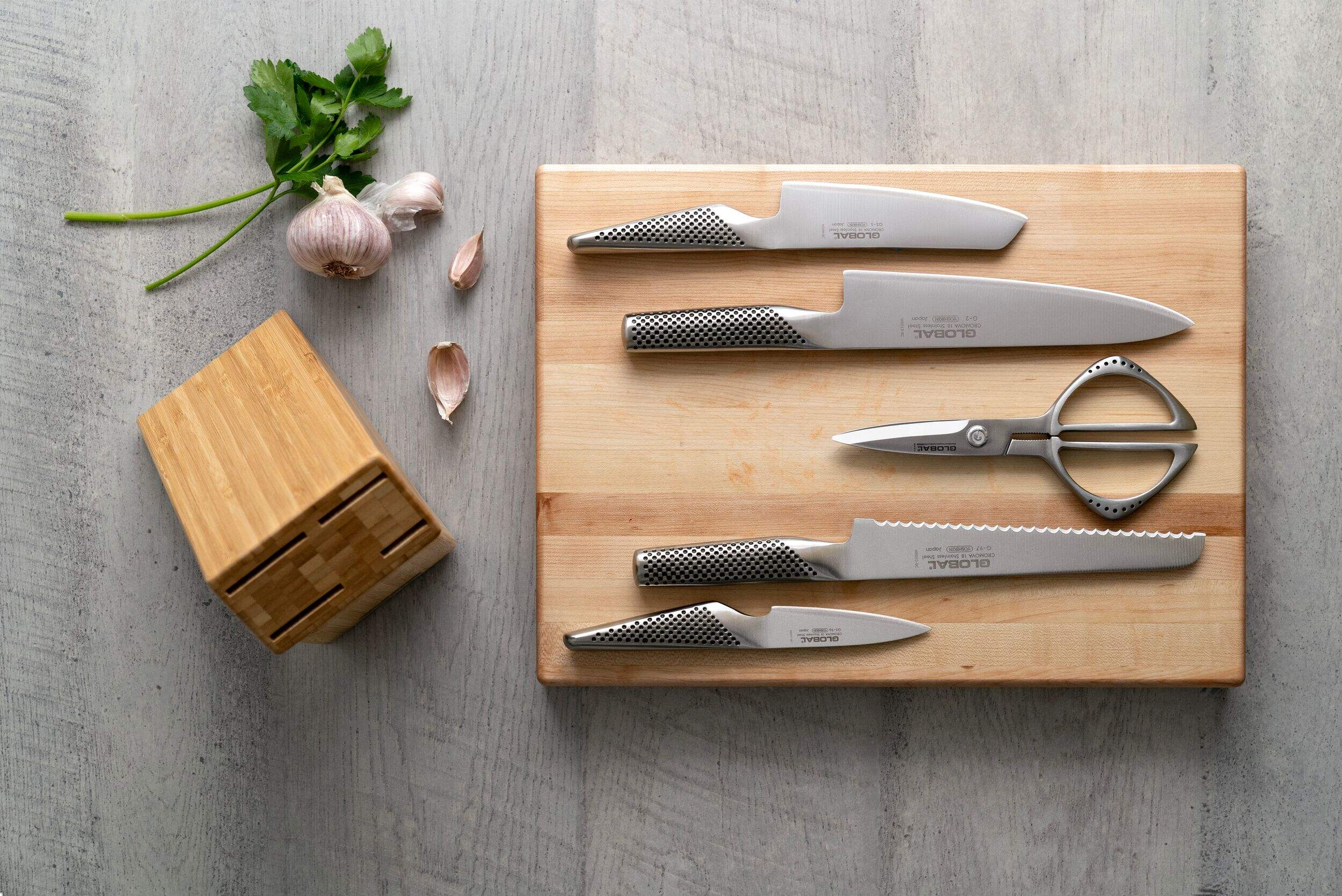 The Global Takashi Stainless Steel Knife & Bamboo Wood Block Set contains knives that are ground to a straight point rather than beveled, providing dramatically sharper blades that retain their edge for longer. The smooth, seamless construction of the knives all but eliminates food traps and results in superior hygiene.