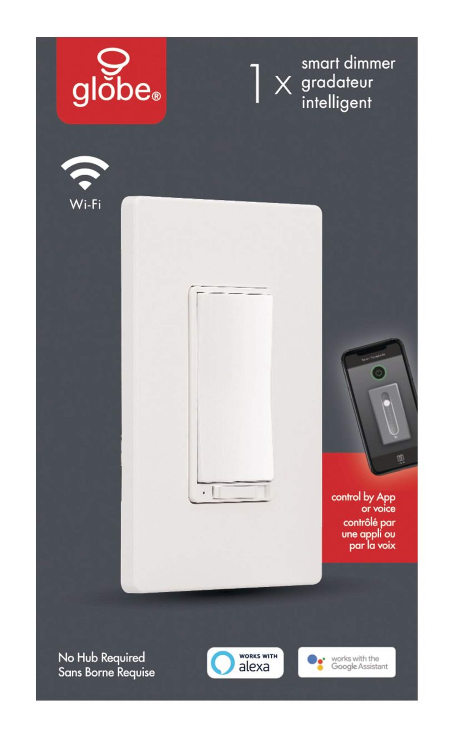 This smart dimmer switch from Globe lets you easily automate your home lighting from anywhere. Simply download the Globe Suite app, sync the smart dimmer and get started. Install the easy-to-use switch to control multiple recessed lights or a chandelier. The app allows you to set brightness levels and scenes to turn lights on or off together. Hands-free voice control is possible with Google Assistant, Amazon Alexa or Siri for truly dynamic, "smart" home lighting.