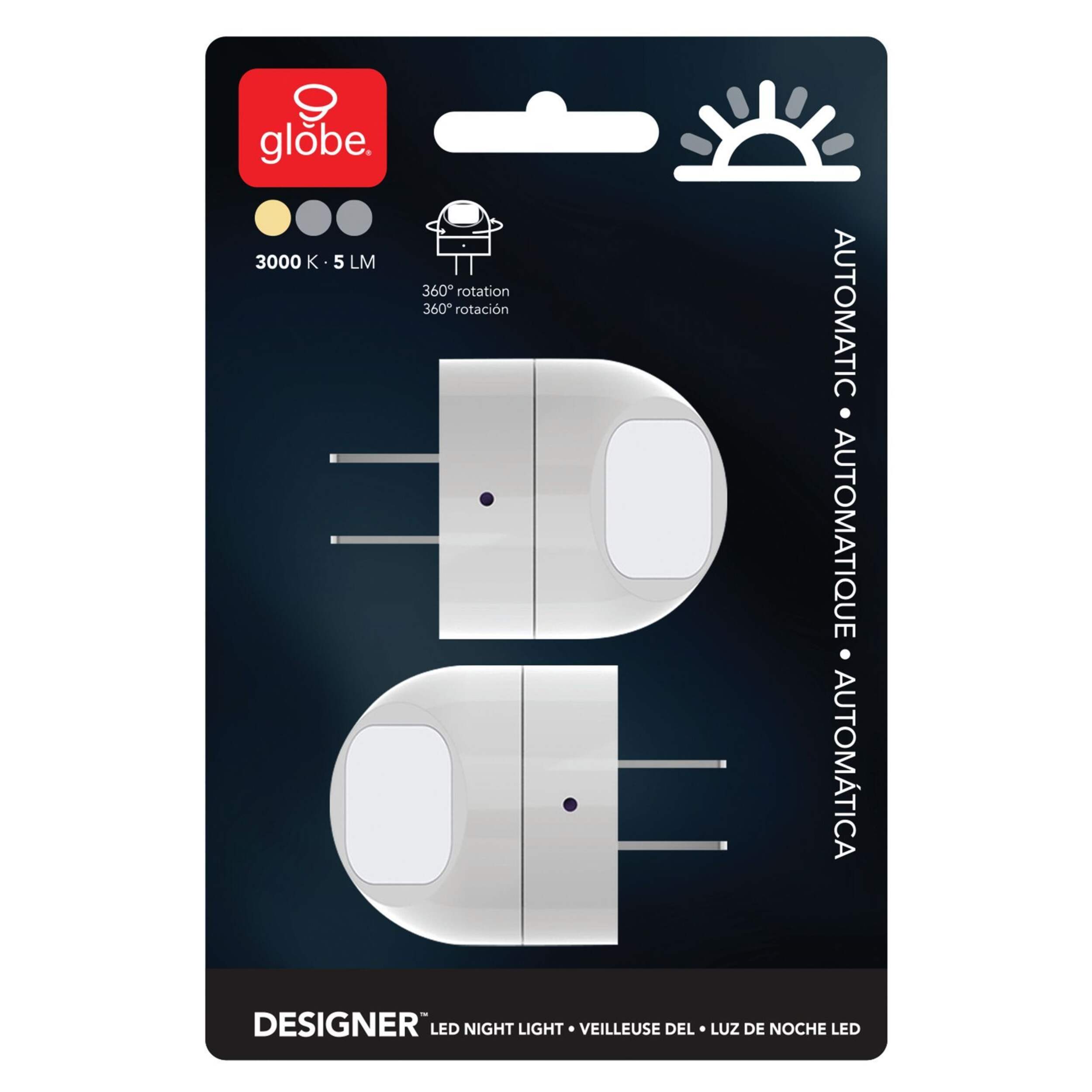 Globe Electric Guide Light LED Night Lights help guide you through the dark with their automatic dusk to dawn sensor technology. The two directional LED fixtures point light where you need it, coming on as the room gets dim and lasting through the night. The warm light creates a cozy atmosphere, while the sensitive photo sensor ensures the lights use minimal energy.