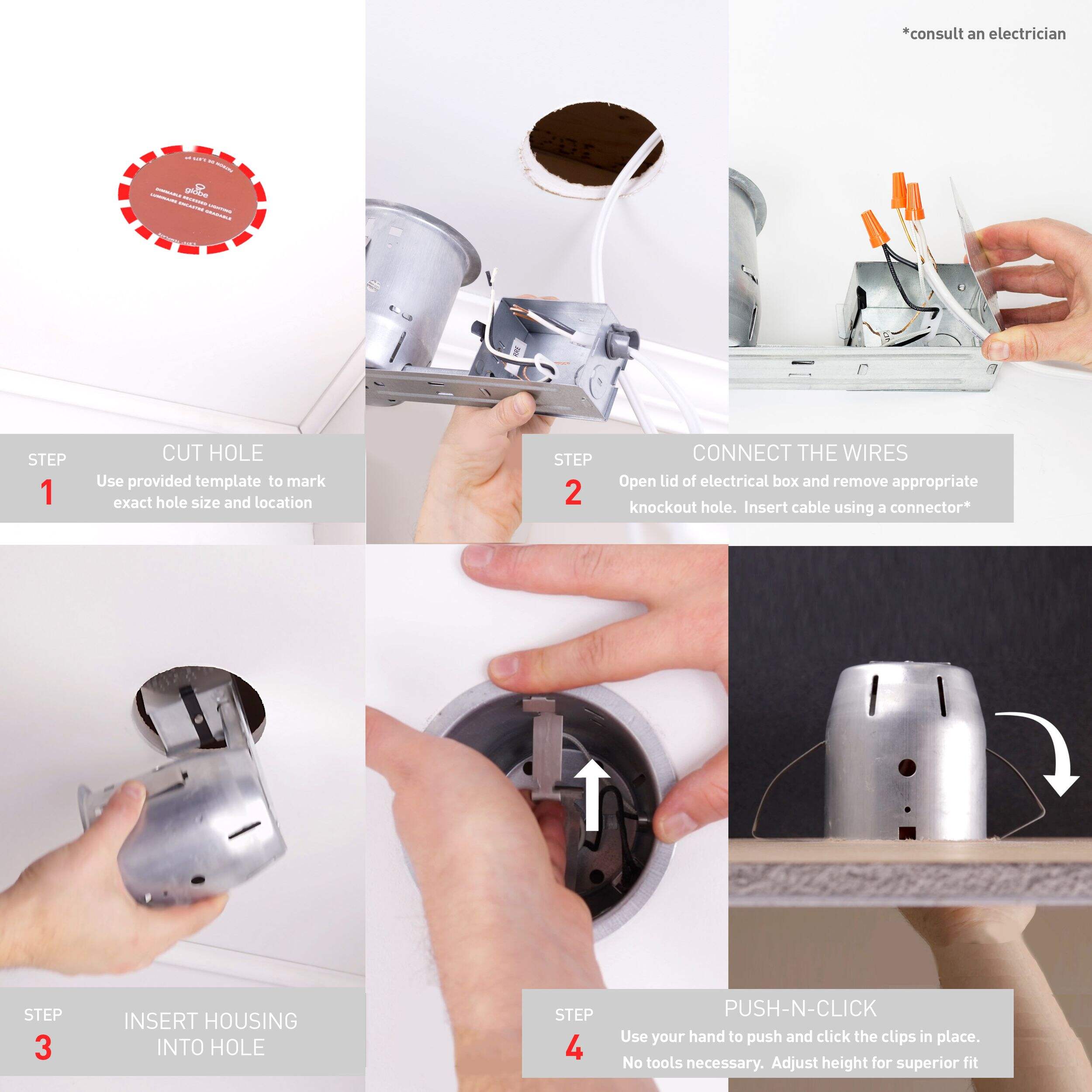 These ten recessed lights will shine up your home in brushed nickel style. Featuring PUSH-N-CLICK clips for tool-free installation onto uneven surfaces. swivel GU10 light bulbs let you focus light where you need it and an integrated cut-off switch prevents overheating. Works with dimmer switches sold separately. Buy 50-watt equivalent GU10 light bulbs separately. Cut a 3.88 inch hole for easy installation.