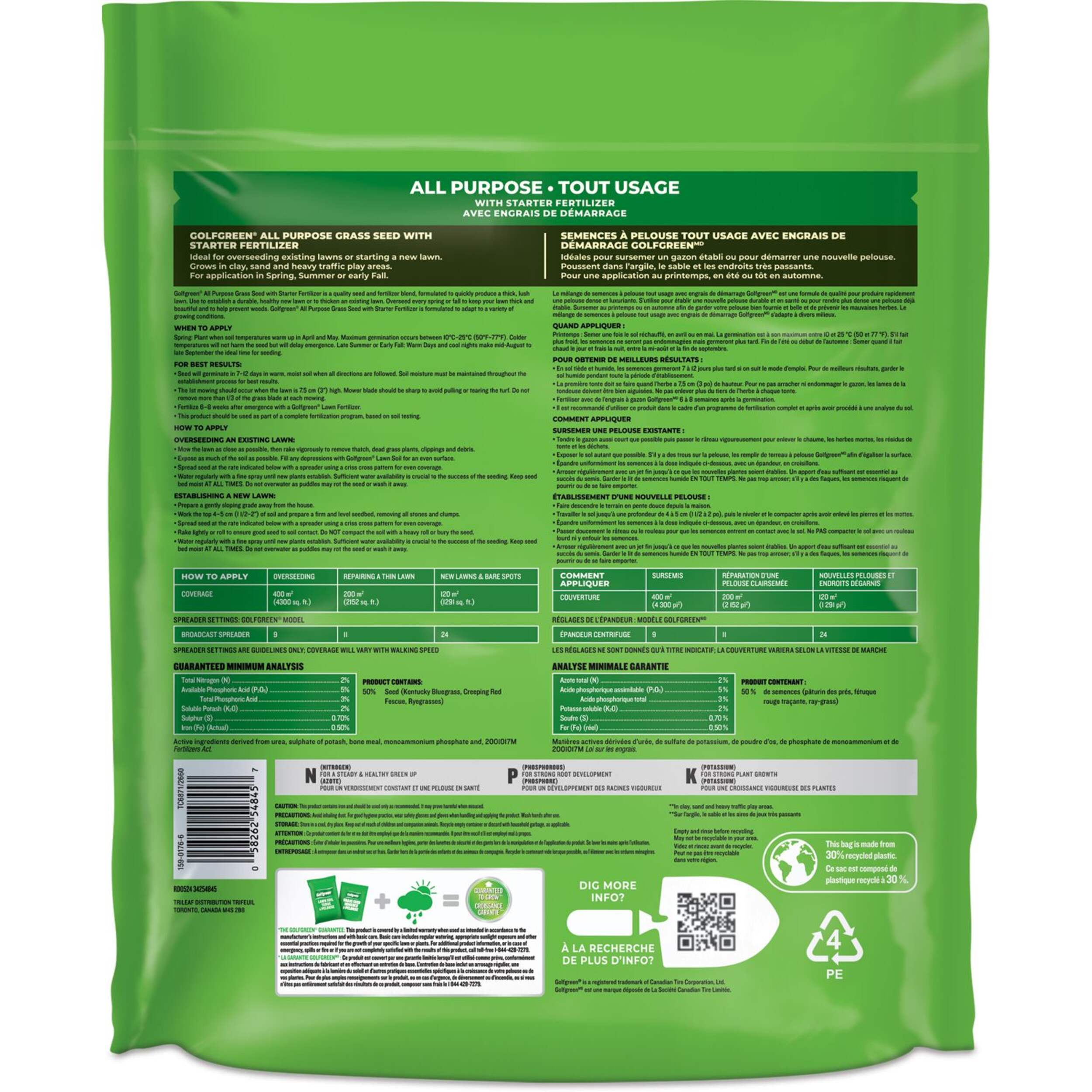 The Golfgreen All Purpose Grass Seed is ideal for over seeding existing lawns or starting a durable, healthy new lawn. This all purpose grass seed is a quality seed blend formulated to quickly produce a lush lawn in sunny or moderately shaded areas. Use this grass seed every spring or fall to keep your lawn thick and beautiful. The Golfgreen All Purpose Grass Seed adapts to a variety of growing conditions including clay, sand, play areas and heavy traffic areas. Proudly made in Canada.