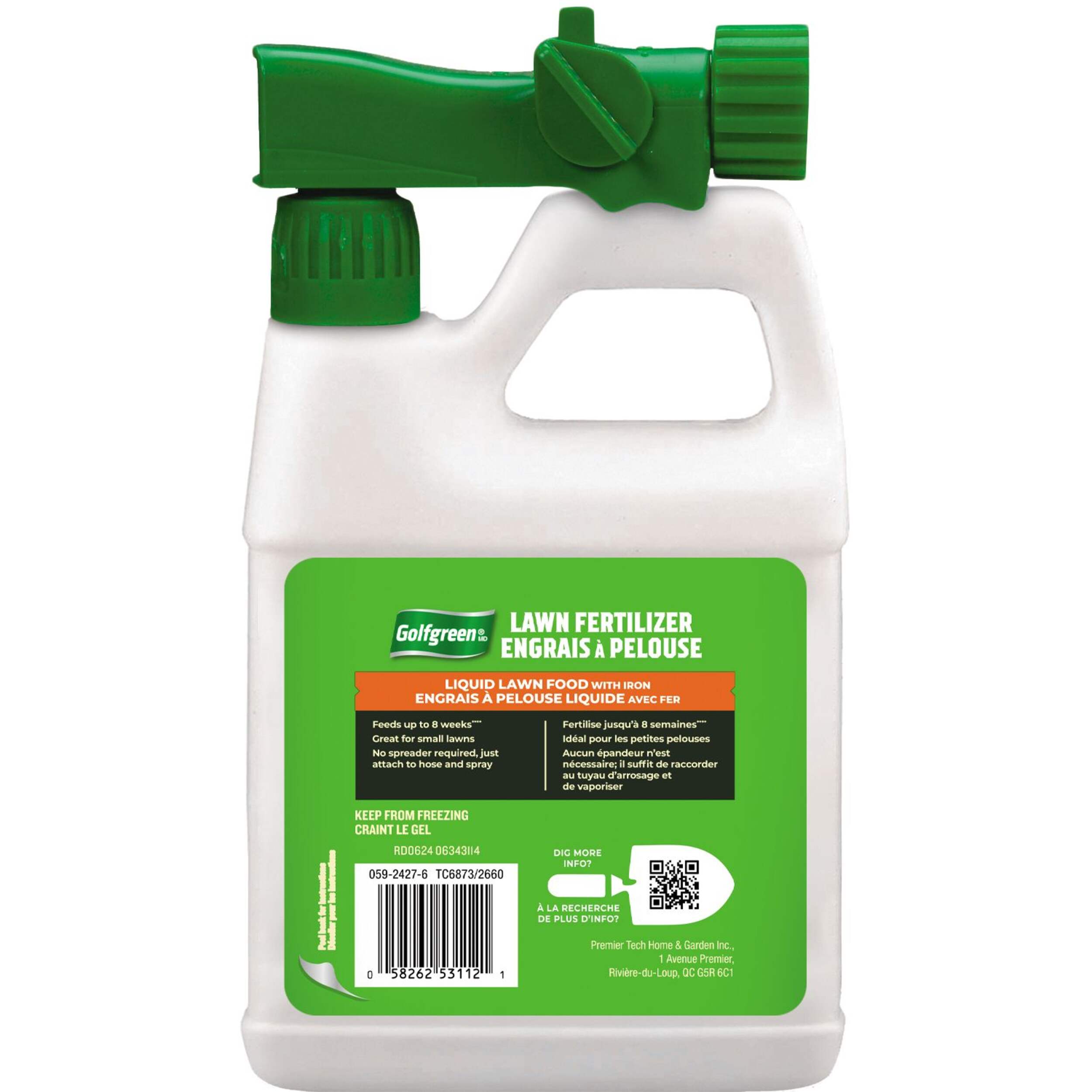 The Golfgreen Liquid Lawn Fertilizer is a concentrated formula with 0.25% iron to prepare your lawn for winter. This fast-acting liquid lawn fertilizer is created from a blend of nitrogen, phosphorous and potassium (NPK). The liquid lawn fertilizer slowly releases 40% of total nitrogen so that the grass stays greener for longer. The fertilizer is easy to use and simply needs to be attached to the hose before spraying on your lawn or turf. Proudly made in Canada.