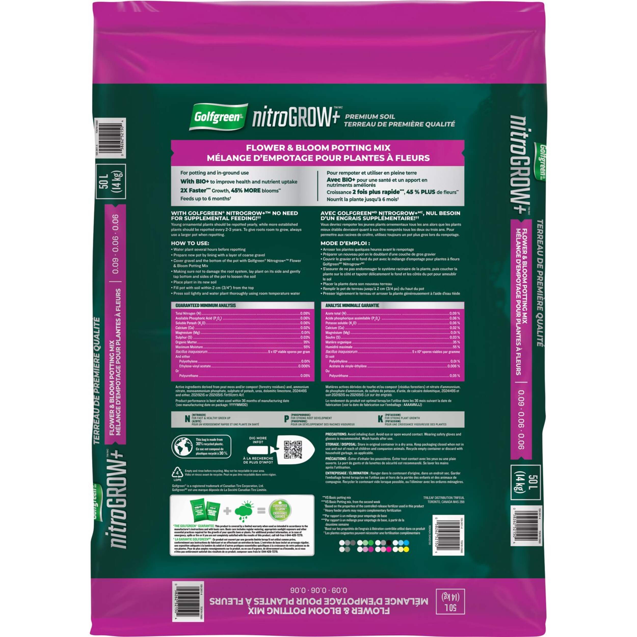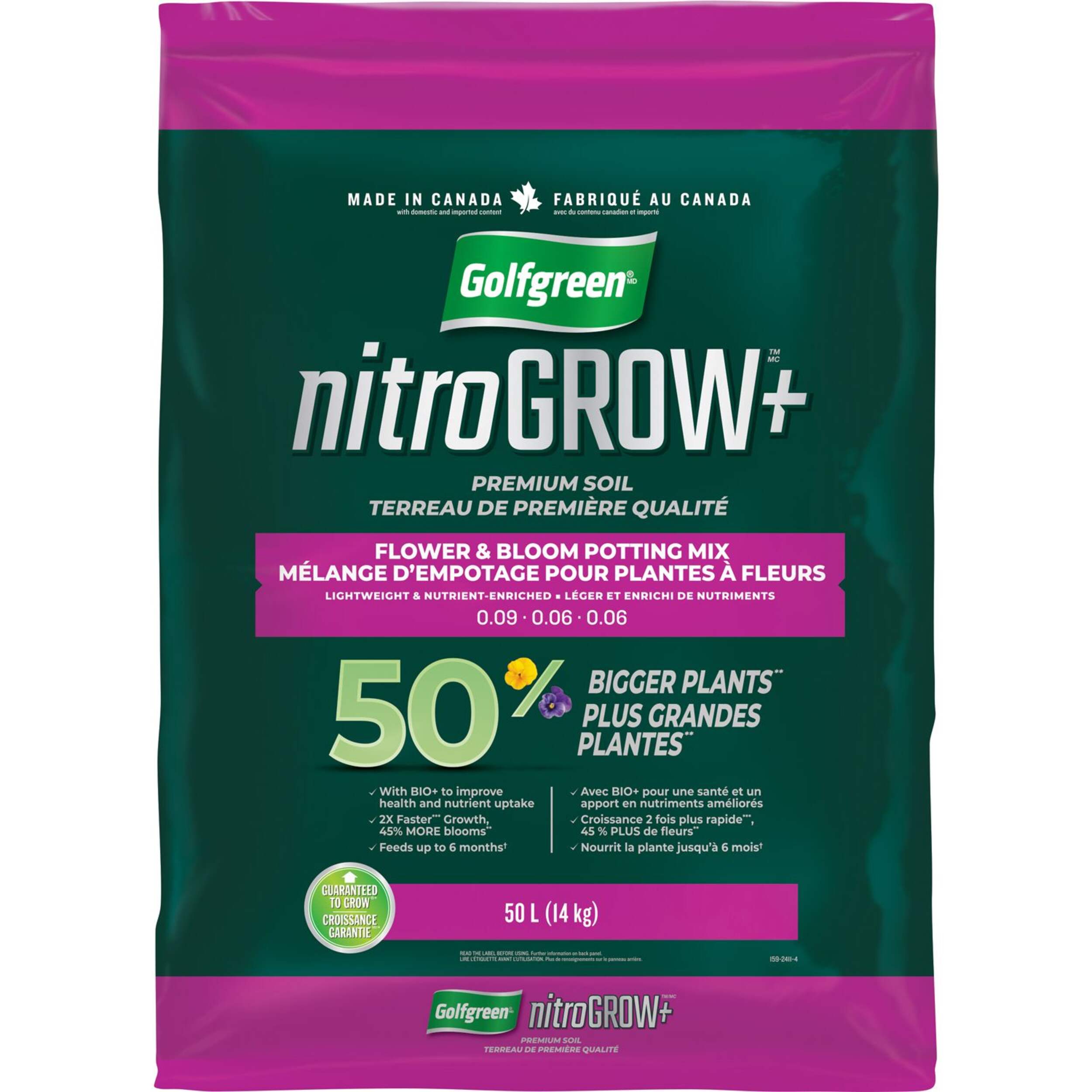 The Golfgreen Nitrogrow+ Flower & Bloom Potting Mix is a lightweight nutrient enriched blend of organic matter, perlite and fertilizer for big beautiful flowers.. Formulated with BIO+ to improve overall health and nutrient uptake promoting 50% bigger plants and 45% more blooms. This all-in-one mix is ideal for potting and in-ground use feeding up to 6 months.