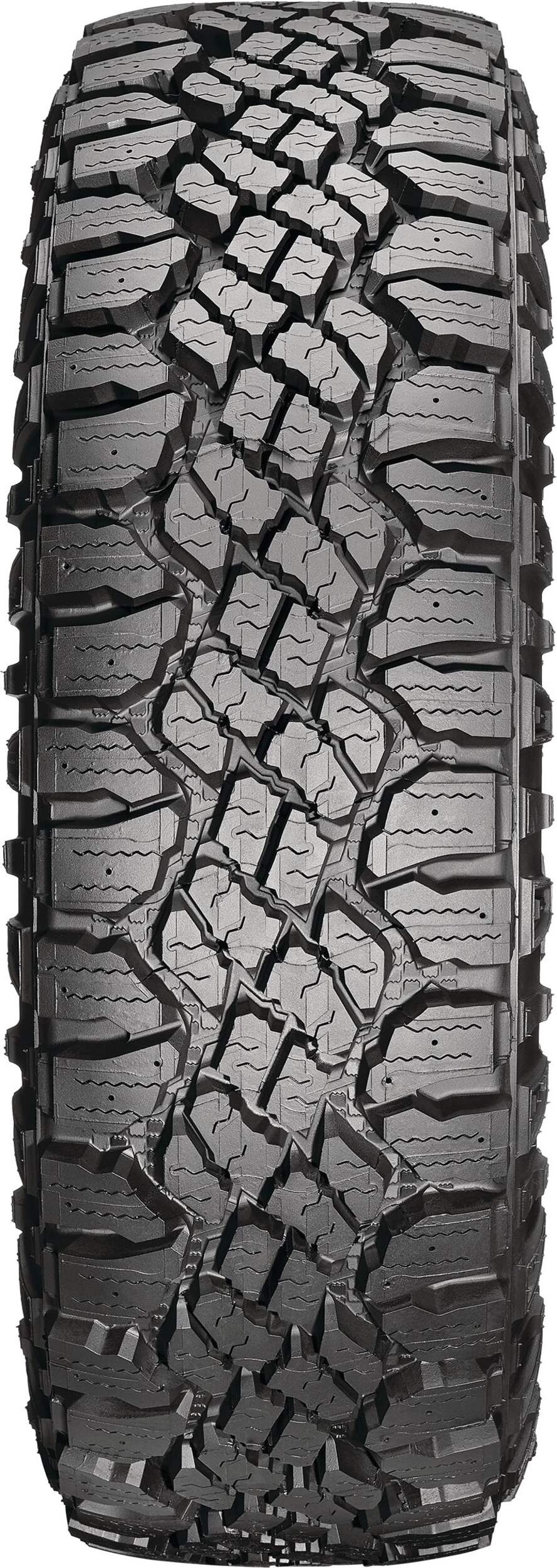 The Goodyear Wrangler DuraTrac® All Terrain Tire is designed to tackle the elements. With superior off-road handling in dirt, gravel and mud, and smooth on-road handling in wet, dry and wintry road conditions, this is the performance tire you want on your truck or SUV. This Goodyear tire offers endless versatility and durability for long stretches on the highway, challenging landscapes and gritty off-road trails thanks to TractiveGroove Technology™ for enhanced traction. Self-cleaning shoulder blocks clear the tread of debris for even more traction control.